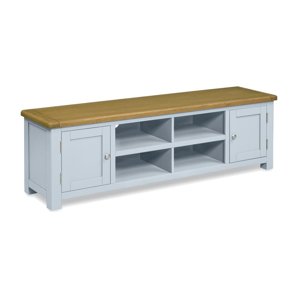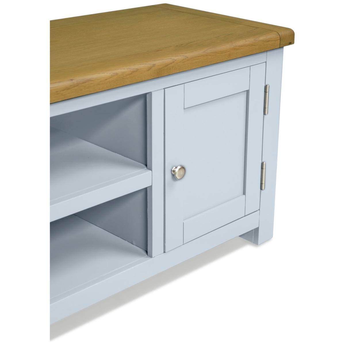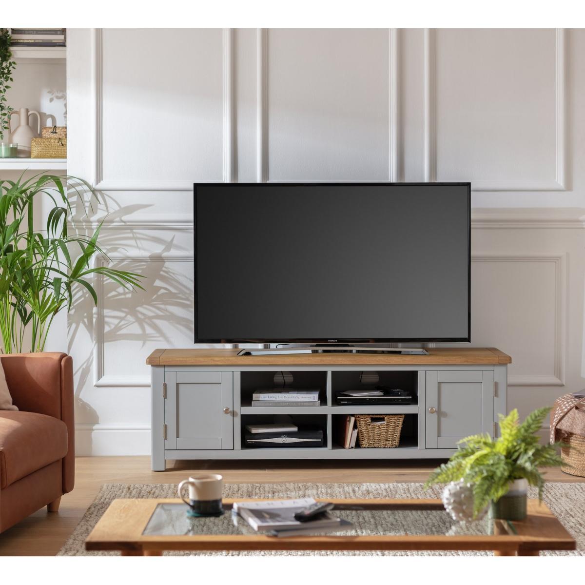 View your screen not your cables. Our wonderfully wide, Kent TV cabinet keeps wires and clutter hidden. Leaving you with a high tech screen, on a fine, classic light grey-styled unit. It's all you need to house the home cinema and game centre. That's entertainment.