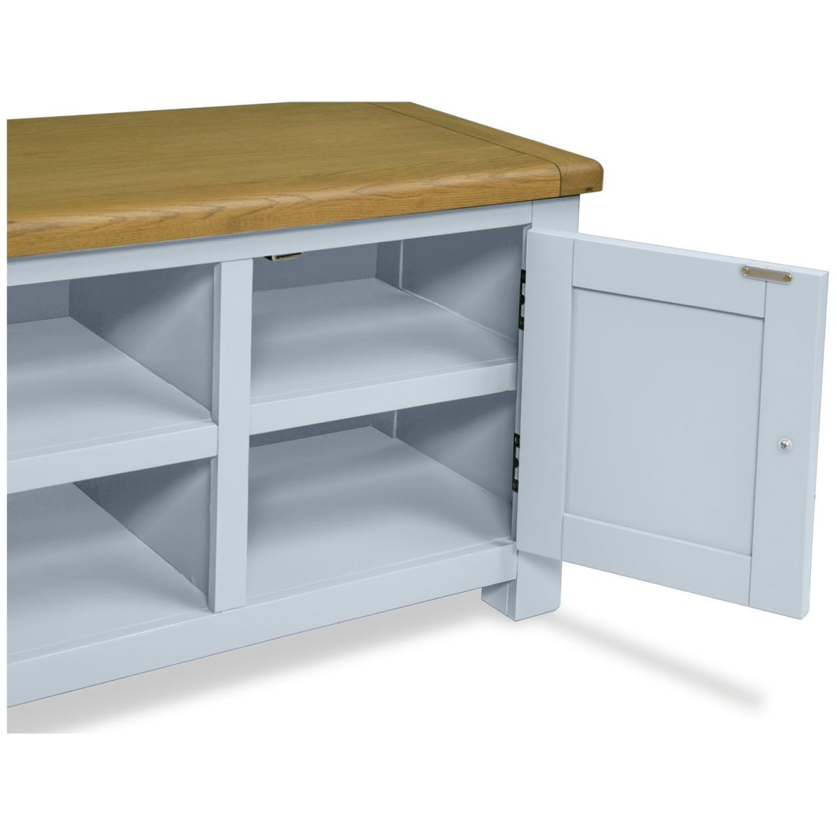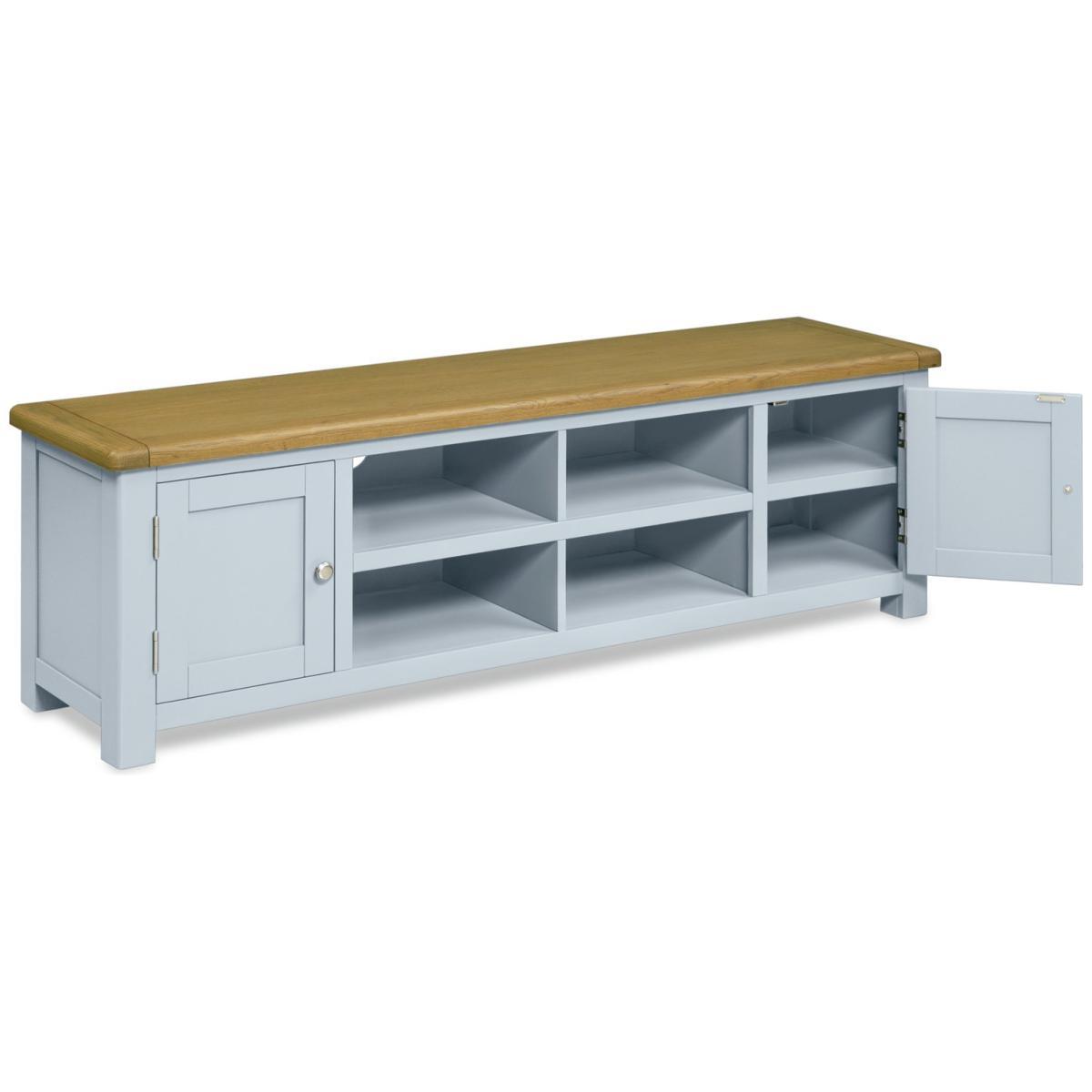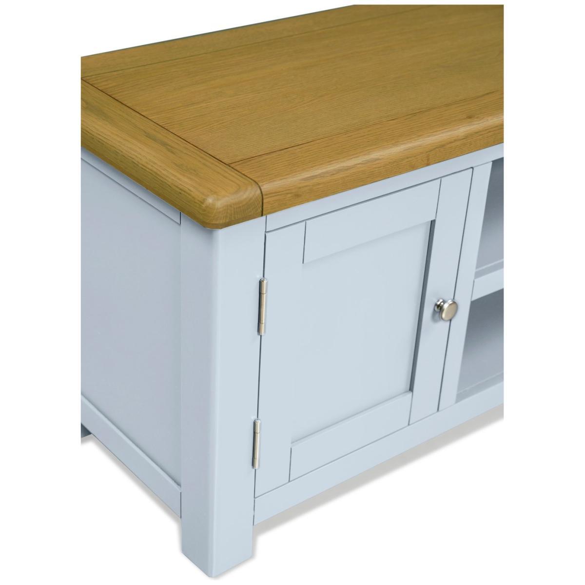 View your screen not your cables. Our wonderfully wide, Kent TV cabinet keeps wires and clutter hidden. Leaving you with a high tech screen, on a fine, classic light grey-styled unit. It's all you need to house the home cinema and game centre. That's entertainment.