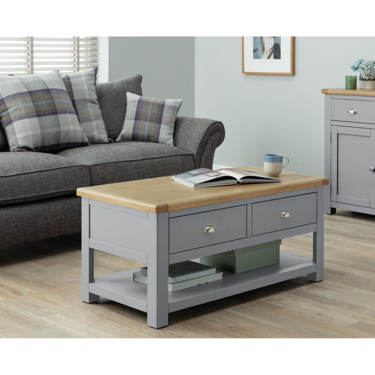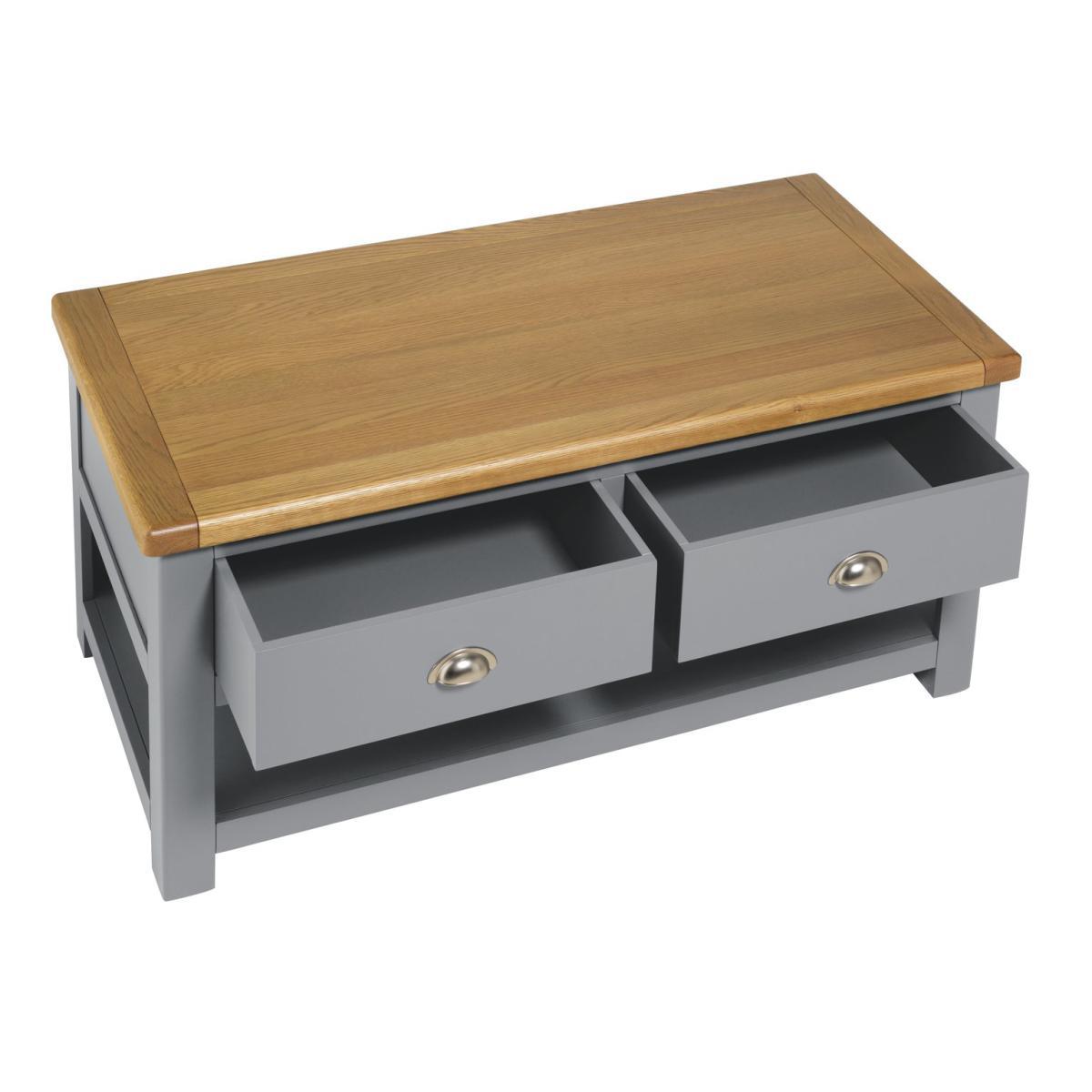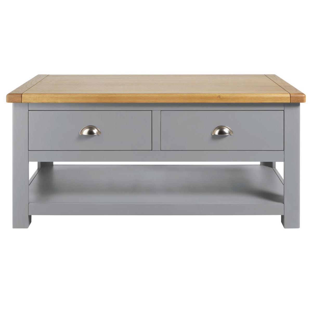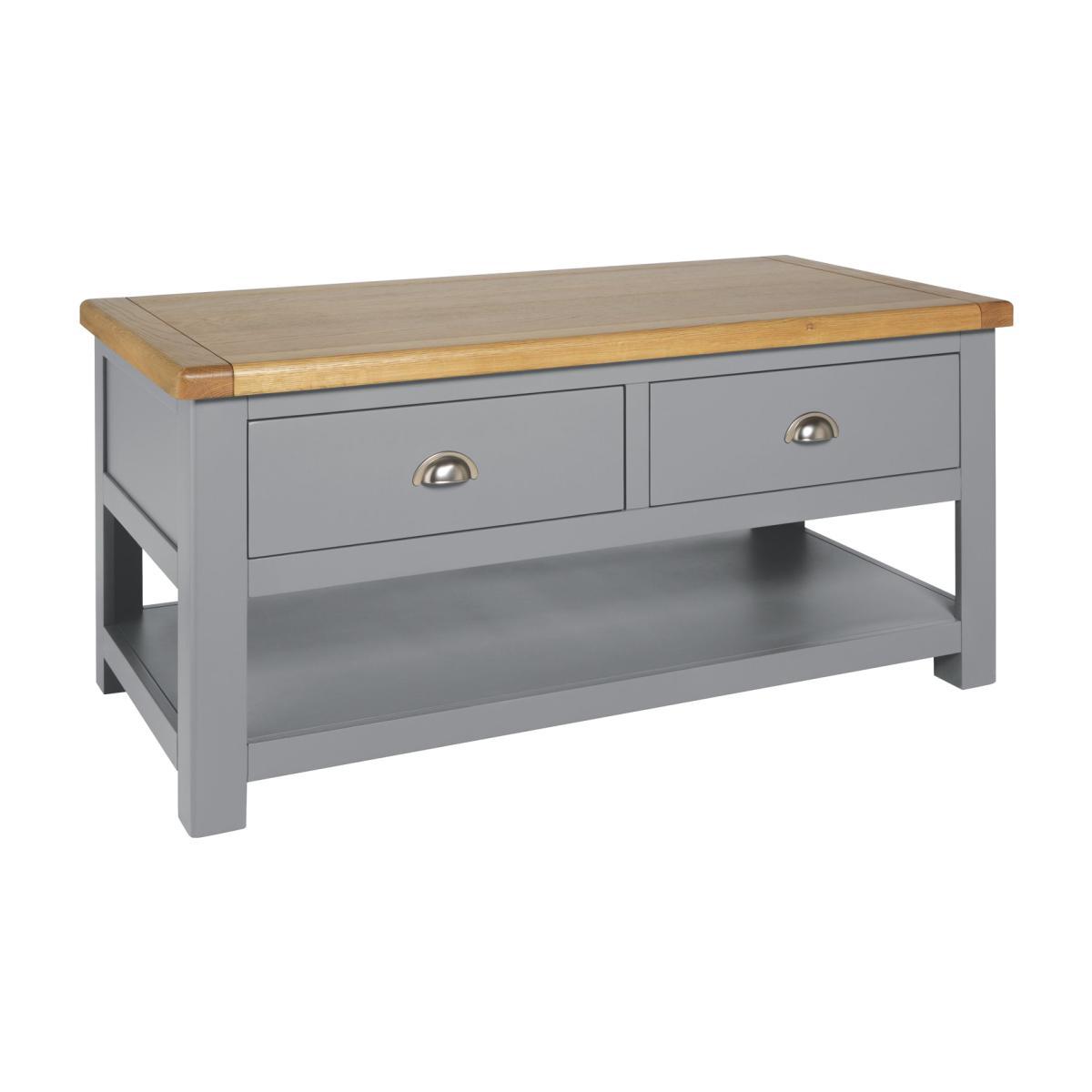 Gather round. It's time to put your feet up. This coffee table will keep everything you need close to hand, so you can snuggle into the sofa. With two drawers and a shelf underneath, it has plenty of storage space. The drawers can be opened from both sides, so you can all access the remote. That's neat! This is a timeless piece, finished in warm grey with a natural wood top. Rounded edges complete the classic country look. Put the kettle on!