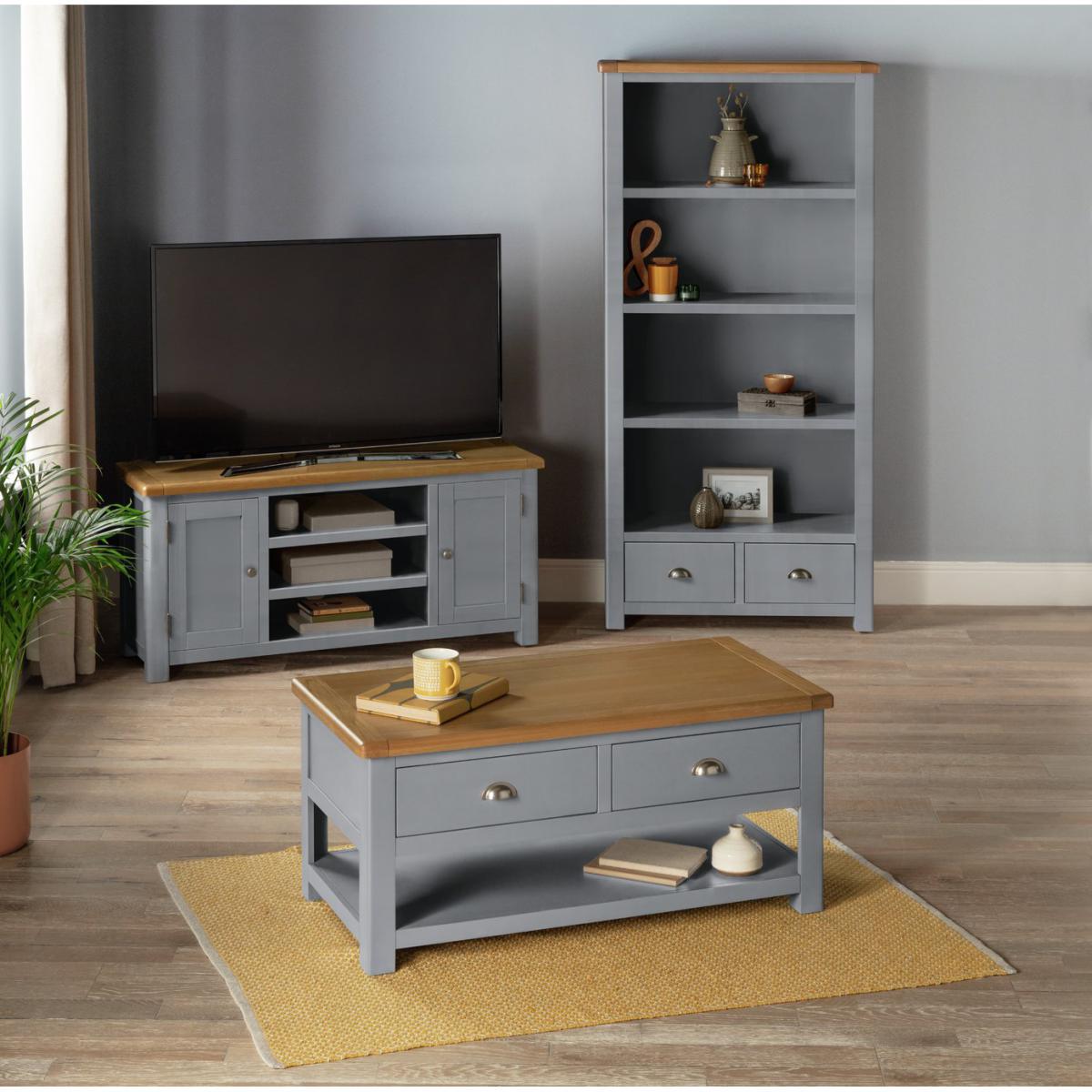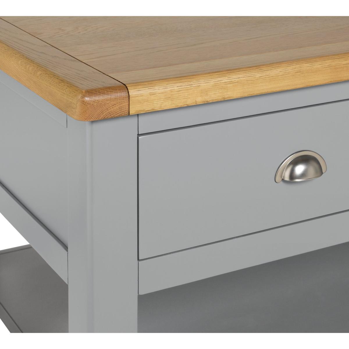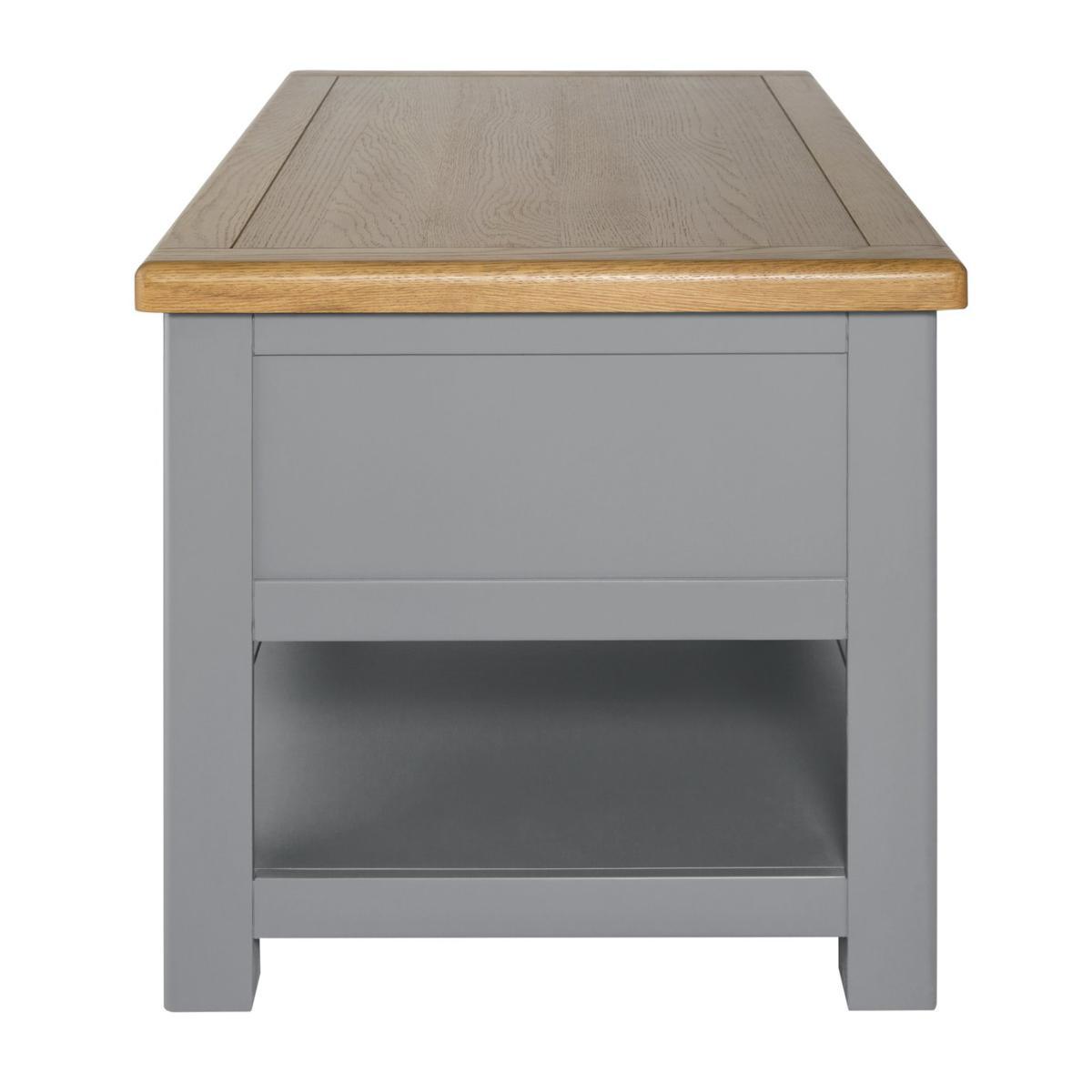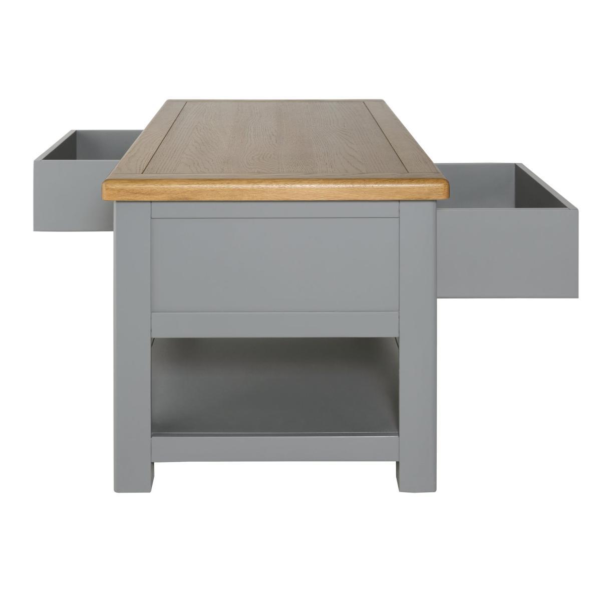 Gather round. It's time to put your feet up. This coffee table will keep everything you need close to hand, so you can snuggle into the sofa. With two drawers and a shelf underneath, it has plenty of storage space. The drawers can be opened from both sides, so you can all access the remote. That's neat! This is a timeless piece, finished in warm grey with a natural wood top. Rounded edges complete the classic country look. Put the kettle on!