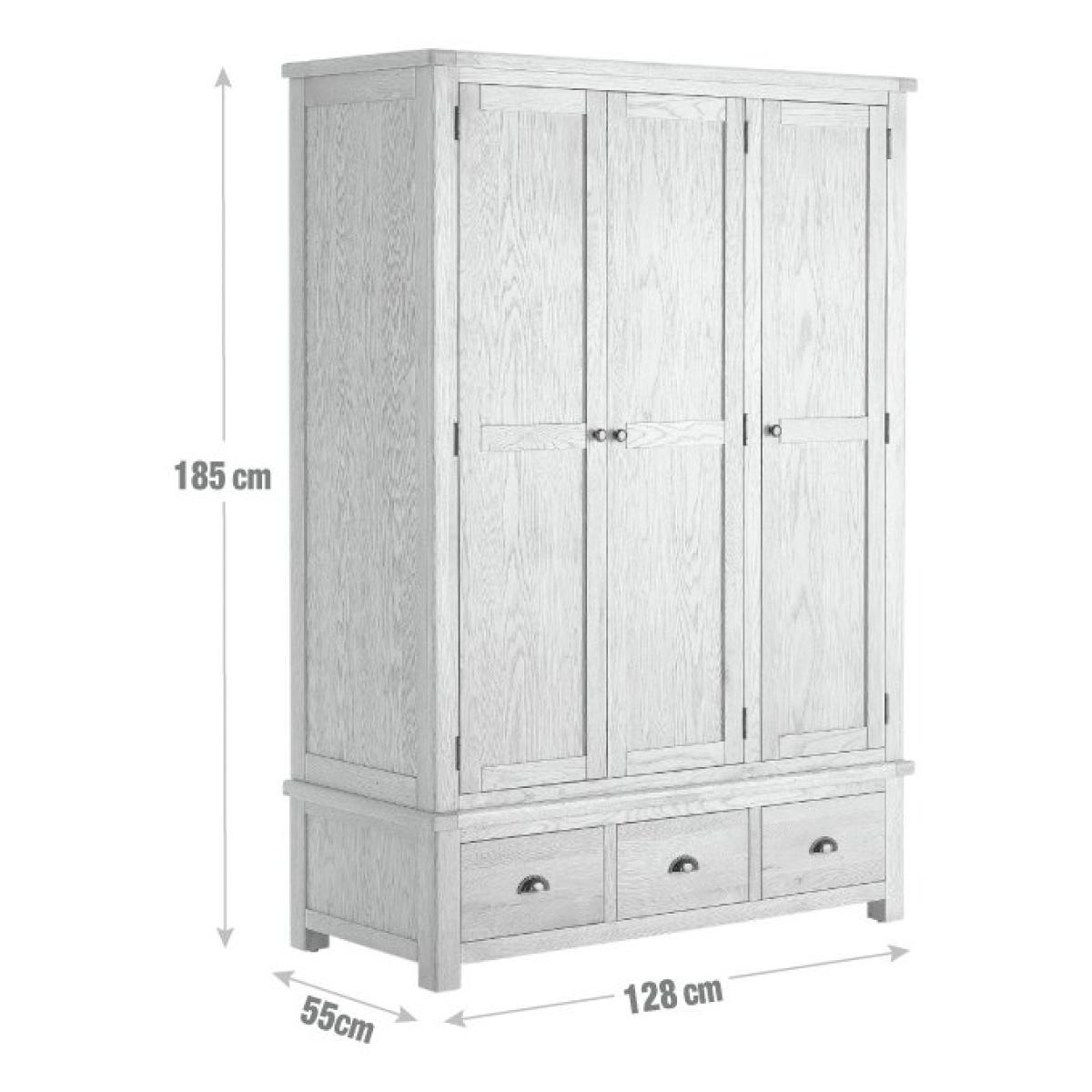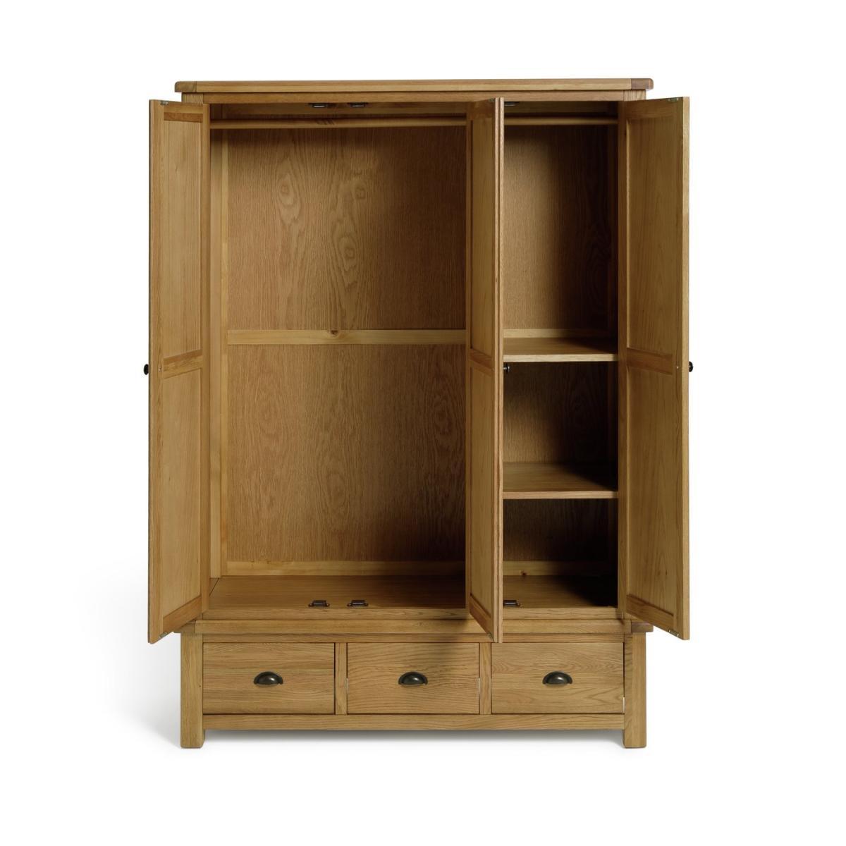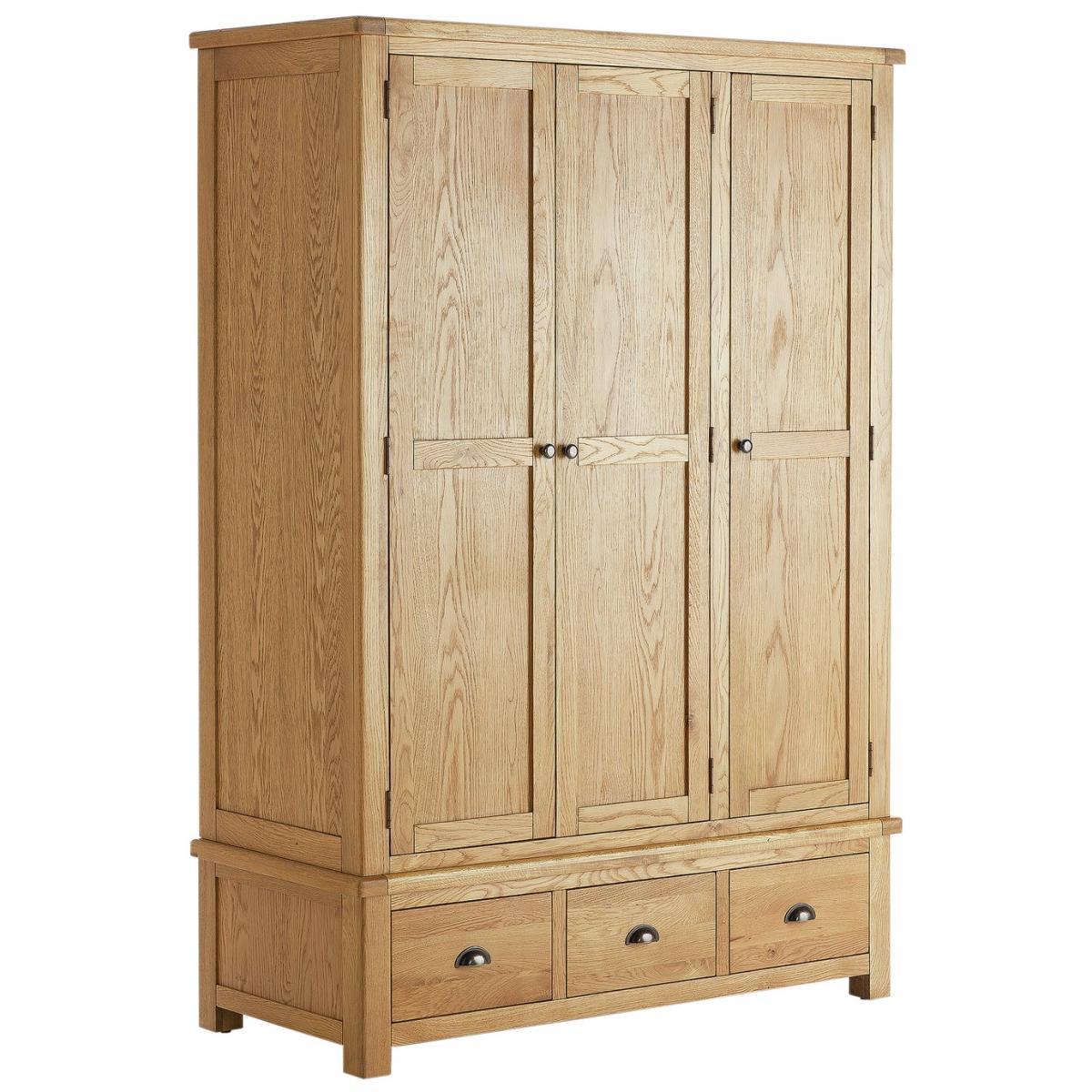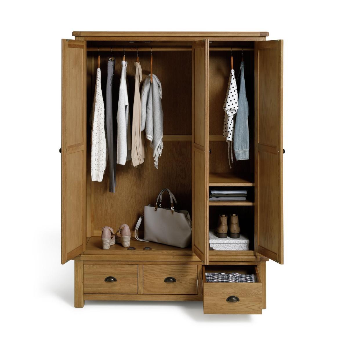 Fashion followers delight. We love this triple wardrobe with loads of style as well as storage. Crafted in a panel design from solid oak with a richly grained oak veneer. You can feel the warm natural vibe it brings to your bedroom. With rounded edges and antiqued style handles it is a classic and robust piece that will continue to look good season after season. Two hanging rails and 2 adjustable shelves and 3 drawers on smooth wooden runners at the bottom - all the space you need for your capsule wardrobe.