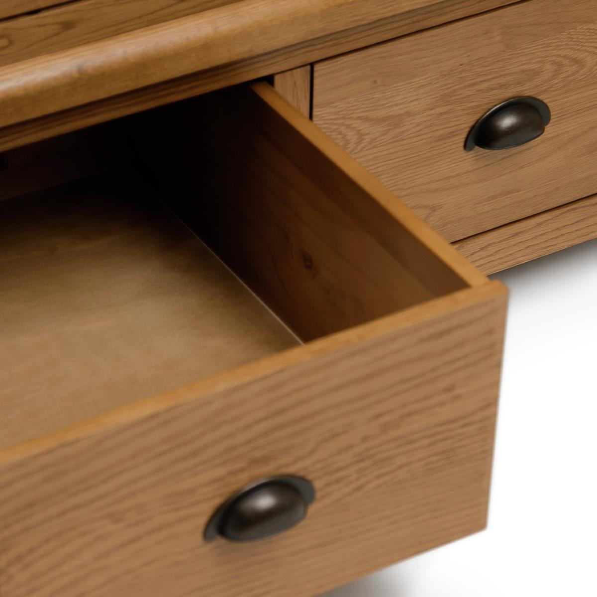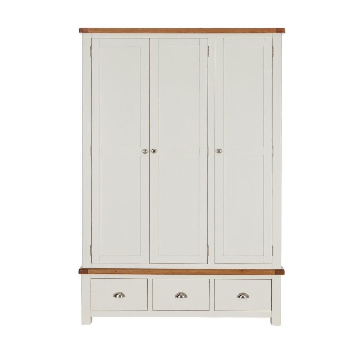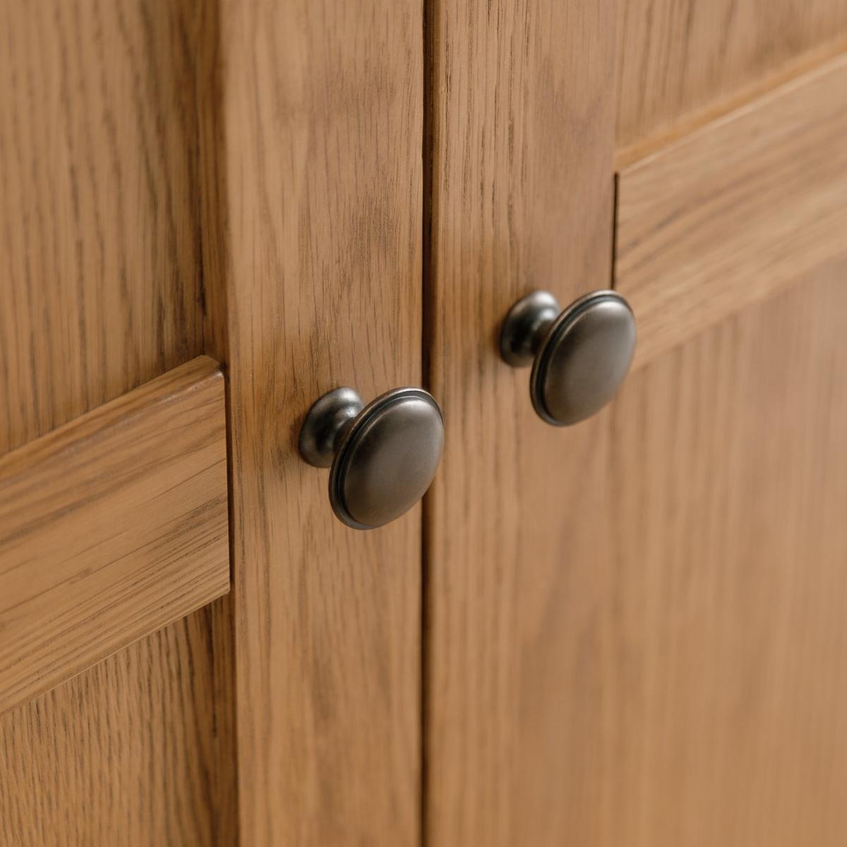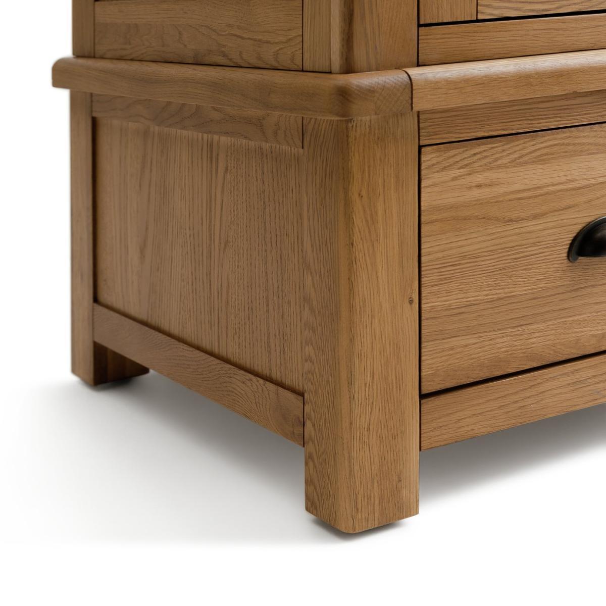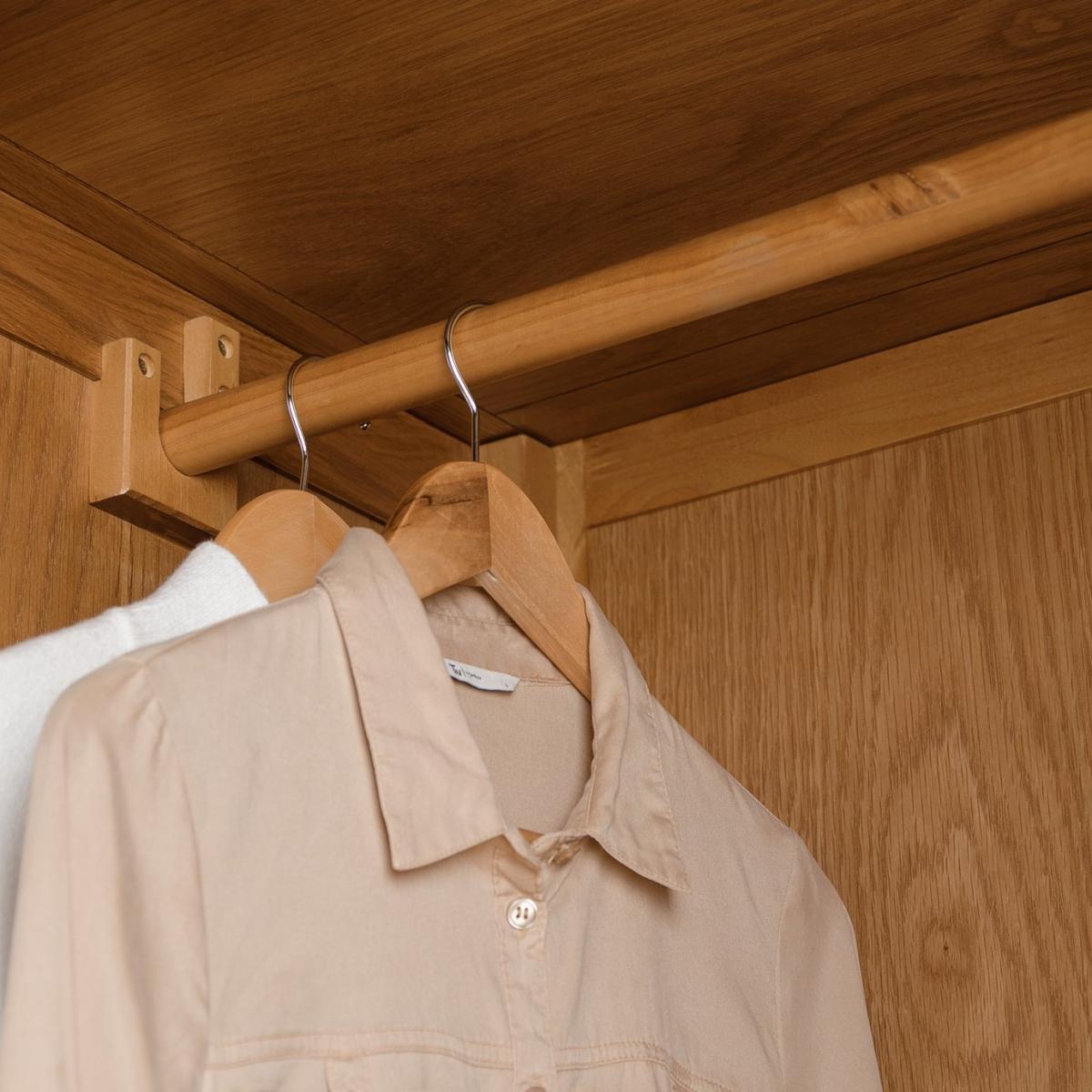 Fashion followers delight. We love this triple wardrobe with loads of style as well as storage. Crafted in a panel design from solid oak with a richly grained oak veneer. You can feel the warm natural vibe it brings to your bedroom. With rounded edges and antiqued style handles it is a classic and robust piece that will continue to look good season after season. Two hanging rails and 2 adjustable shelves and 3 drawers on smooth wooden runners at the bottom - all the space you need for your capsule wardrobe.