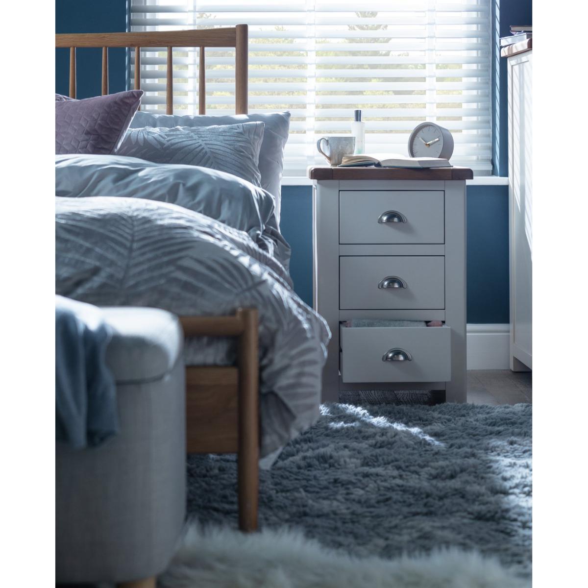 I love this bedside table’s versatile design; the mix of cream and oak gives it a timeless appeal that works well in both classic and contemporary interiors. Its compact size makes it perfect for smaller bedrooms, while the three drawers offer practical storage for essentials. To style it effectively, consider pairing it with bedding in soft neutrals or subtle patterns, and adding a simple lamp or a small plant on top for a functional yet inviting look. It works particularly well in coastal, Scandi, or country-style schemes, but can also act as a neutral anchor in more eclectic spaces. Keep accessories minimal and consider contrasting textures or colours to add interest without overwhelming the overall aesthetic.