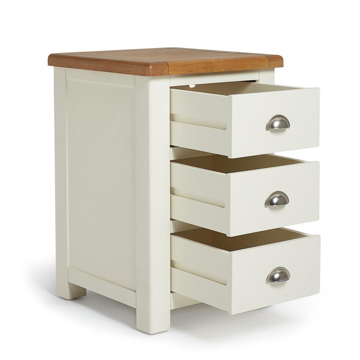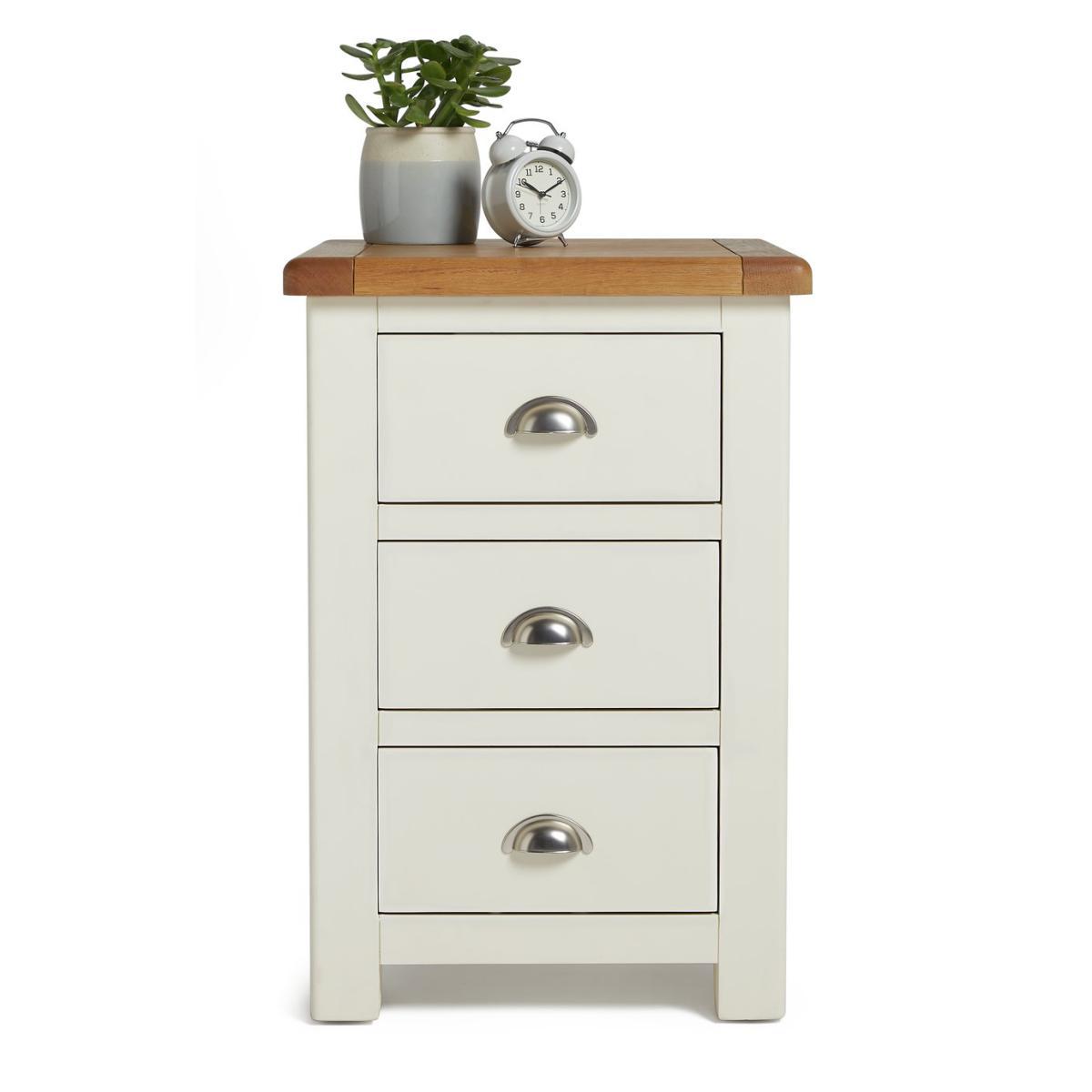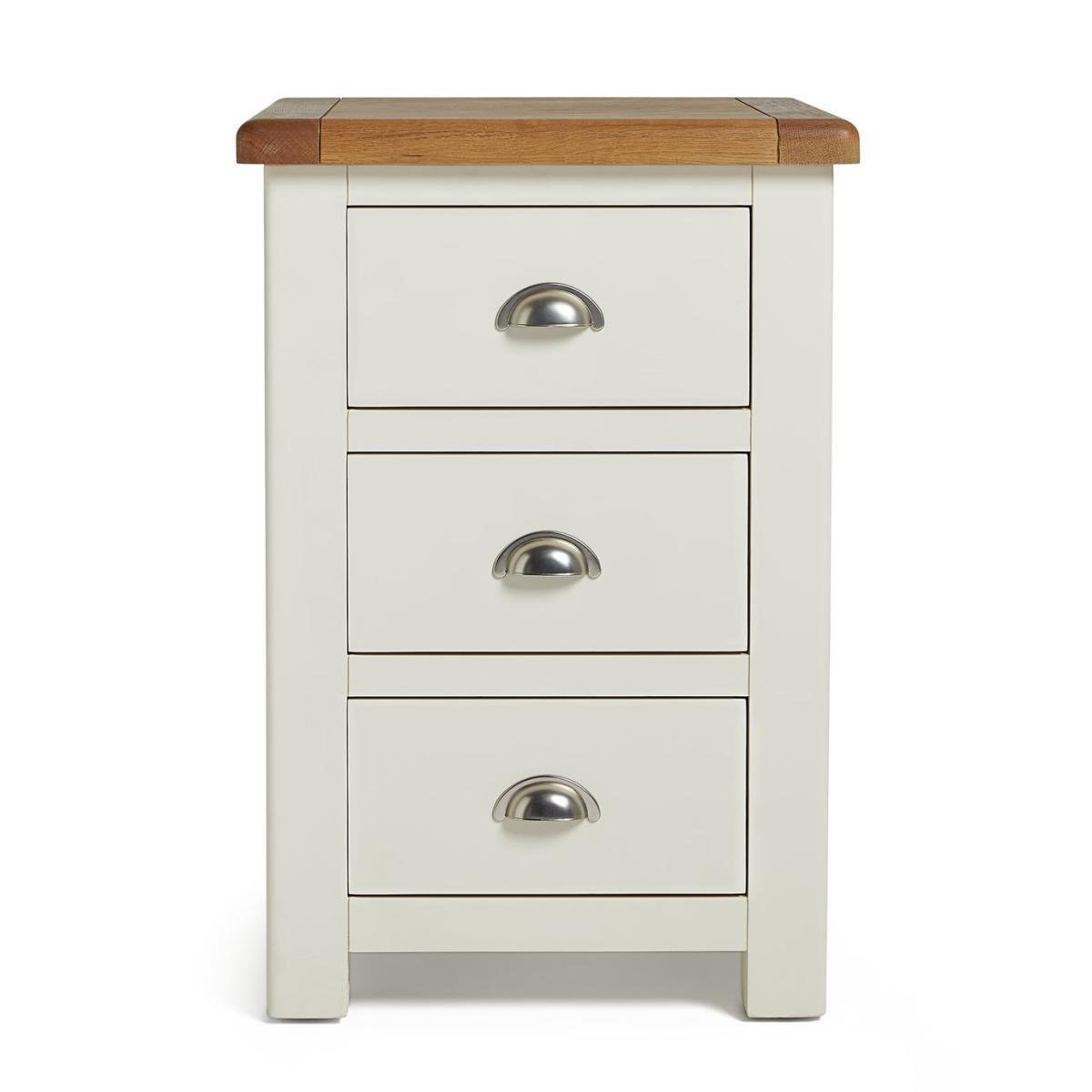 Love me, love my bedside. Cozy up in the evening with this solid nightstand. With a cream painted finish and warm oak top it adds to the restful and calm mood of your bedroom. With antiqued style cup handles, smooth wooden runners and soft-rounded edges, it's a timeless piece. Practical too. 3 drawers on wooden runners give plenty of space for you to tidy away all your bedtime essentials. Screens-off, phone in. Reading material stored. Lamp off. Time to tuck up and dream.
