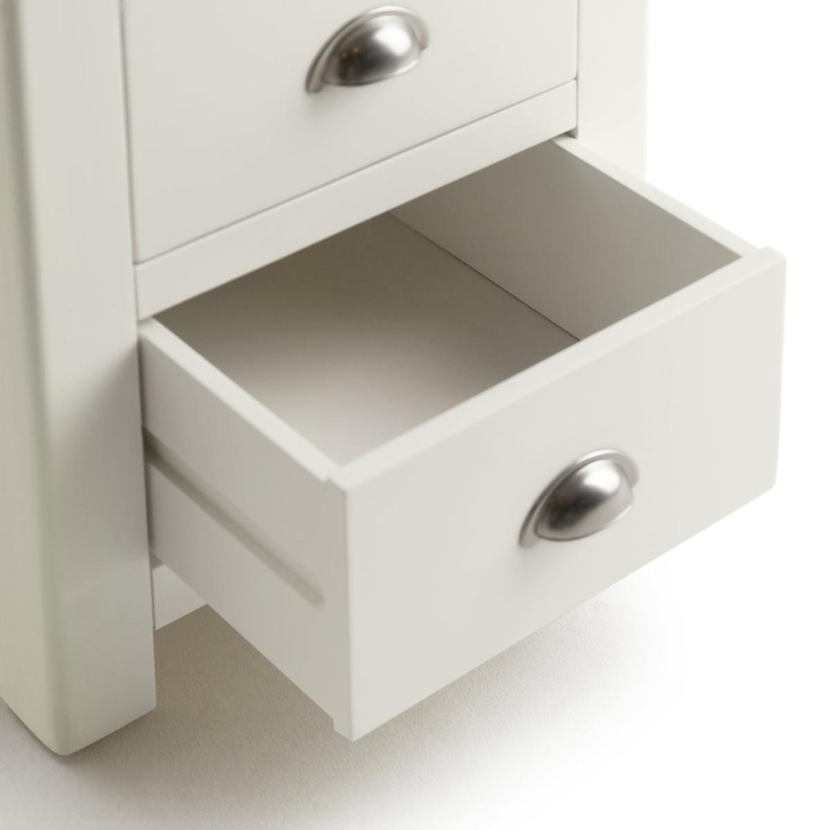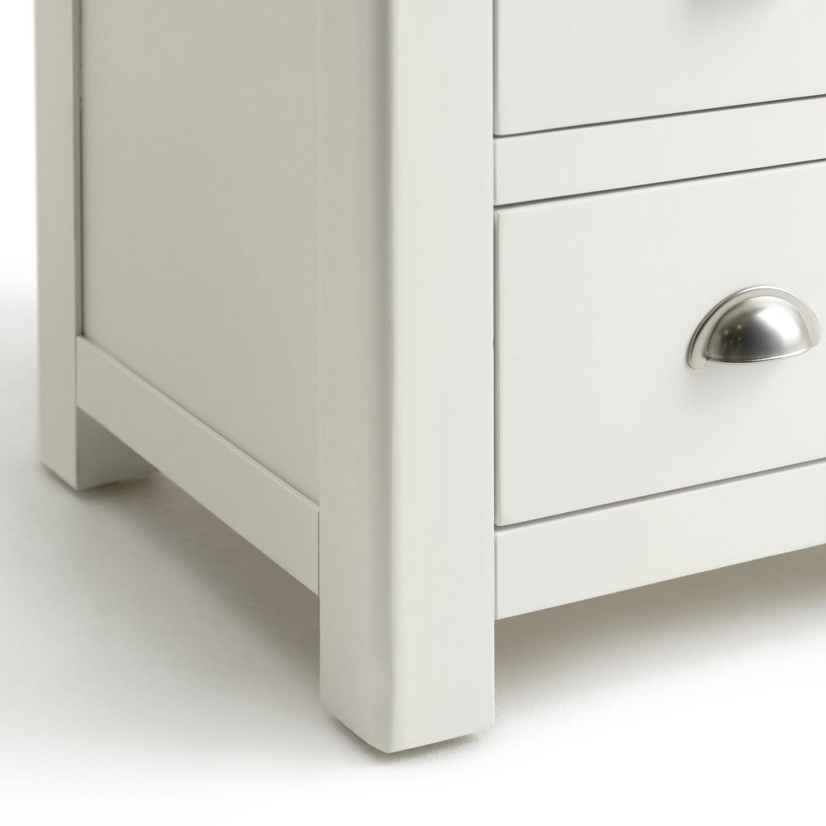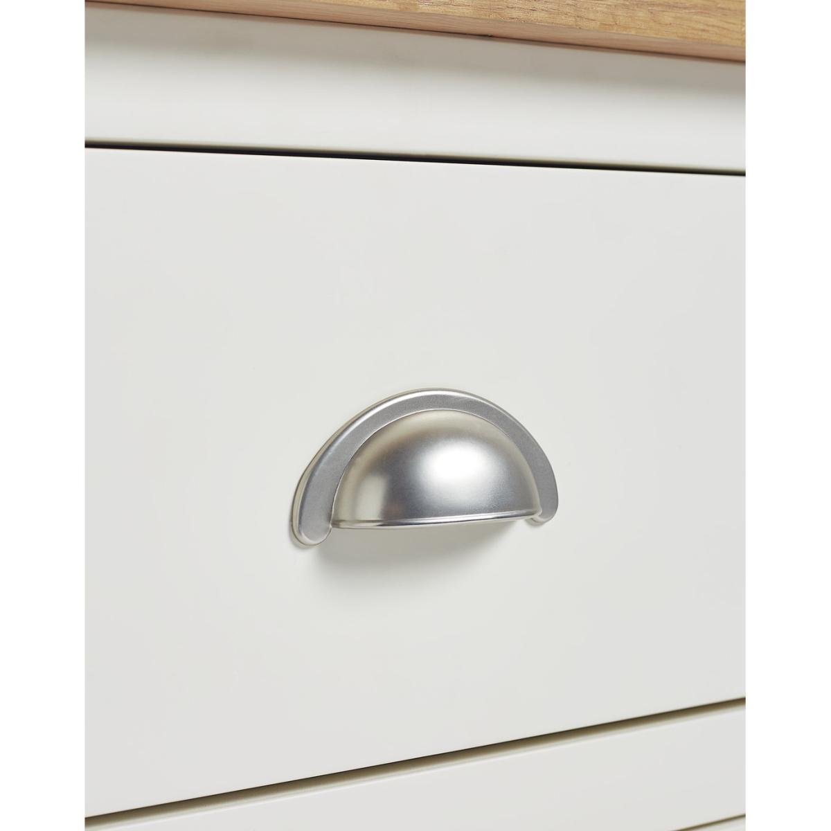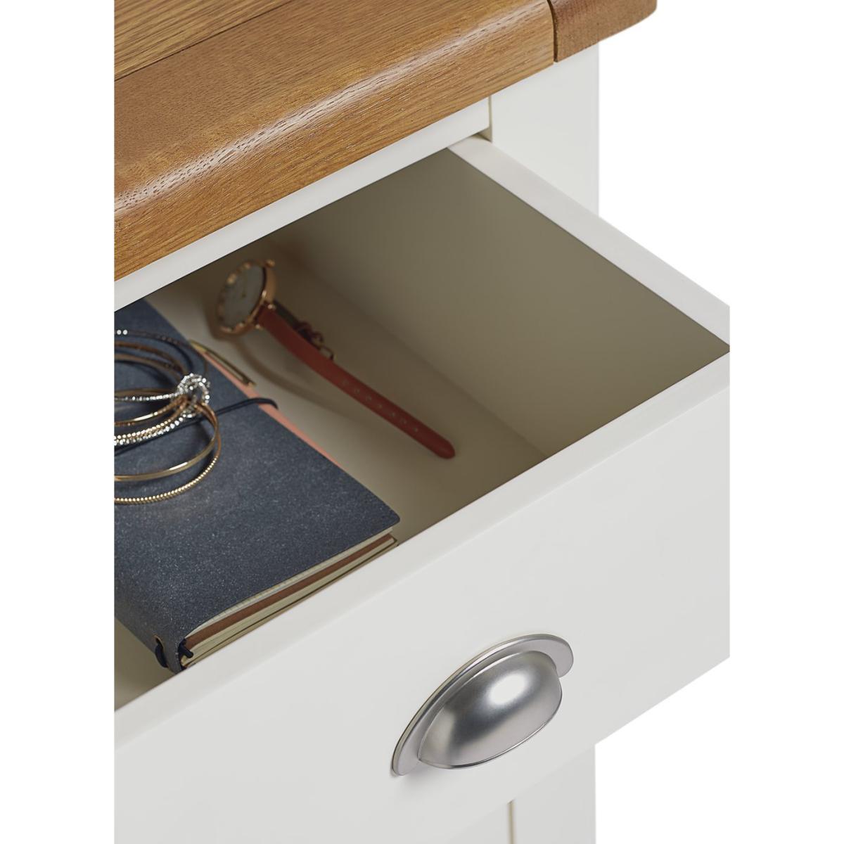 Love me, love my bedside. Cozy up in the evening with this solid nightstand. With a cream painted finish and warm oak top it adds to the restful and calm mood of your bedroom. With antiqued style cup handles, smooth wooden runners and soft-rounded edges, it's a timeless piece. Practical too. 3 drawers on wooden runners give plenty of space for you to tidy away all your bedtime essentials. Screens-off, phone in. Reading material stored. Lamp off. Time to tuck up and dream.