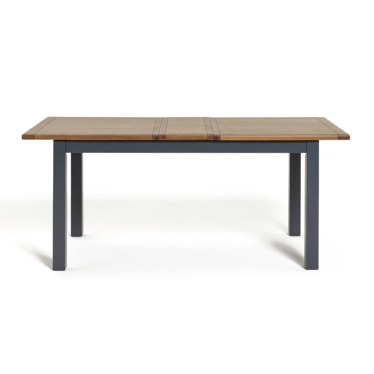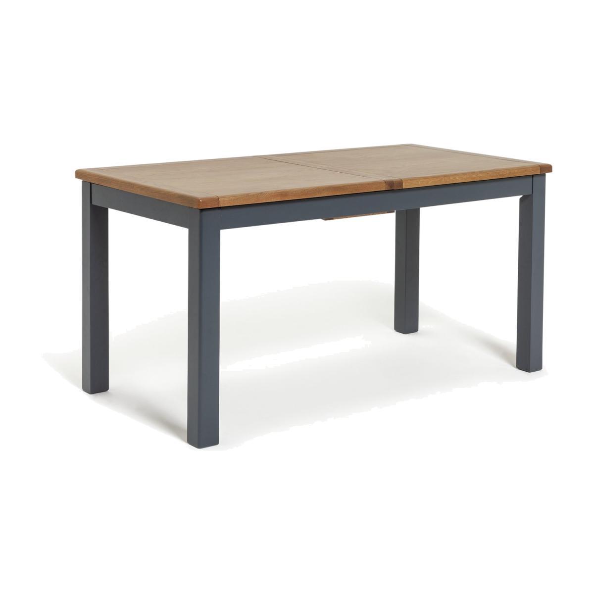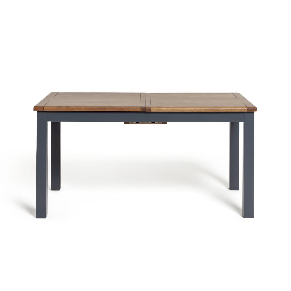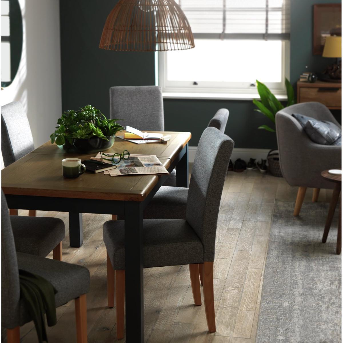 Table for 8? Come this way. Our stylish extending table is modern country cool. The traditional oak top is classically warm and welcoming. The dark grey paint give the solid oak legs a fresh contemporary feel. It seats 6 people just as it is. Ideal for family meals and cosy dinner parties. Need room for 2 more? No problem, it takes 2 ticks to pull and flip. Pulling the table ends reveals a matching middle section that simply flips into place. How neat is that. Shall we take your order now?