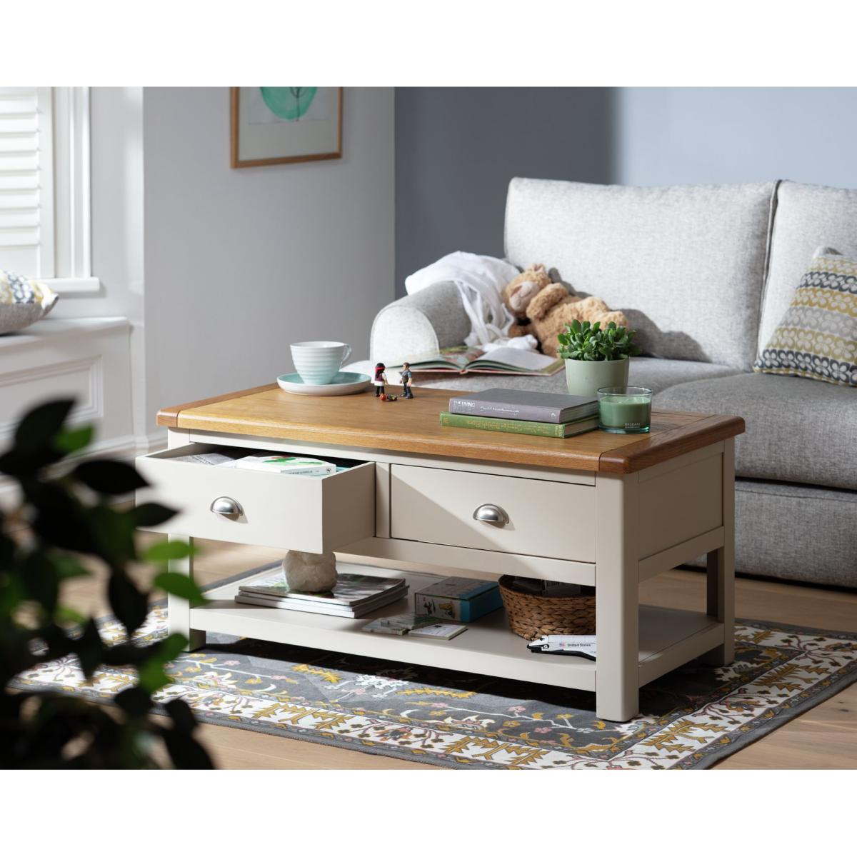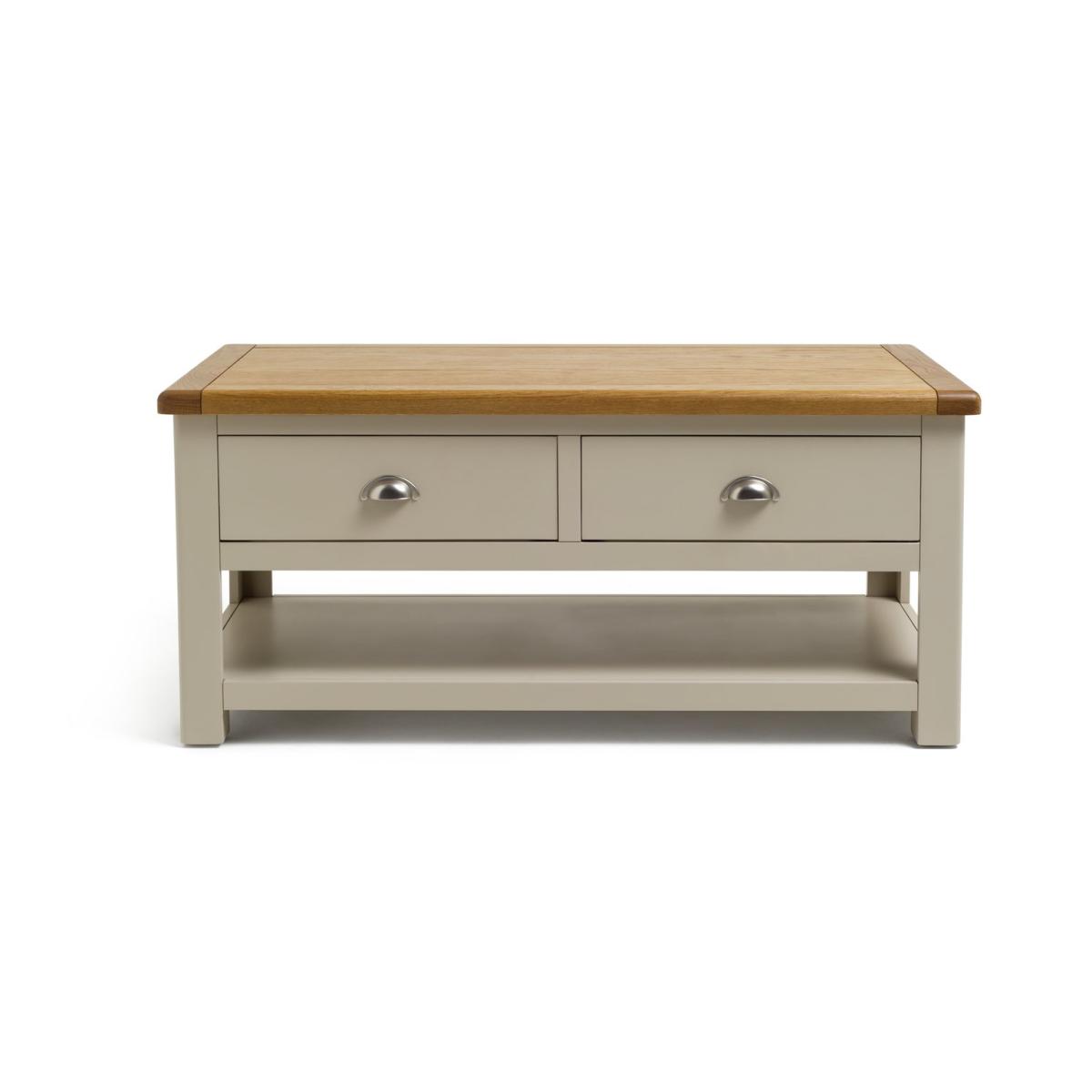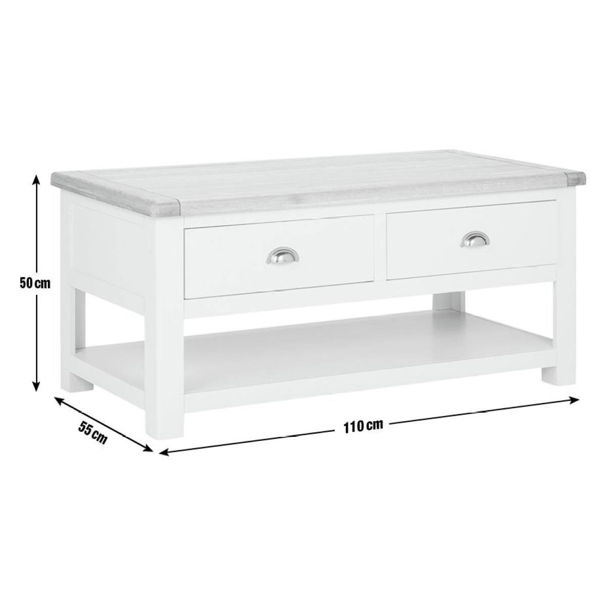 I really like this coffee table because of its versatile two-tone finish, which adds a touch of warmth and visual interest to a variety of interiors. It works well in both traditional and contemporary settings, especially in cosy living rooms or coastal schemes, where the natural oak tones complement neutral palette or soft pastel colour schemes. Practical styling tips include layering with textured accessories like woven trays, stacks of books, or ceramic bowls to create an inviting centrepiece. Its handy drawers and lower shelf make it both functional and stylish, perfect for keeping clutter out of sight while still showcasing decorative accents. Overall, it’s a timeless piece that balances practicality with understated charm.