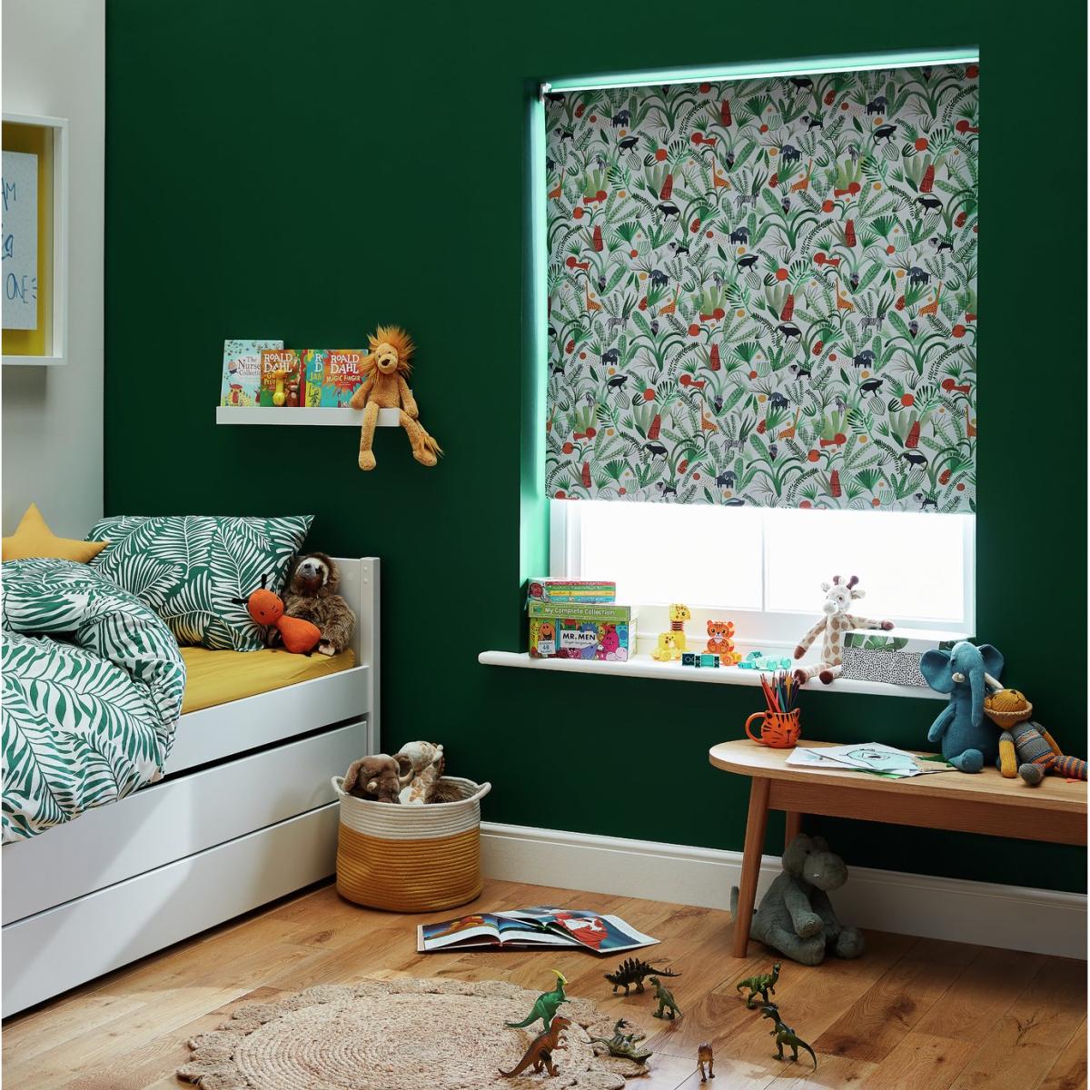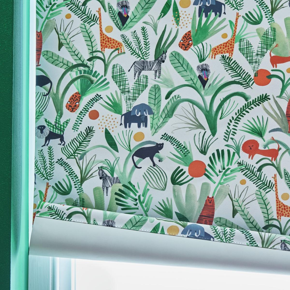 Go wild with our black-out jungle blind. A go-to for a good night's sleep. Youngsters will love waking up refreshed to an array of animal friends. The thick fabric blocks out the sun brilliantly when nights are light. Nice. Great for privacy too. Simply pop it in the bedroom for total peace of mind. Unsure on size? Don't worry. This versatile blind can be cut to fit your window. Fitting them is super straightforward (it only takes 3 screws) and you can even trim the fabric down to size if needed. Features: Blackout blind. Green wildlife. Material: fabric. Polyoxymethylene chain mechanism. Bottom rail material: PVC. Dimensions: Size W90cm, drop 160cm / W35.4in, drop 63in (including fittings). Size W86.5cm, drop 160cm / W34in, drop 63in (excluding fittings). Easily trimmed to size. General information: Tested and safe to the 2014 blind safety standards BS EN 13120. Fits inside or outside window recess or to wall. This blind comes with a child safety P clip. Includes fixtures; fittings and instructions. Dust or wipe with a damp cloth only.
