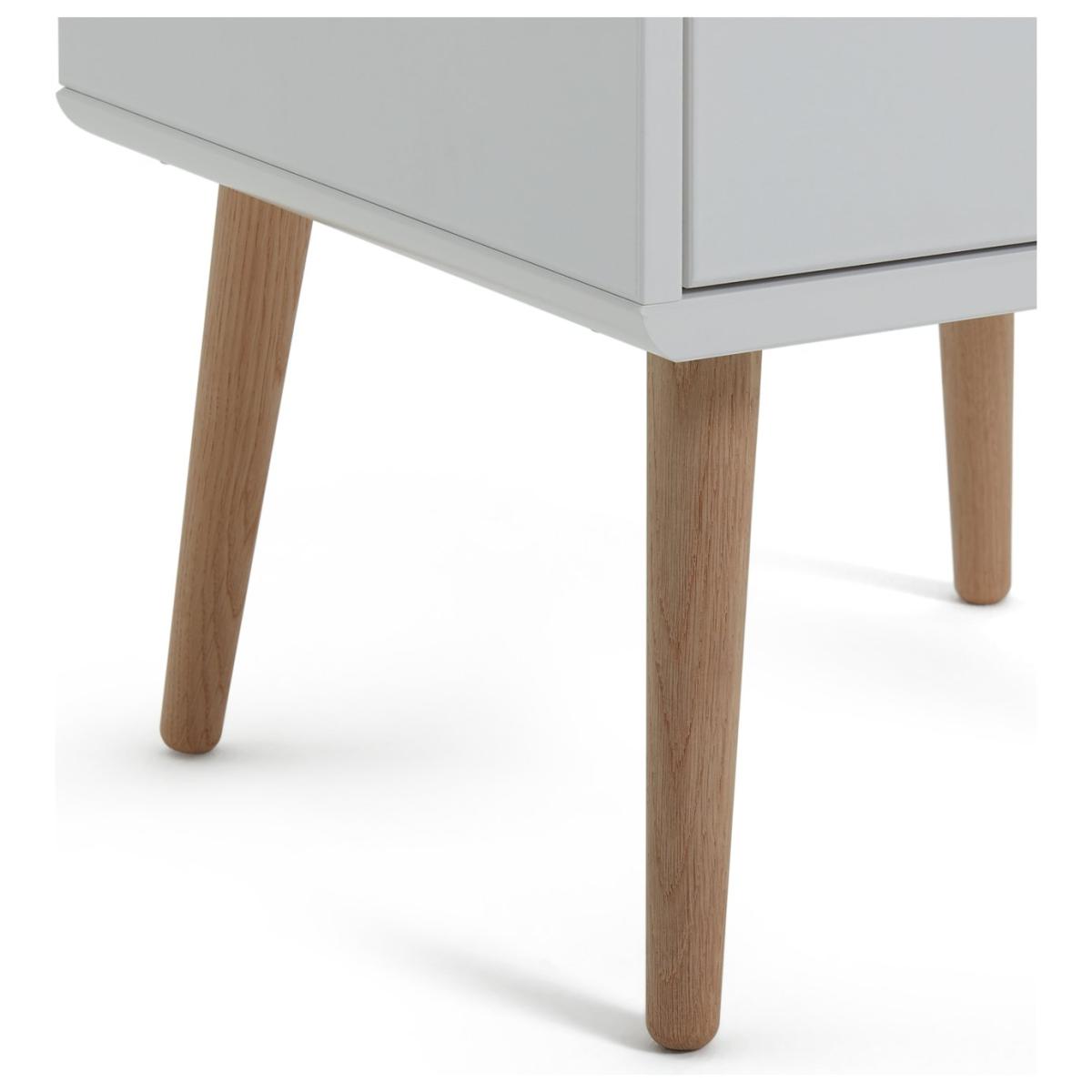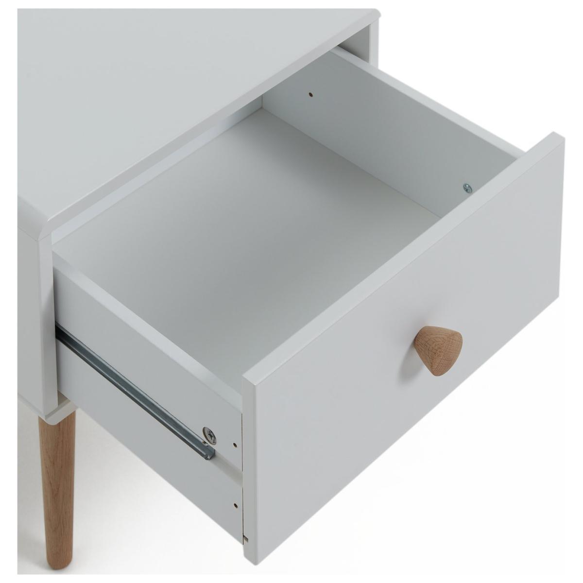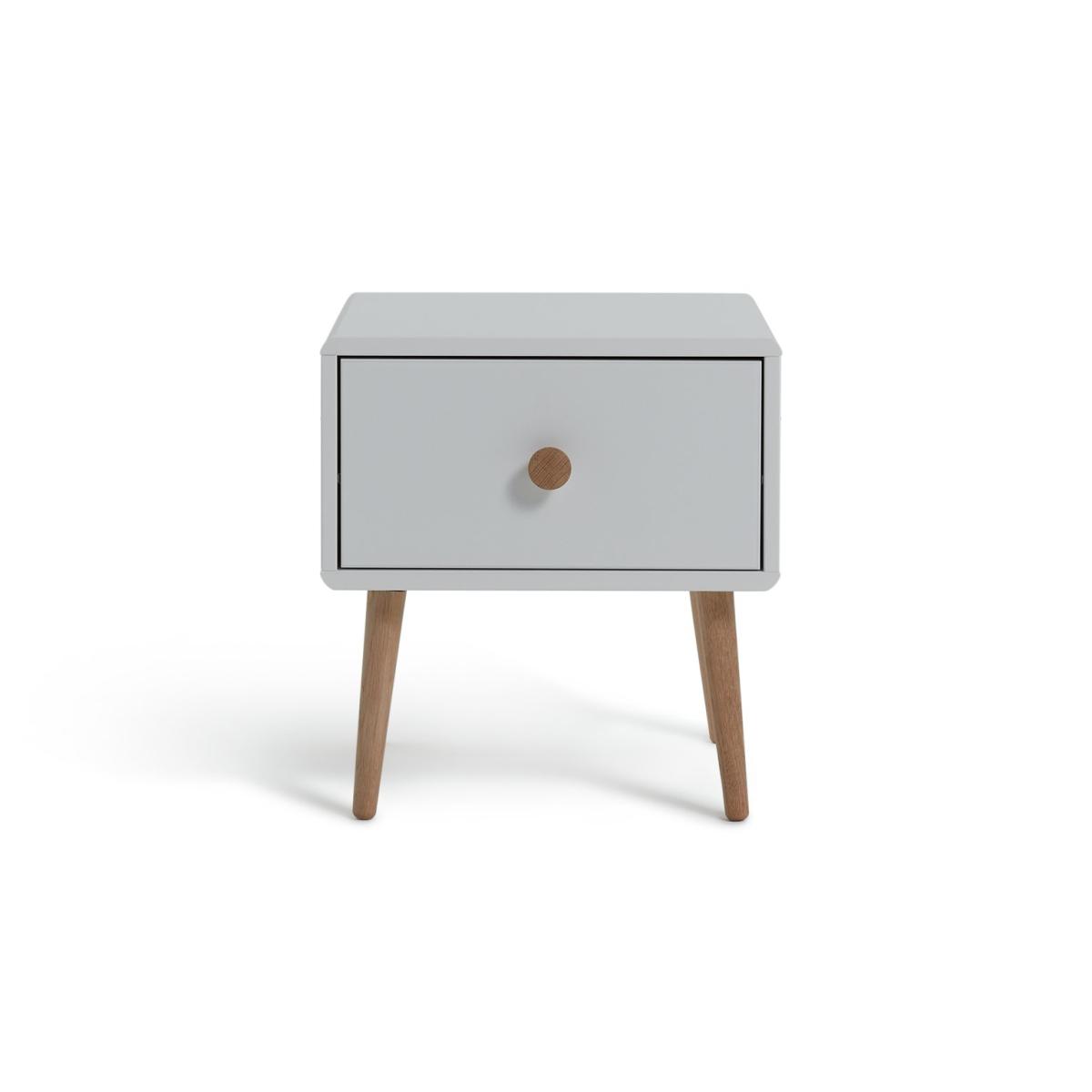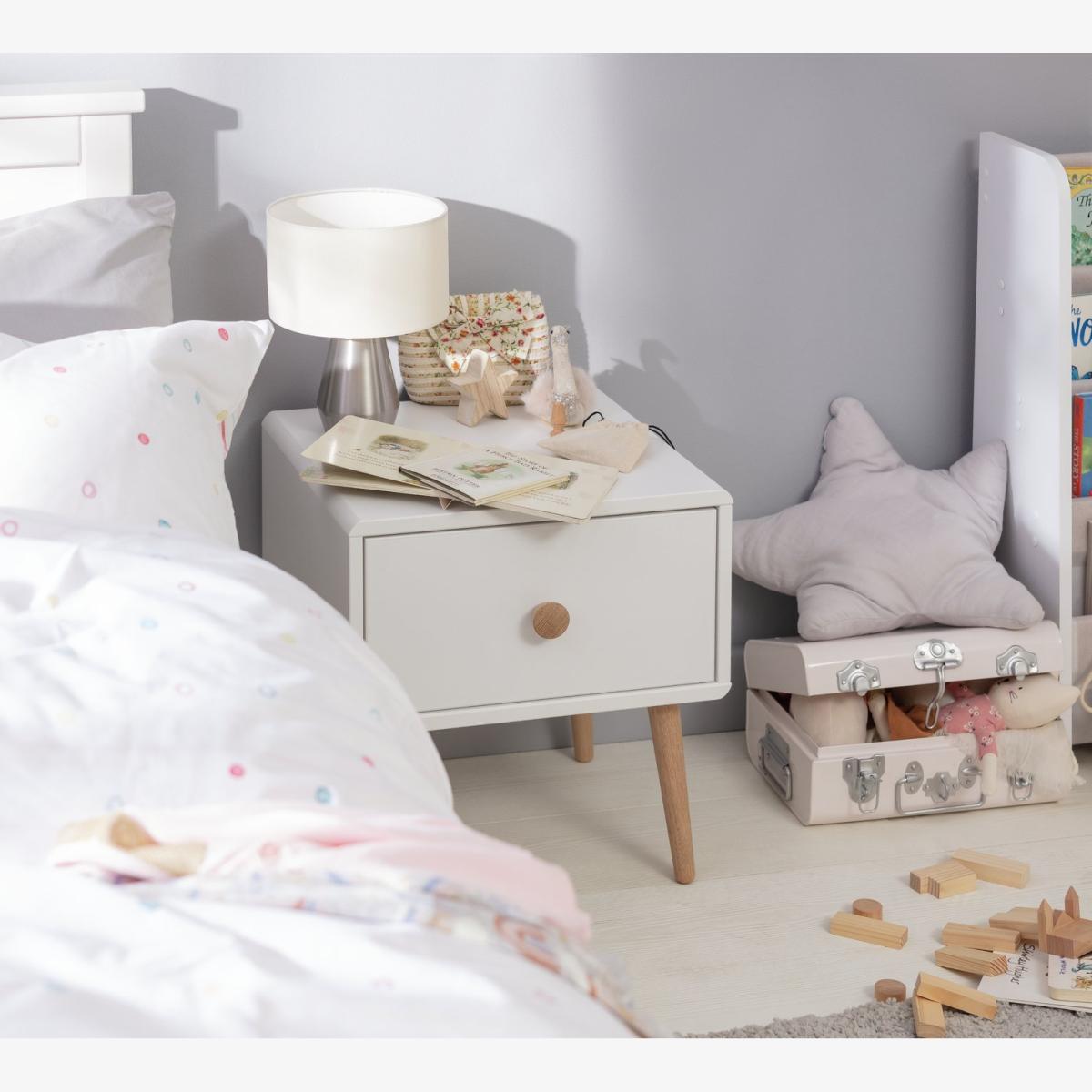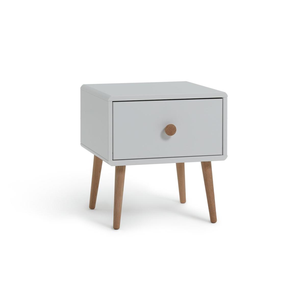 Fun, fresh and playful, with pine legs and drawer handle, the Scandi-inspired Bodie bedside cabinet has a simple and neutral look. Perfect for any child and any age, it's just the job for those bedtime essentials. Use the surface for a night light or monitor; hide away muslins and toys in the drawer. Finished in white with pine stained handles and tapered legs. Our products are designed with kids in mind and are built to cope with everyday use. Tested to the latest safety regulations, they comply with British and European safety standards. Part of the Bodie collection. Made of solid wood. Wooden handles. 1 drawer with metal runners. Self-assembly. If this product is over 60cm high it must be securely attached to the wall to prevent overturning. Dimensions: Size H44.1, W40, D40cm. Internal drawer H16.8, W35, D33.6cm. Handle size: L2.8, W2.8cm. Package Dimensions: Package 1 dimensions: H35.2, W60.1, D45.1cm. Package 1 weight: 8.12kg. General information: Manufacturer's 1 year guarantee.