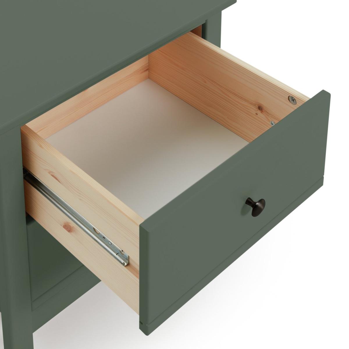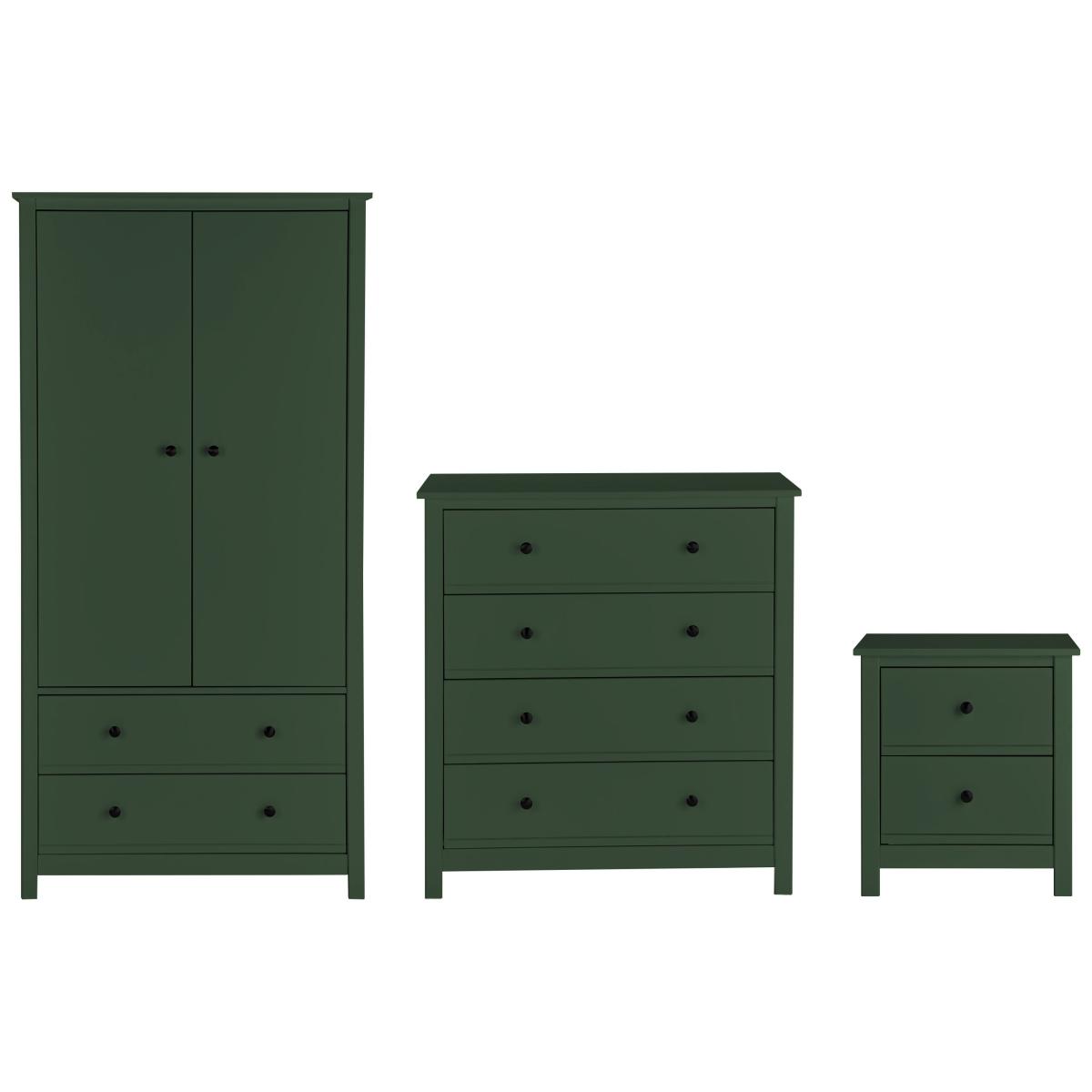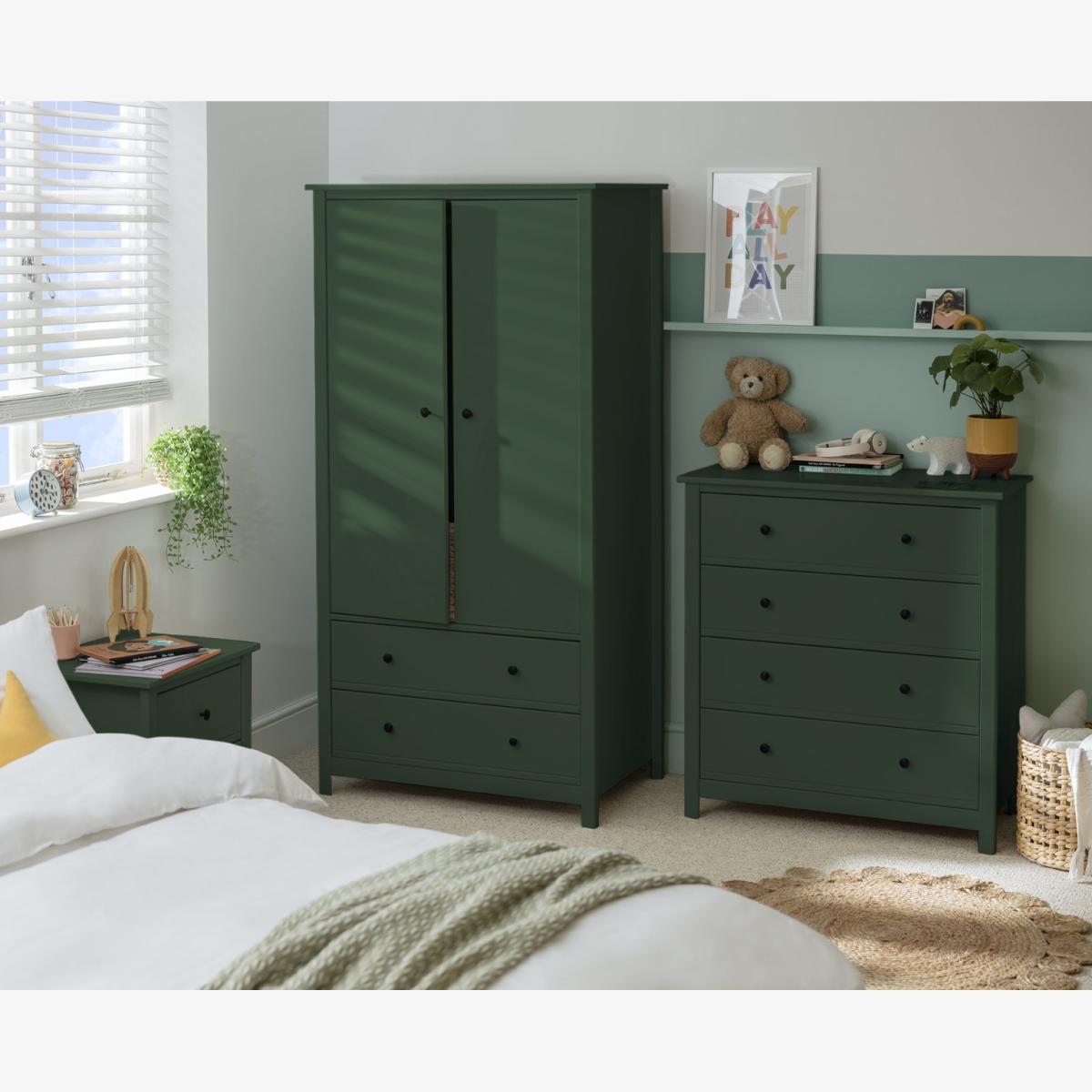 A simple yet classic look, the Brooklyn 3 piece kids bedroom furniture set is made from solid pine and MDF, with a smooth green paint finish. This timeless trio consists of a wardrobe with a wide rail and drawer storage underneath, a 4 drawer chest of drawers and a bedside table. Goodbye clutter, hello neat and tidy room. All the drawers open easily on smooth metal runners, and the metal handles are painted black for a cool contemporary look. Part of the Brooklyn collection. Wardrobe: Size H170.1, W86, D55cm. Internal hanging space H109, W74.8, D52cm. 1 fixed hanging rail. Rail holds up to 15kg. Wardrobe has 2 doors and 2 drawers. Self-assembly - requires 2 people (wall fixings included). Weight 54kg. Chest of drawers: Size H92.2, W86, D40cm. Self-assembly - requires 2 people (wall fixings included). Weight 30.3kg. Bedside table: 1 bedside table(s). Size H53.8, W48.7, D40cm. Internal drawer size H15.3, W32.5, D33.6cm. 2 drawers. Self-assembly requires 1 person. Weight 12kg. General information: Made from MDF and pine. If this product is over 60cm high it must be securely attached to the wall to prevent overturning. Metal handles. Handle size L2.7, W2.7cm. Drawers in this unit have metal runners. We are excited to be welcoming some of our favourite HOME products into the Habitat range. Your product may arrive in Habitat or HOME packaging. Manufacturer's 1 year guarantee.