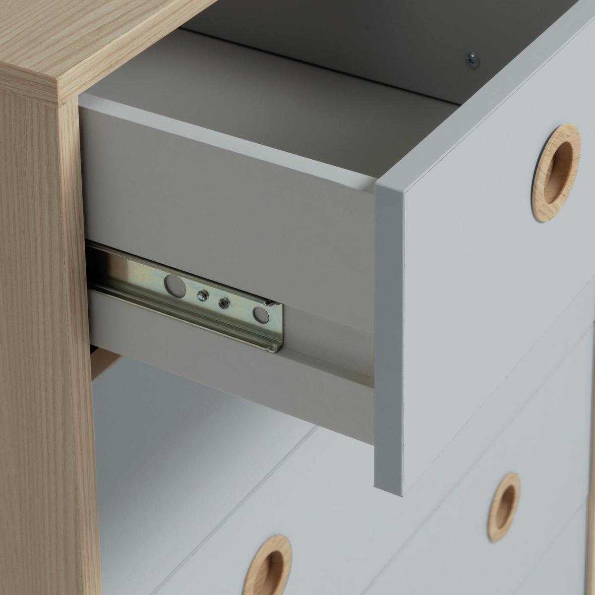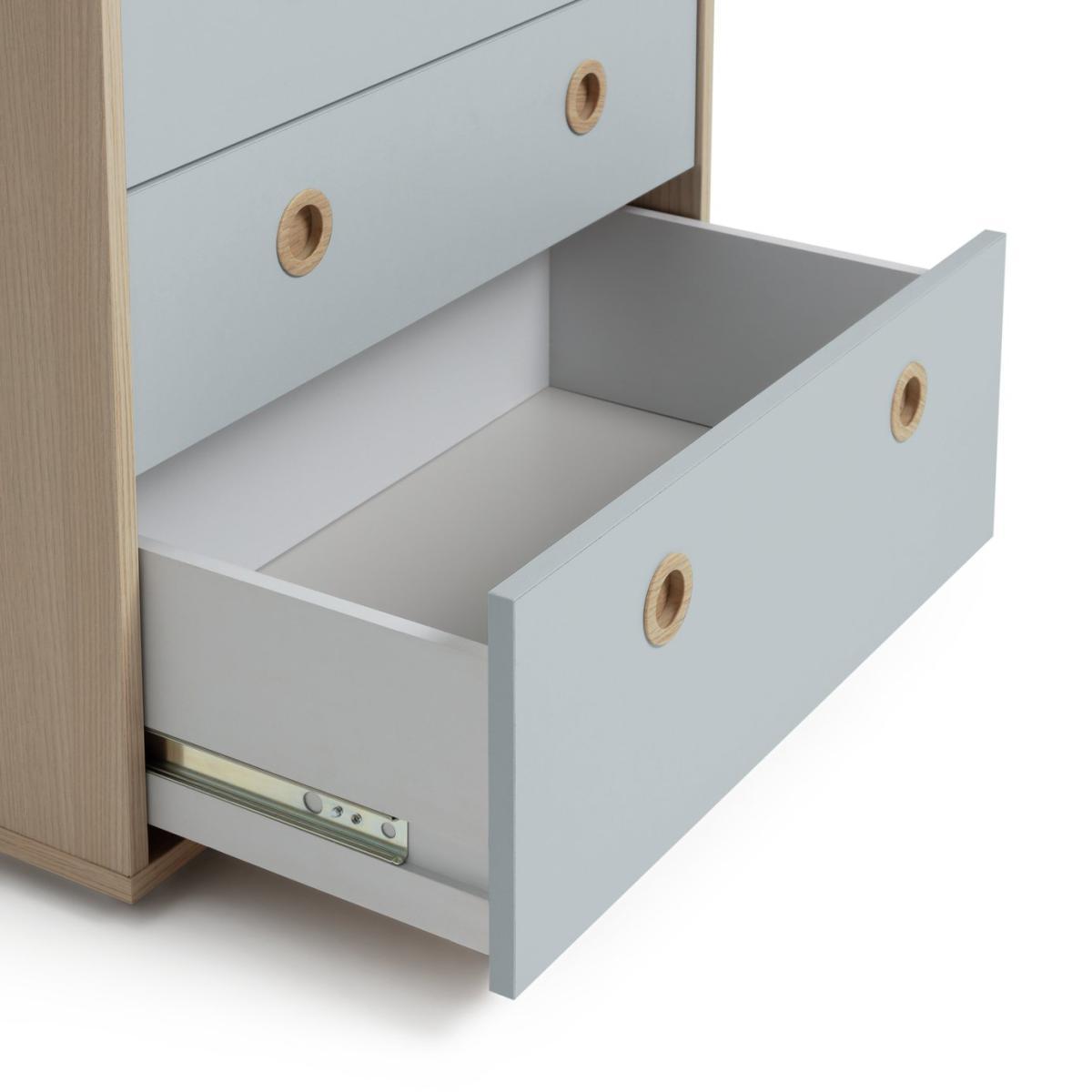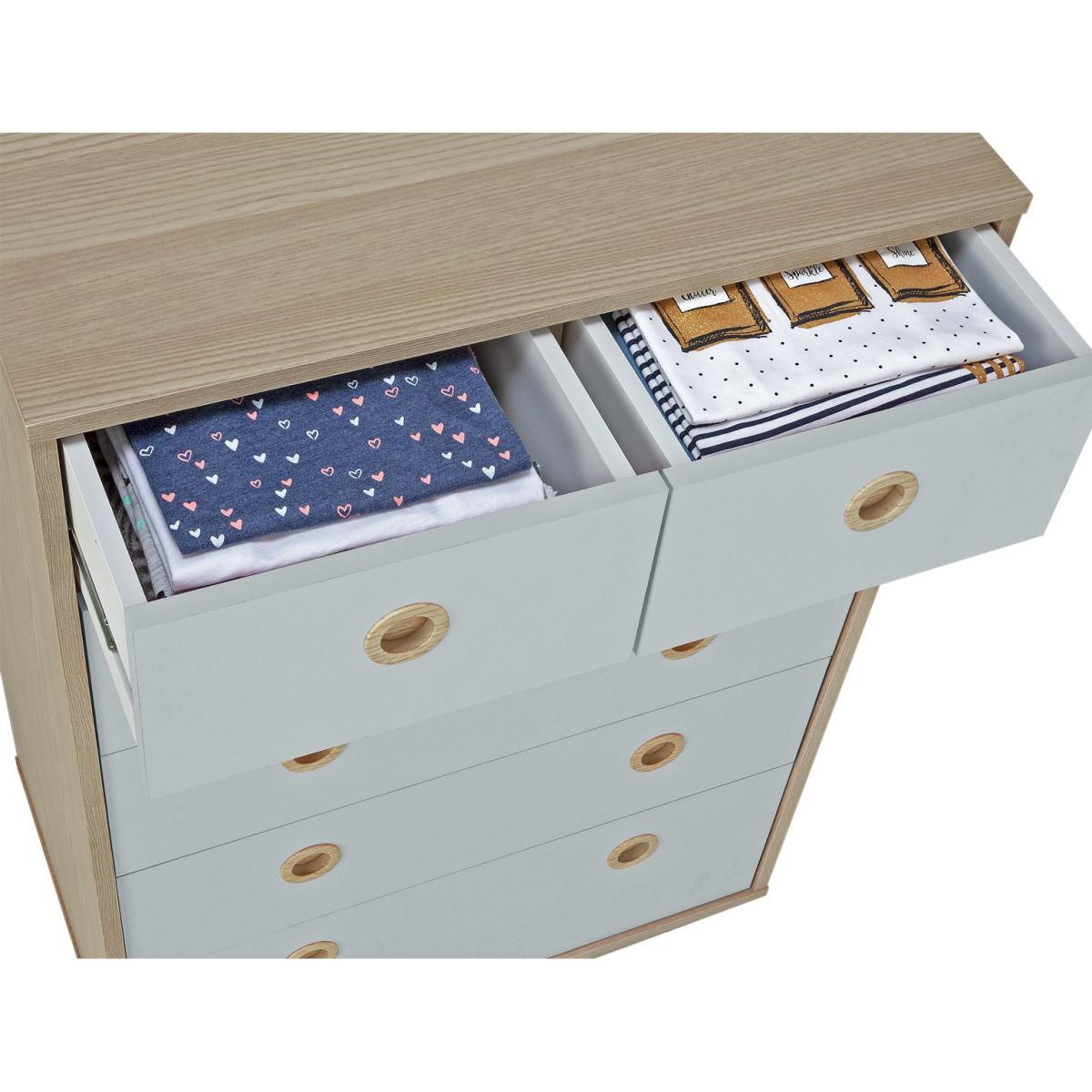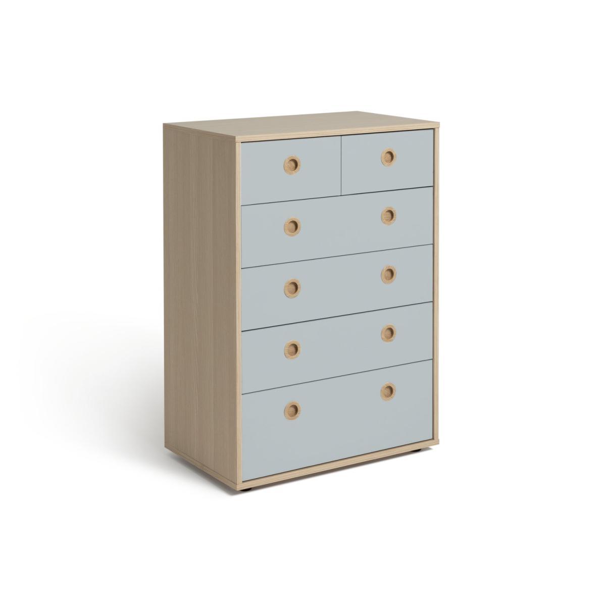 The Camden 4+2 Drawer Chest is pastel perfection in this soft and cosy 2-tone colour with acacia wood effect. It's got loads of storage for your little one's clothes and accessories with a deep bottom drawer, 3 mid drawers and 2 smaller top drawers. The smooth circular inset handles mean there are no sticky-out bits to bash into. And the easy-glide metal runners on the drawers make them light and easy to open and close. Perfect.