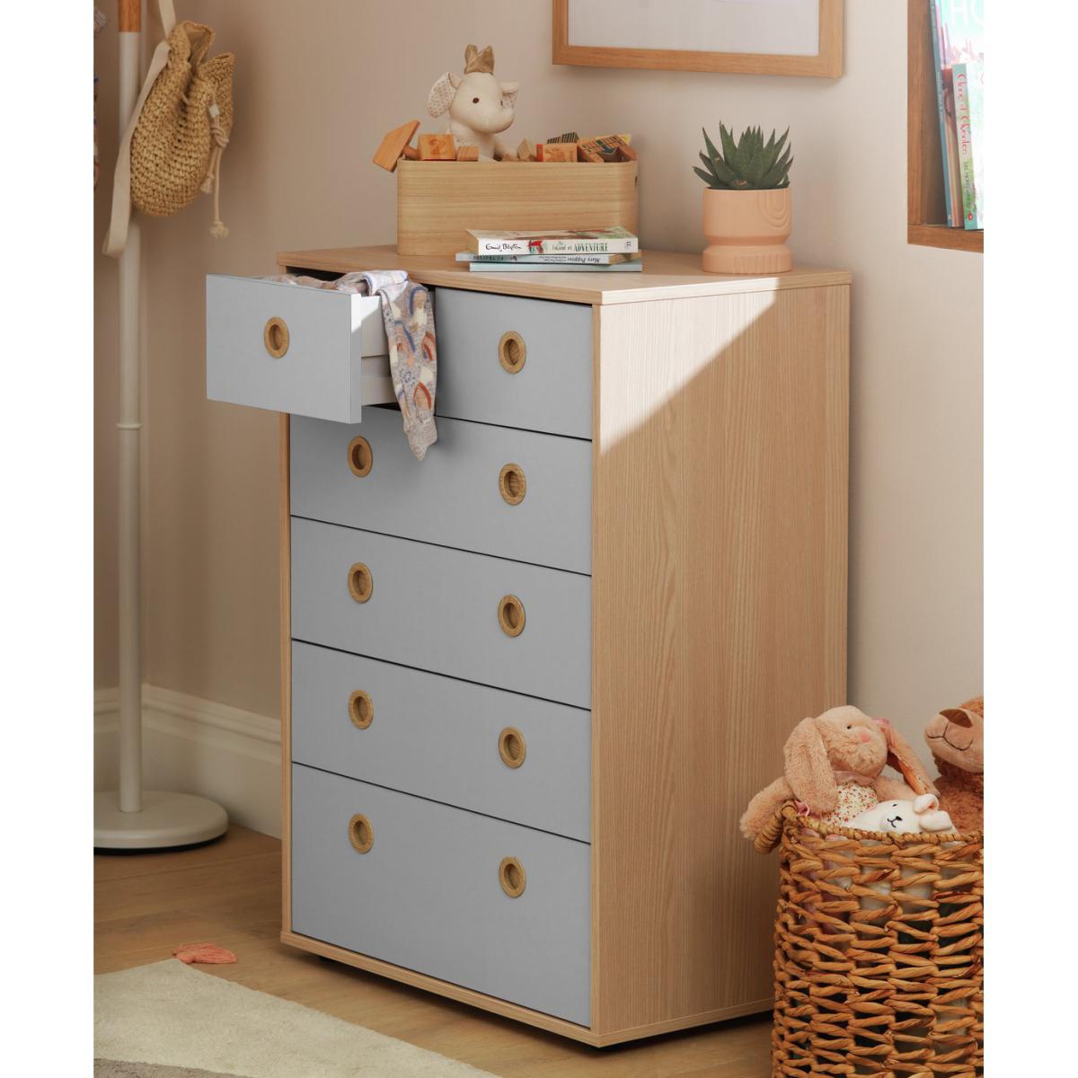 I love the Camden 4+2 in grey and acacia for its versatile design and practical storage solution. Its neutral tones and clean lines make it suitable for a variety of nursery or children’s room interiors, especially those with Scandi or modern minimalist themes. The combination of drawers and an open top provides ample space for organising clothes, toys, and essentials, keeping the room tidy. Styling suggestions include pairing it with soft, pastel-coloured accessories or natural wood finishes to enhance its calming aesthetic. You might also consider adding colourful baskets or decorative labels to make the storage more engaging for kids while remaining functional.