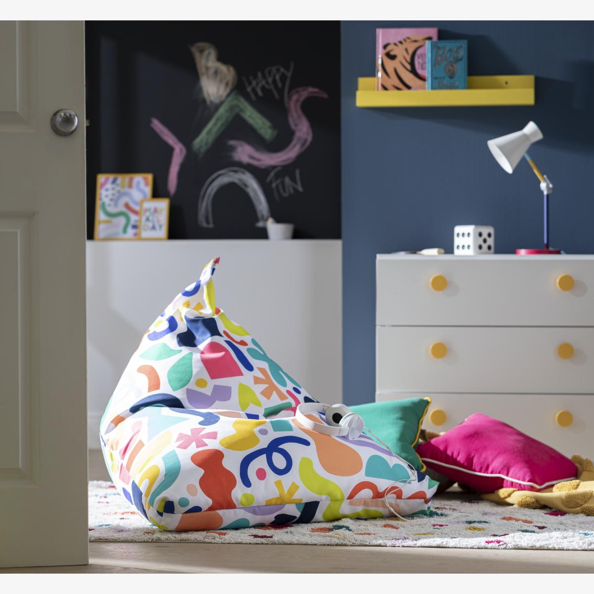 I love this bean bag for its fun, colourful pattern, which adds a lively touch to any child's room or play space. It works well in casual, modern interiors or eclectic settings that embrace bright accents. Its relaxed, soft form makes it perfect for cosy reading corners or casual seating areas, especially when paired with other playful accessories. Practical styling tips include placing it on a neutral rug or alongside a small side table to create an inviting nook, and adding complementary cushions or throws for extra comfort and colour coordination. Overall, a versatile piece that combines comfort with a touch of playful design.