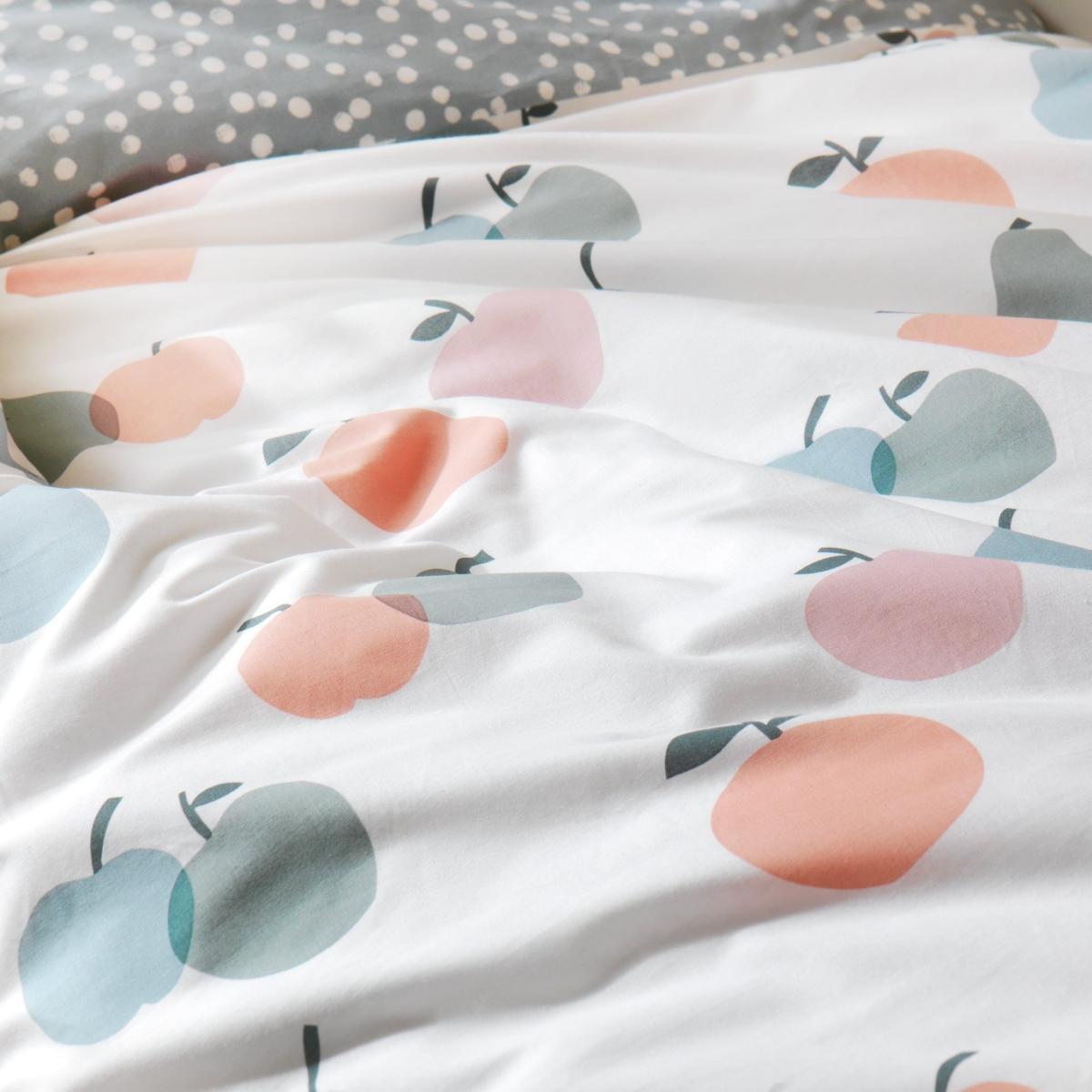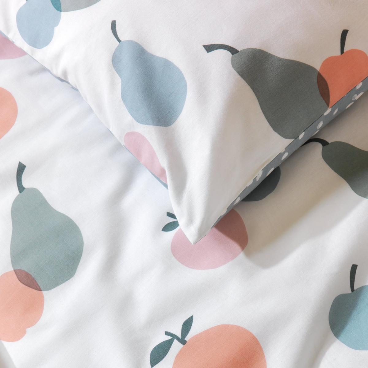 Up the apples and pears to bed. Our charming duvet set will have them all set for the sweetest of dreams. Made from 100% cotton, this easy-care bedding, with its fun, fruity finish is practical and playful. Fancy a change? Just flip over for a cute, coordinated look in a ditsy dot print. Blissful bedroom here we come.