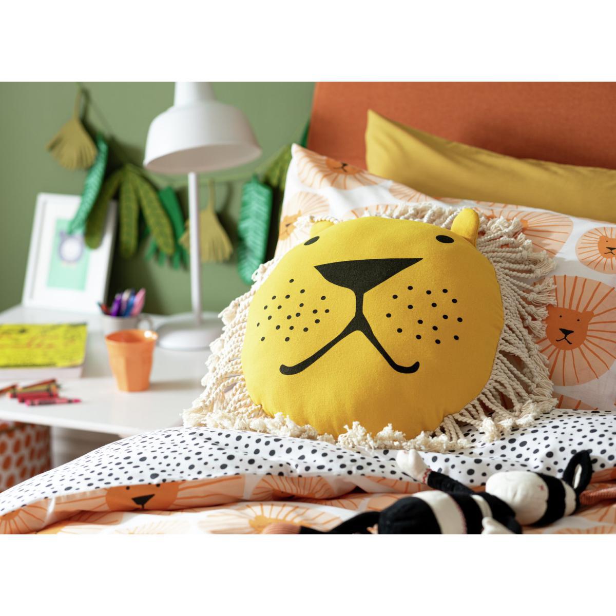 I really like this lion-shaped cushion for adding a fun and playful touch to a child's bedroom or nursery. Its bold yellow colour and soft texture make it a cheerful statement piece that works well in both colourful and more muted interiors, especially when paired with neutral furniture to let the cushion stand out. Styling tips include layering it with other textured cushions for a cosy look or placing it atop a plain bedspread for a pop of personality. It's also versatile enough to sit on a reading nook or a cosy armchair, making it both practical and decorative. Perfect for adding a touch of whimsy while still being easy to incorporate into various interior schemes.