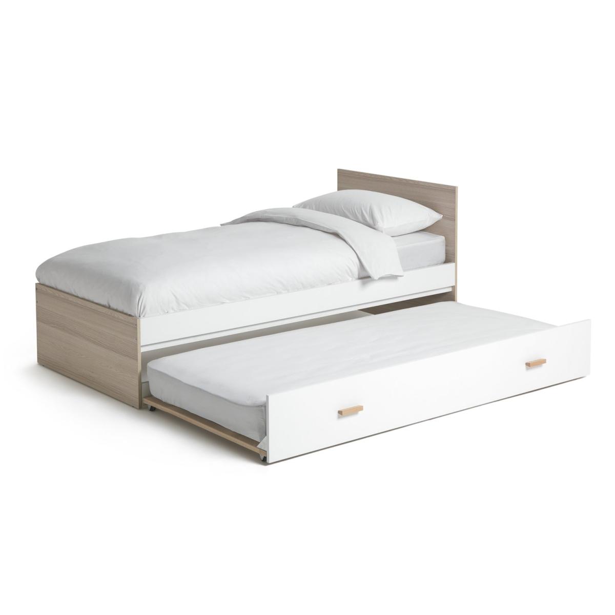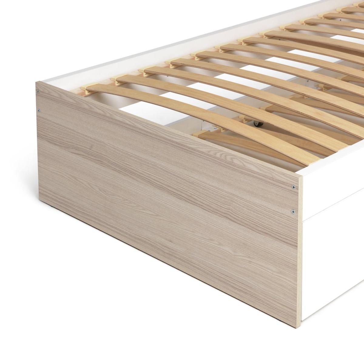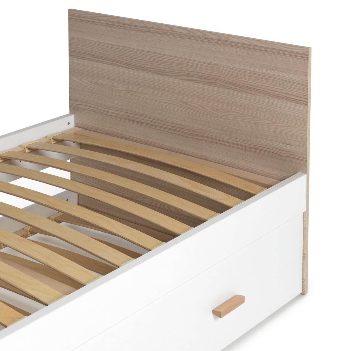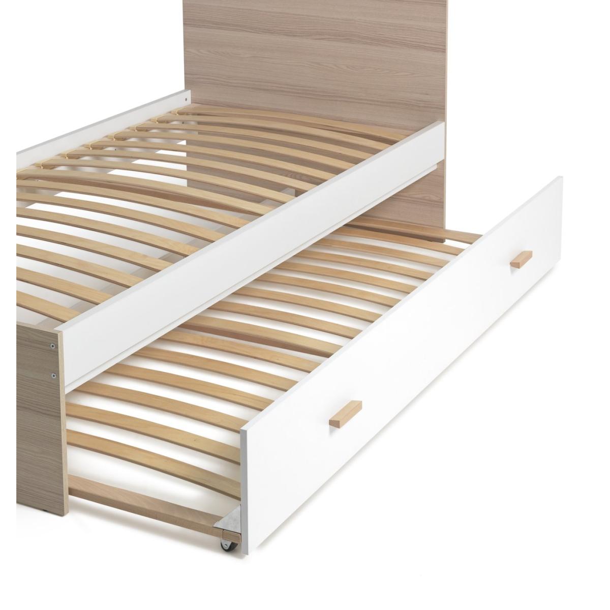 Need a bed for one, or perhaps two? No problem. Melby, our smart trundle bed, is here to save the day. With a streamlined silhouette and a grain wood effect finish, its seamless looks set the tone. And when you need that extra bed, just pull open the drawer at the bottom and voila. Perfect for when friends or family stay the night. Clever and convenient. This bedframe benefits from sprung wooden slats. These provide comfortable support for the mattress as well as allowing air to circulate.