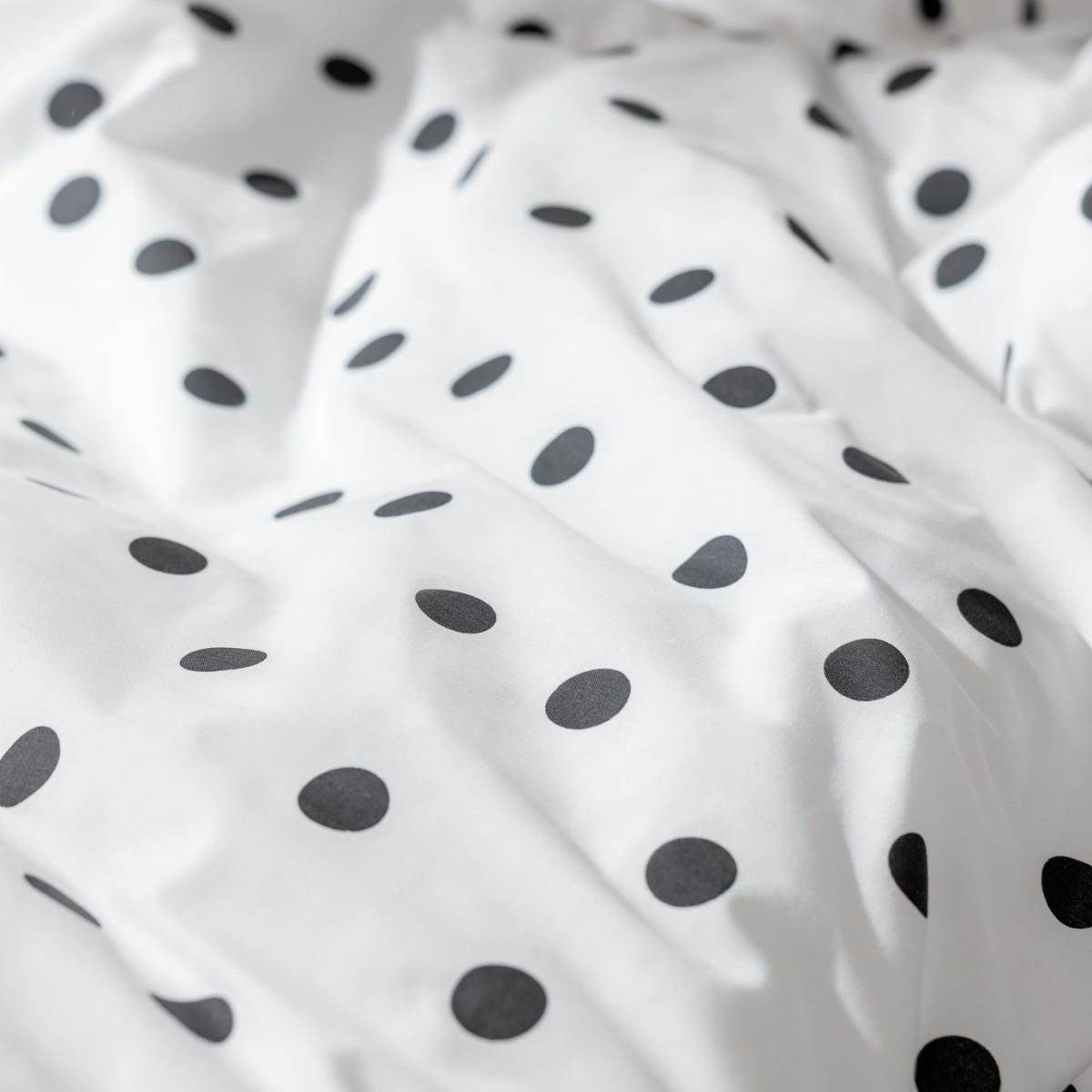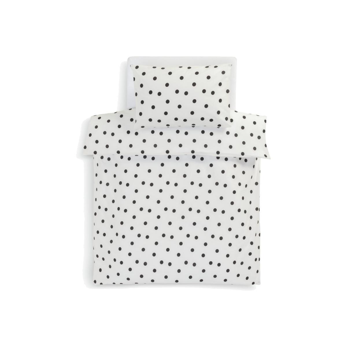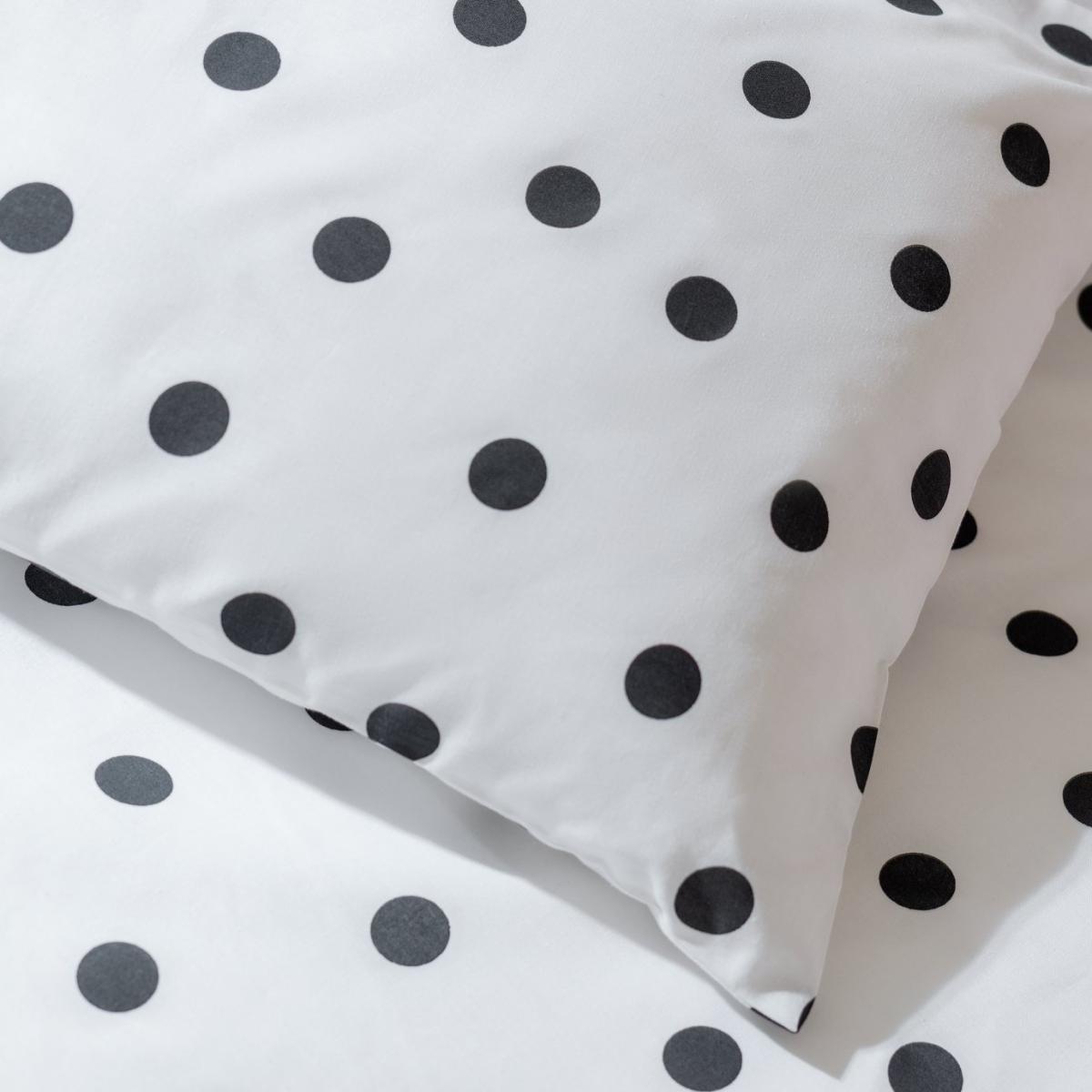 Snuggle them up in our cheerful dot print duvet set. Crisp white, with a dalmatian style spot, this black and white set will look great in a youngster's bedroom. Designed in a soft, easy-care cotton mix, there's a button fastening to make changing easy. Add their favourite toy and watch as they doze off in a delightfully, dotty dream. Pillow case Width: 40cm, Length: 60cm.