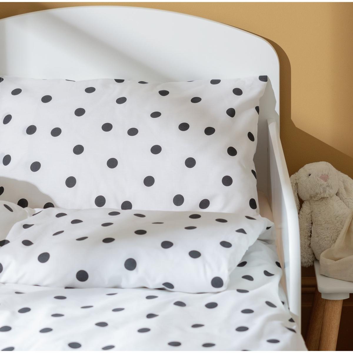 I love this spotty bedding for its classic monochrome look, making it versatile and easy to incorporate into various nursery or child's room themes. It works particularly well in modern, minimalist interiors or Scandinavian-style spaces where clean lines and neutral palettes dominate. For practicality, it’s a great choice because the simple black and white pattern can mask minor stains, which is ideal for lively little ones. To style it effectively, consider pairing it with solid colour accessories in grey, black, or soft pastel shades to keep the overall look fresh and uncluttered. Layering with textured cushions or throws can also add a touch of warmth and dimension without compromising the simplicity of the design.
