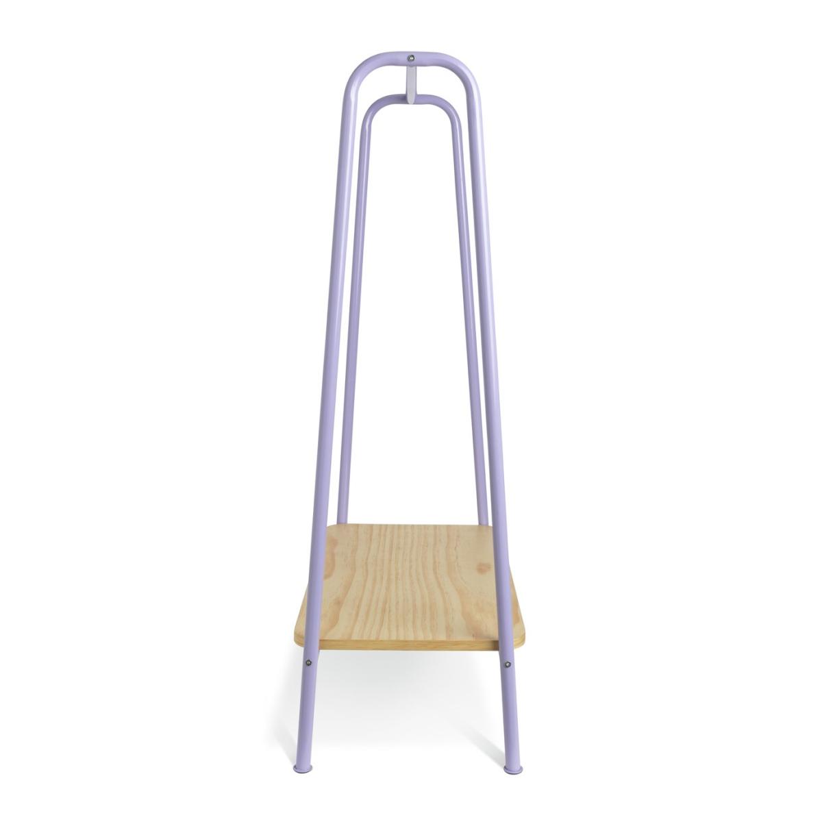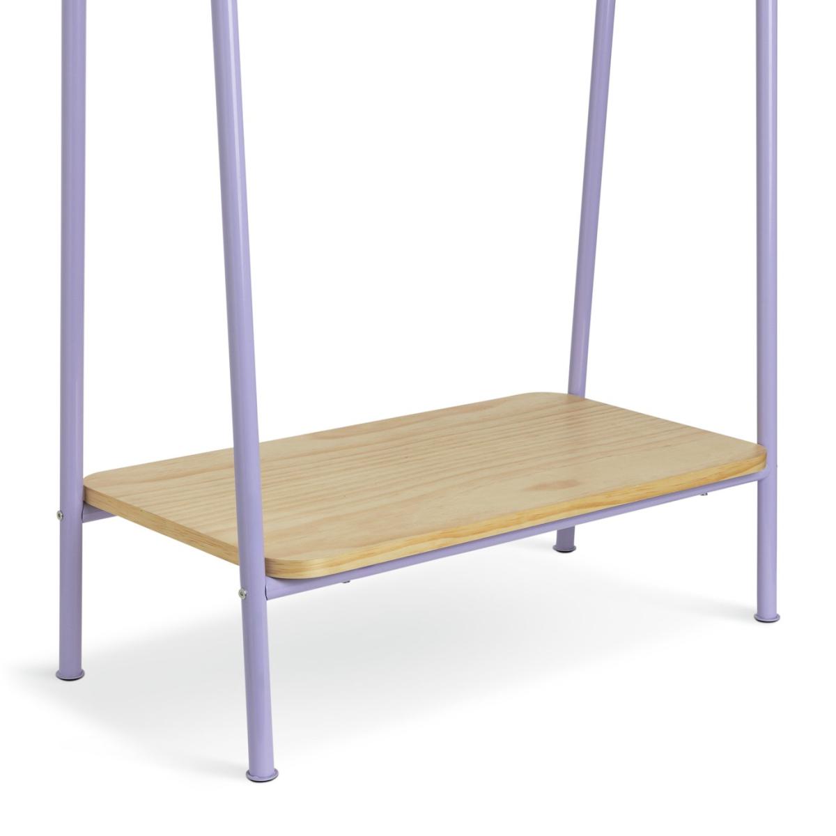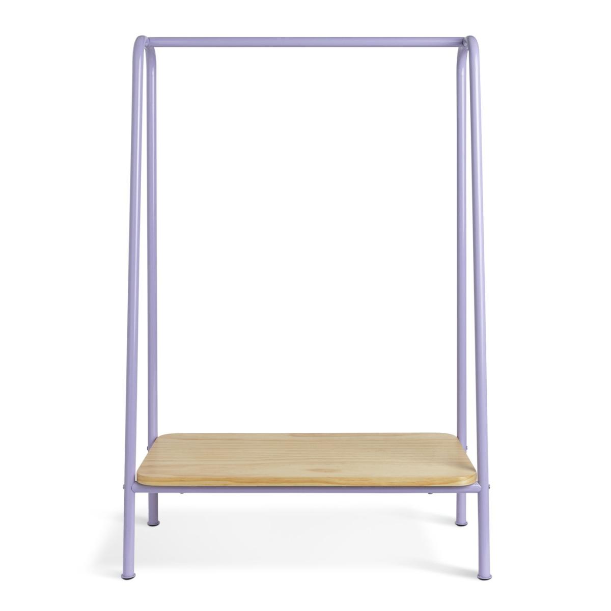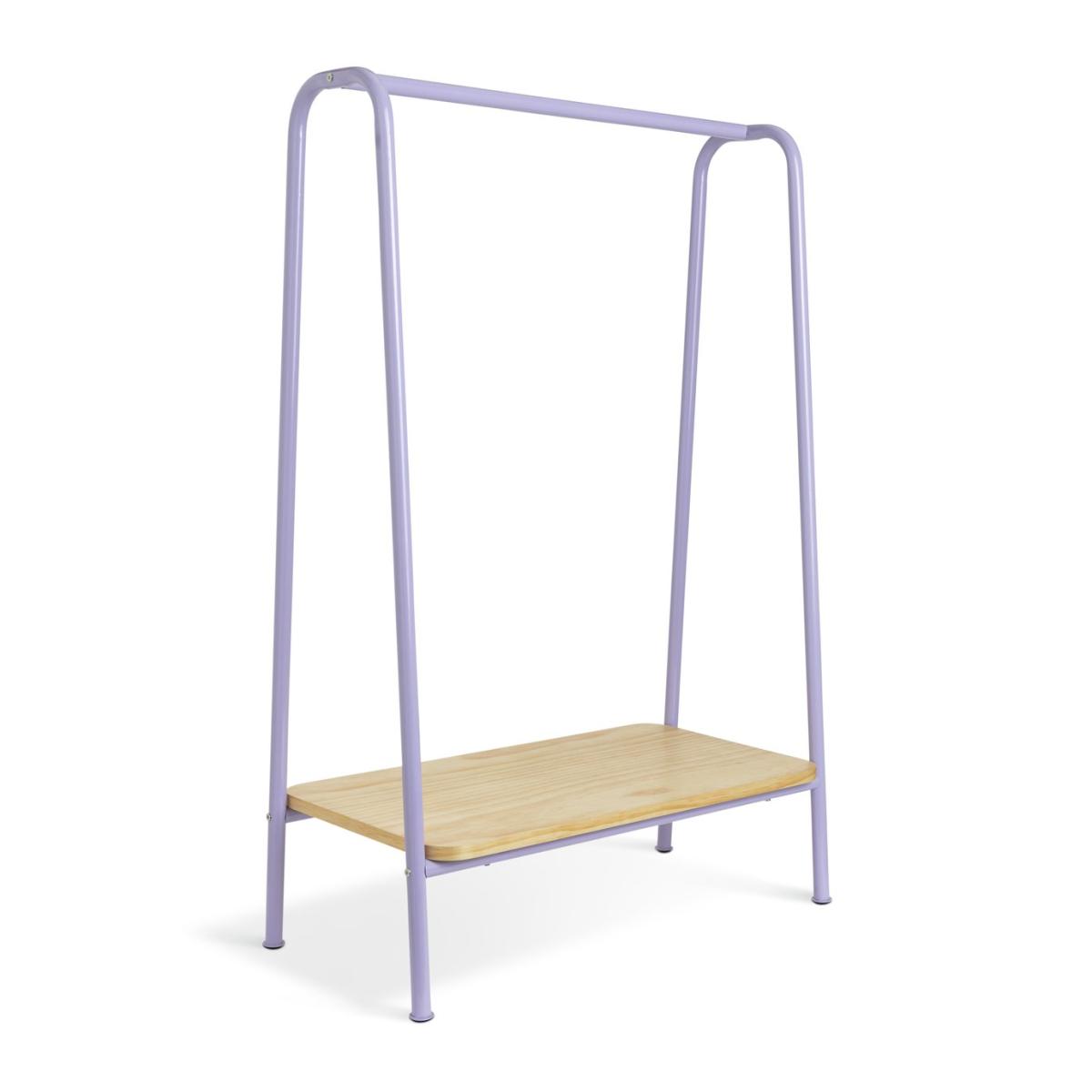 Industrial with a light, bright aesthetic. That's Monty. This clothes rail is just the thing for little fashionistas. The right height for your child to hang up or pick out their clothes, and a pine shelf below to stack foldables or stow away shoes. And as the lilac frame is made from steel, Monty's fresh good looks are here for the long haul. Size H120.6, W80cm. Rail weight capacity 2kg. Shelf weight capacity 10. Kg. Packed flat. FSC certified meaning the materials used for this product are responsibly sourced. Manufacturer's 1 year guarantee.