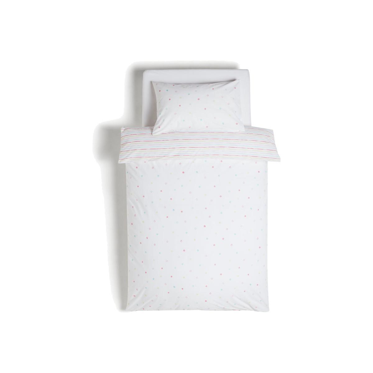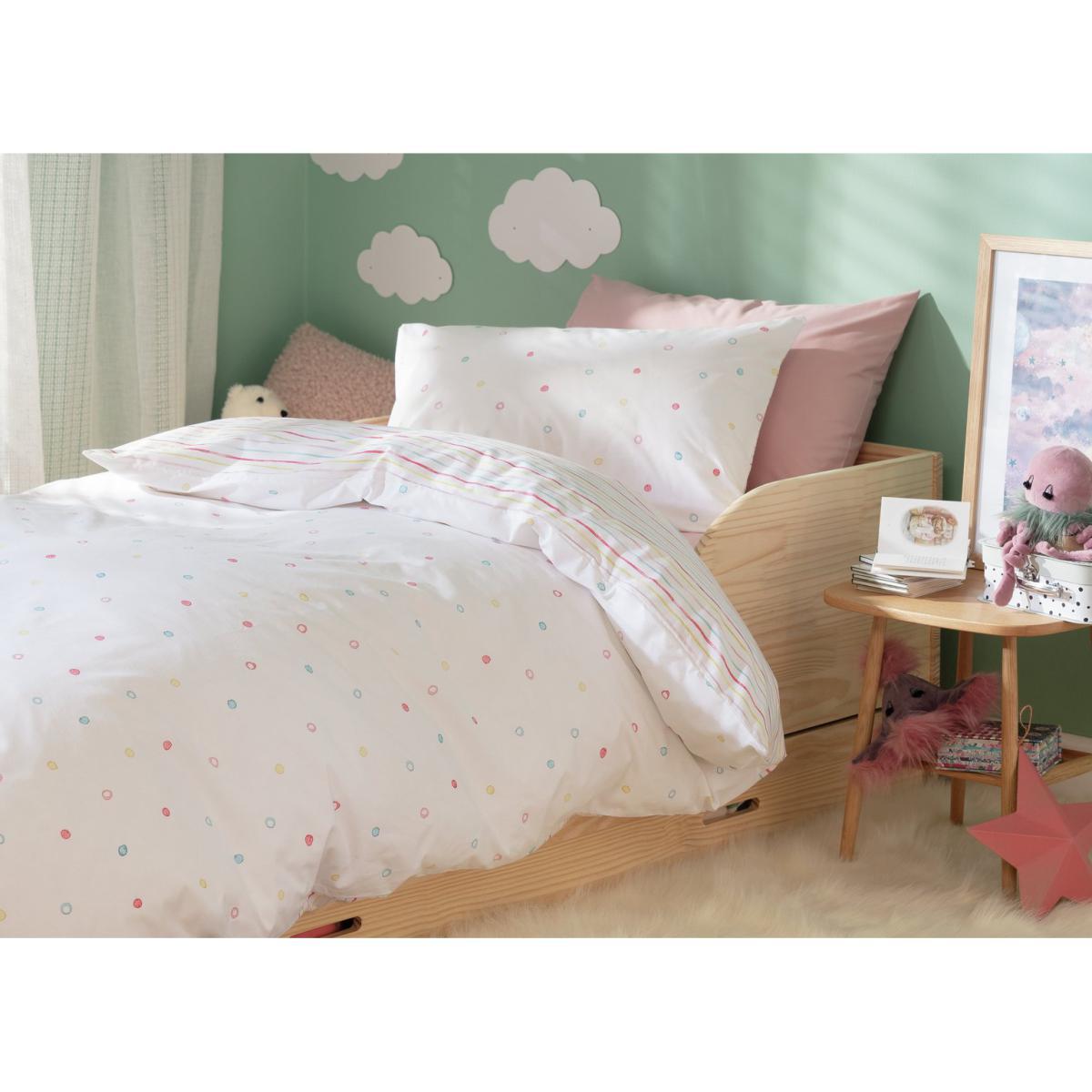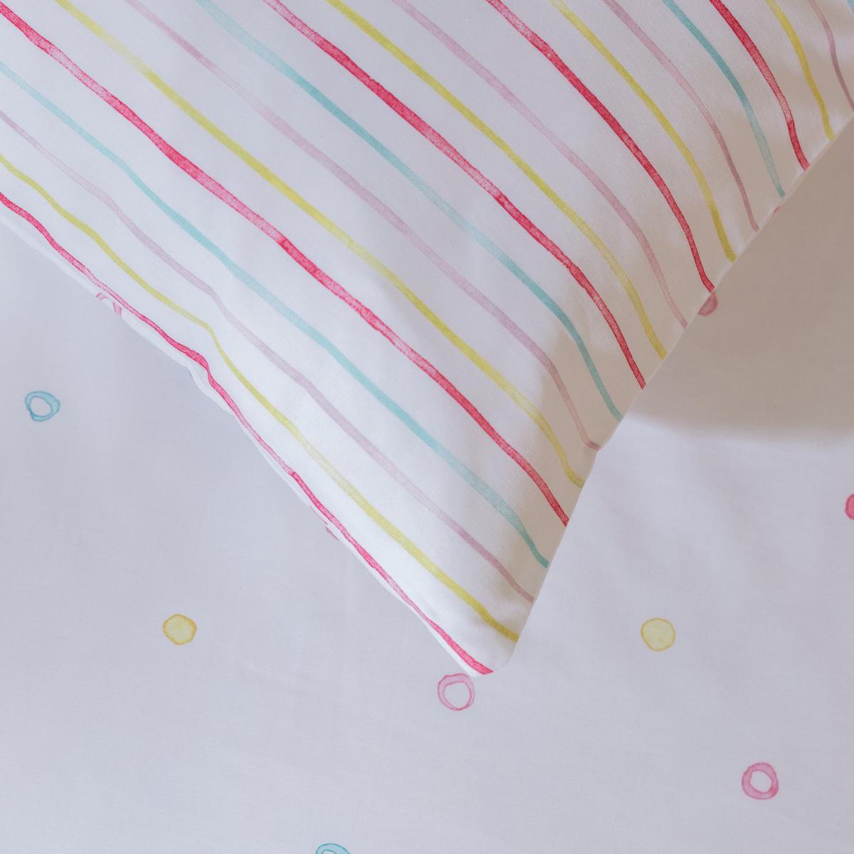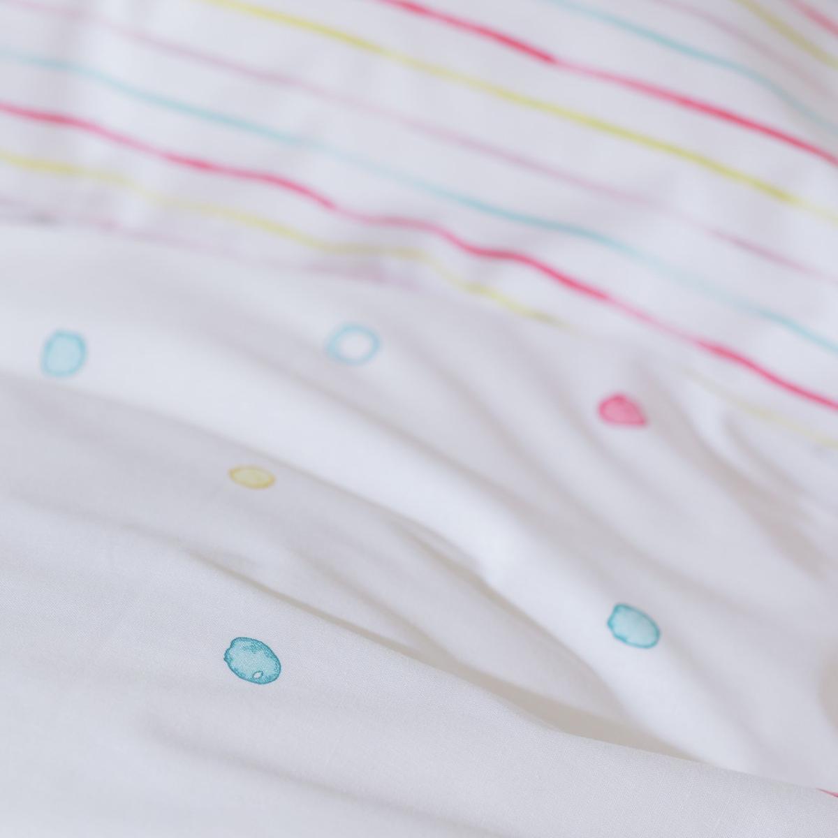 Spots and stripes. This reversible duvet set combines simple dots of colour on one side with a soft rainbow of stripes on the other. Set on a clean, white background we love the crisp and fresh feel of this design. Fab for brightening up a kids bedroom or making a guest feel truly welcome. Made from a comfy and easy to wash poly-cotton blend, the set includes a pillowcase and duvet with stylish button up fastening.