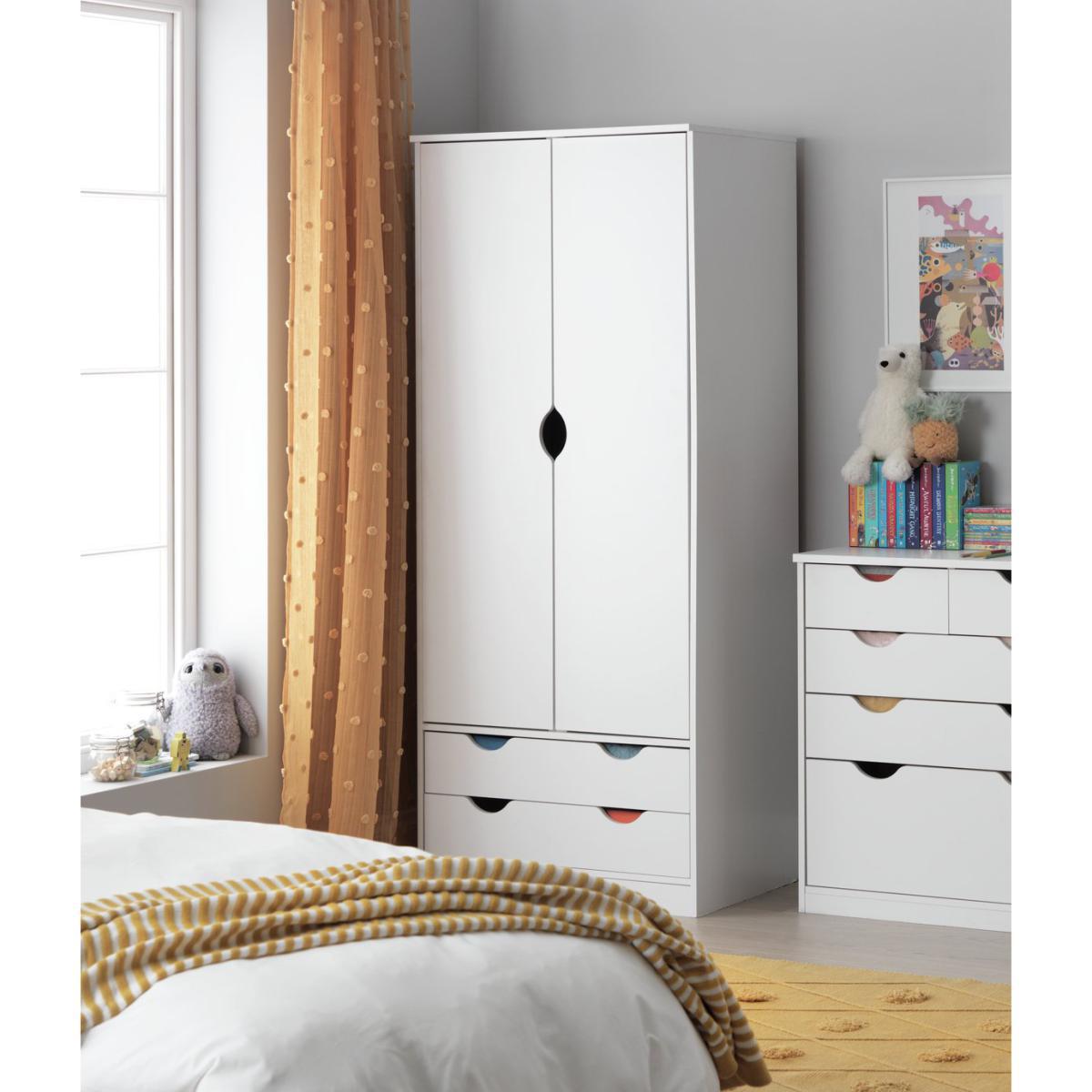 The Habitat kids wardrobe is a smart, versatile piece that works well in modern or Scandinavian-inspired children's rooms. I love its clean, white finish - it keeps the space feeling fresh and bright, making it easy to pair with colourful accessories or patterned textiles. Its practical design with doors and drawers offers ample storage, perfect for keeping bedrooms tidy and organised. Styling tips include adding colourful storage baskets inside or on top of the wardrobe to introduce a pop of colour, or pairing it with soft textiles like a textured rug or playful wall art to create a cosy, inviting atmosphere. It's a functional yet stylish choice that balances form and practicality effortlessly.