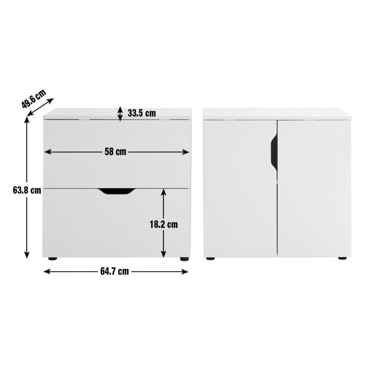 Stash kids' stuff away in ourbright white modular duo. The 2 door cupboard & 2 chest drawer is just the right height for youngsters. With a deep shelf inside there's plenty of room to store clothes and shoes. With everything within easy reach kids will love getting dressed on their own. Tuck away PJ's or toys in the matching double drawer unit. Smooth, easy to use cut-out handles bring a streamlined look to their space. Neat and tidy.
