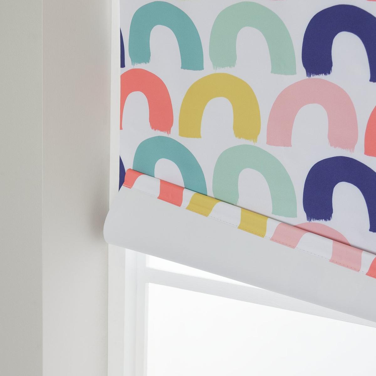 Brighten your child's room with our playful rainbow roller blind. Eye-catching and stylish, the cheerful design will put a smile on your face. The blackout fabric creates instant darkness and will help your child settle down when the nights are light. Features: Blackout blind. Multicoloured Rainbow. Automatic safety lock. Material: fabric. Polyoxymethylene string mechanism. Bottom rail material: PVC. Dimensions: Size W90cm, drop 160cm / W35.4in, drop 63in (including fittings). Size W86.5cm, drop 160cm / W34in, drop 63in (excluding fittings). Easily trimmed to size. General information: Tested and safe to the 2014 blind safety standards BS EN 13120. Fits inside or outside window recess or to wall. This blind comes with a child safety P clip. Includes fixtures; fittings and instructions. Wipe clean.