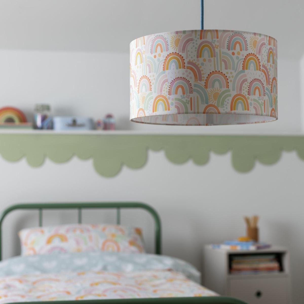 I love this rainbow printed drum shade for its playful yet versatile appeal, making it a great statement piece in a child's bedroom or playroom. The multicoloured design adds a cheerful touch that can brighten up more neutral interiors, while also complementing colourful or eclectic schemes. It's particularly effective when paired with simple furniture, allowing the shade's vibrant pattern to stand out. Practical styling tips include using it in combination with matching accessories or bedding to create a cohesive look, or as a focal point in a more subdued space to introduce personality. Its size makes it ideal for overhead lighting in younger rooms, ensuring a warm and inviting atmosphere.