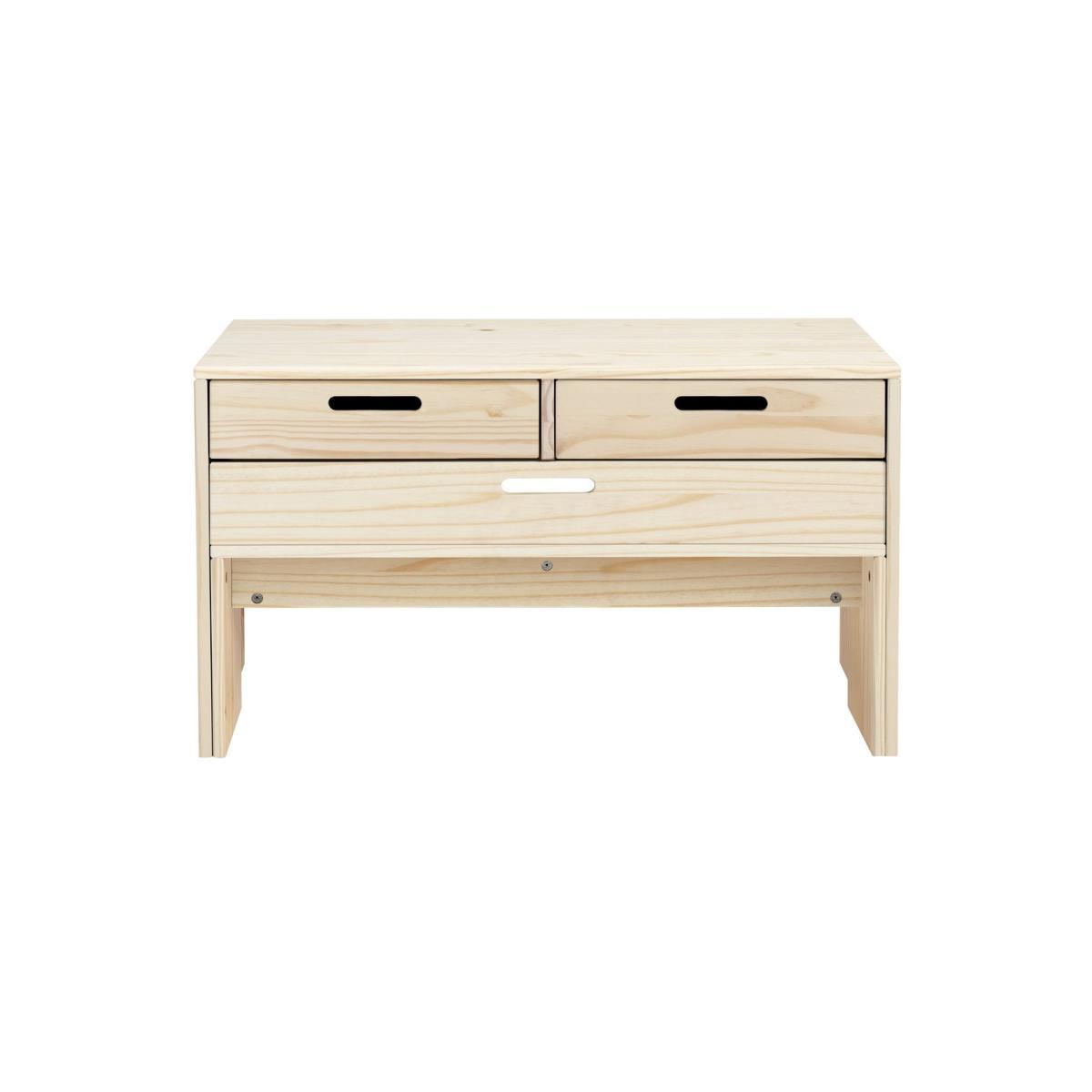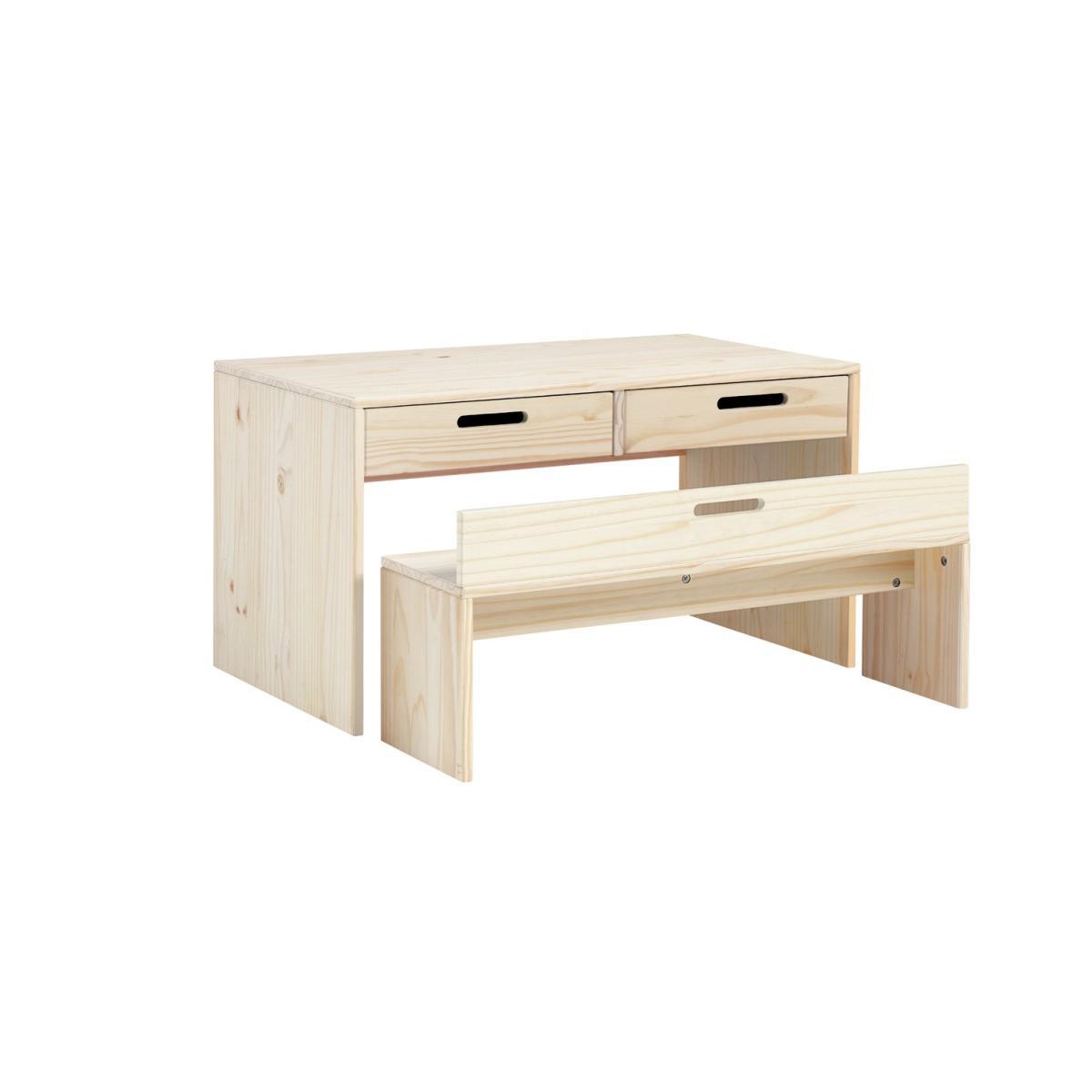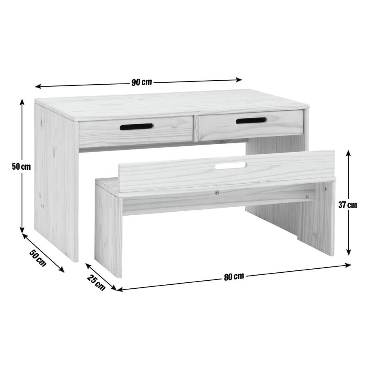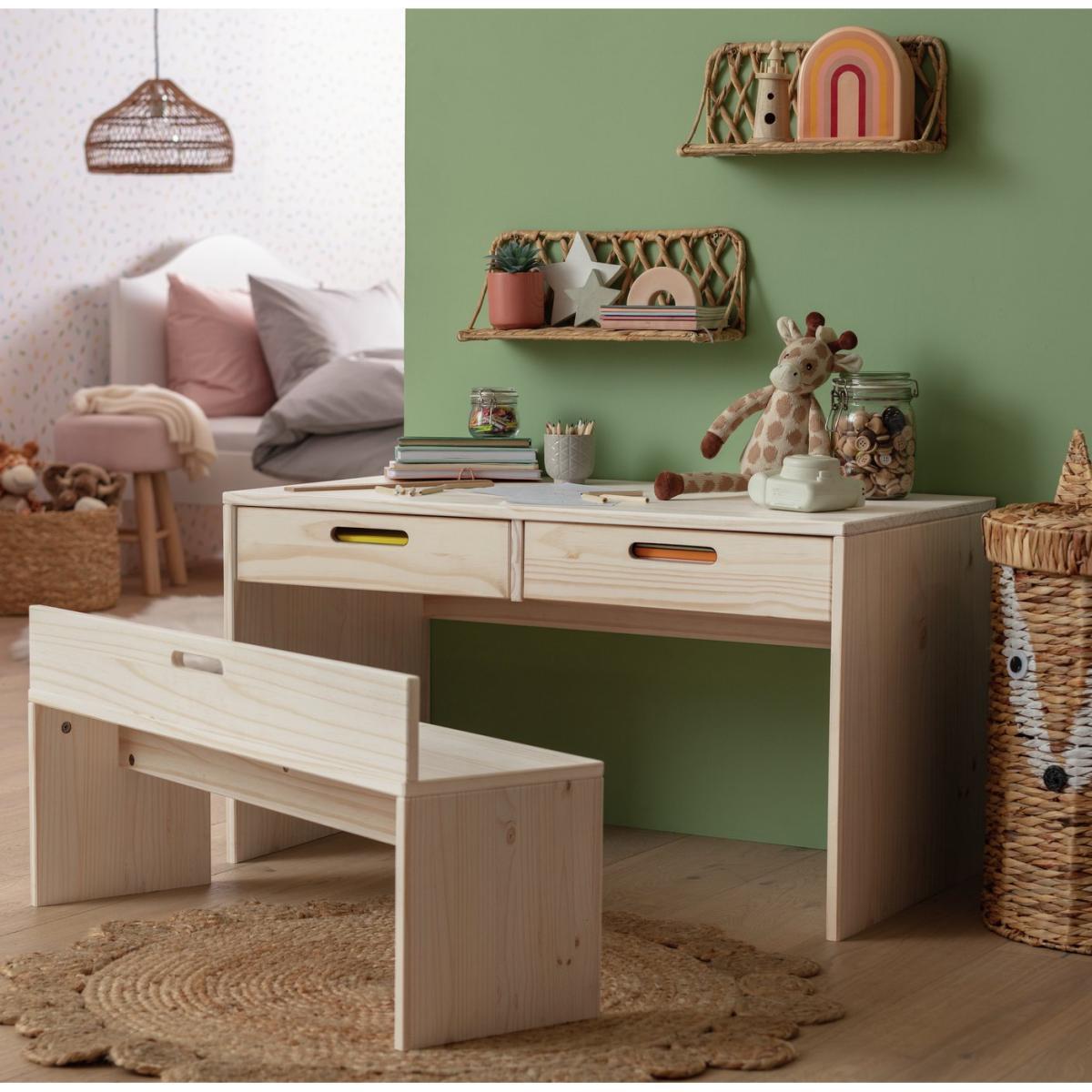 Colouring, crafts or homework. The Rico set provides space for the task at hand. A generous desk made from sturdy solid wood, there's plenty of room to let them explore their imagination. And the duo of drawers offer storage for stationery bits and bobs. A handy pew for 1 or 2, the matching bench slots in neatly underneath. Just the ticket for concentrating or creating.