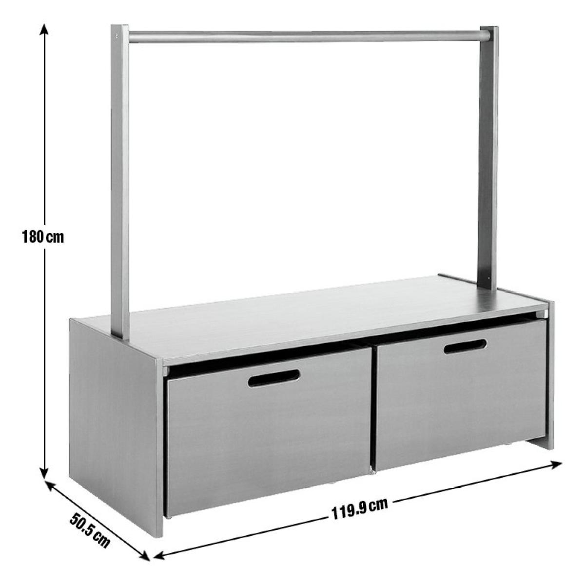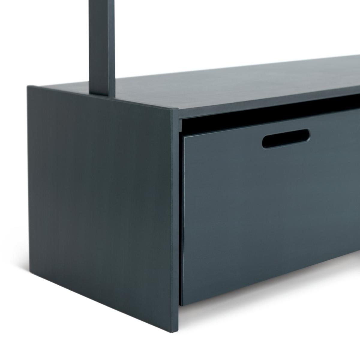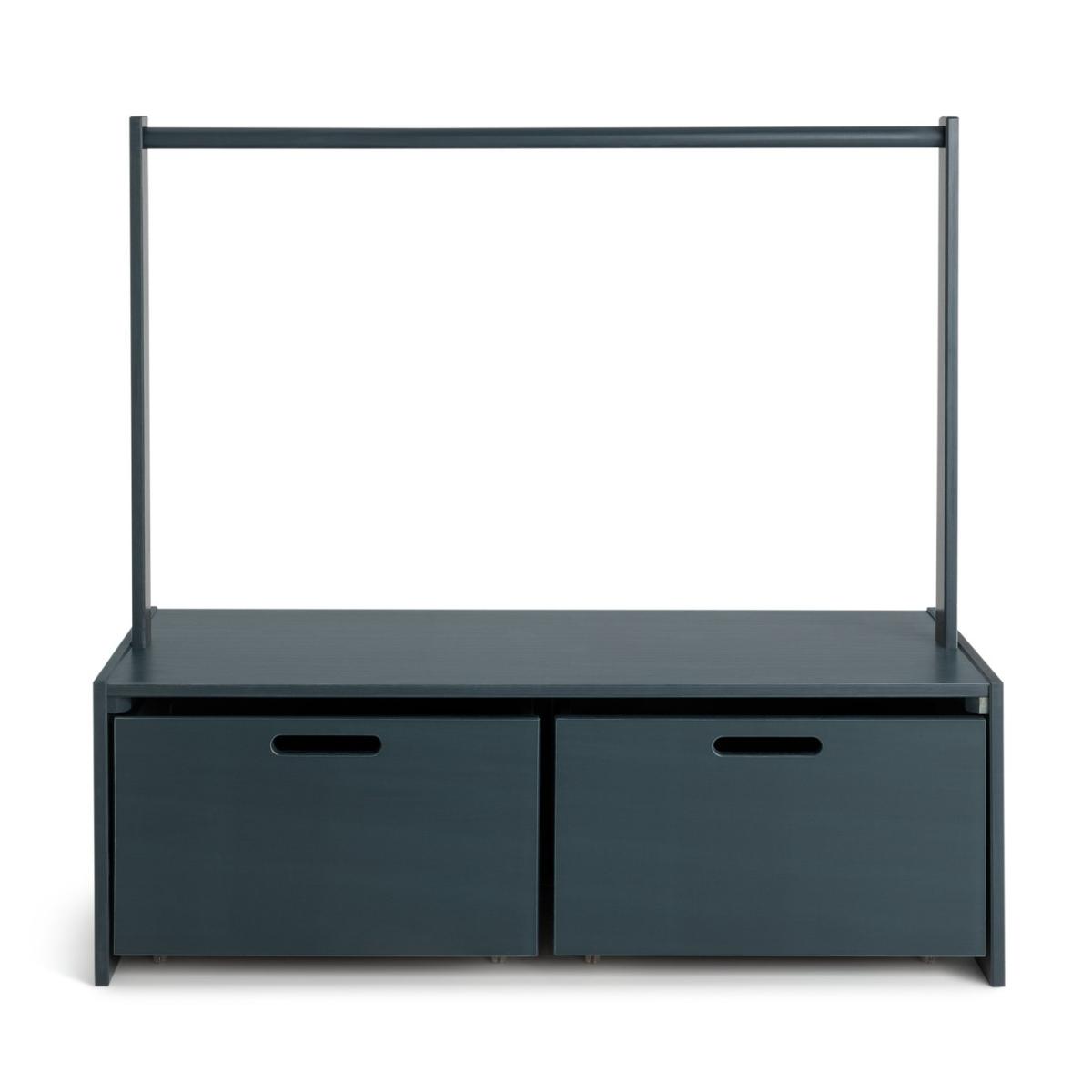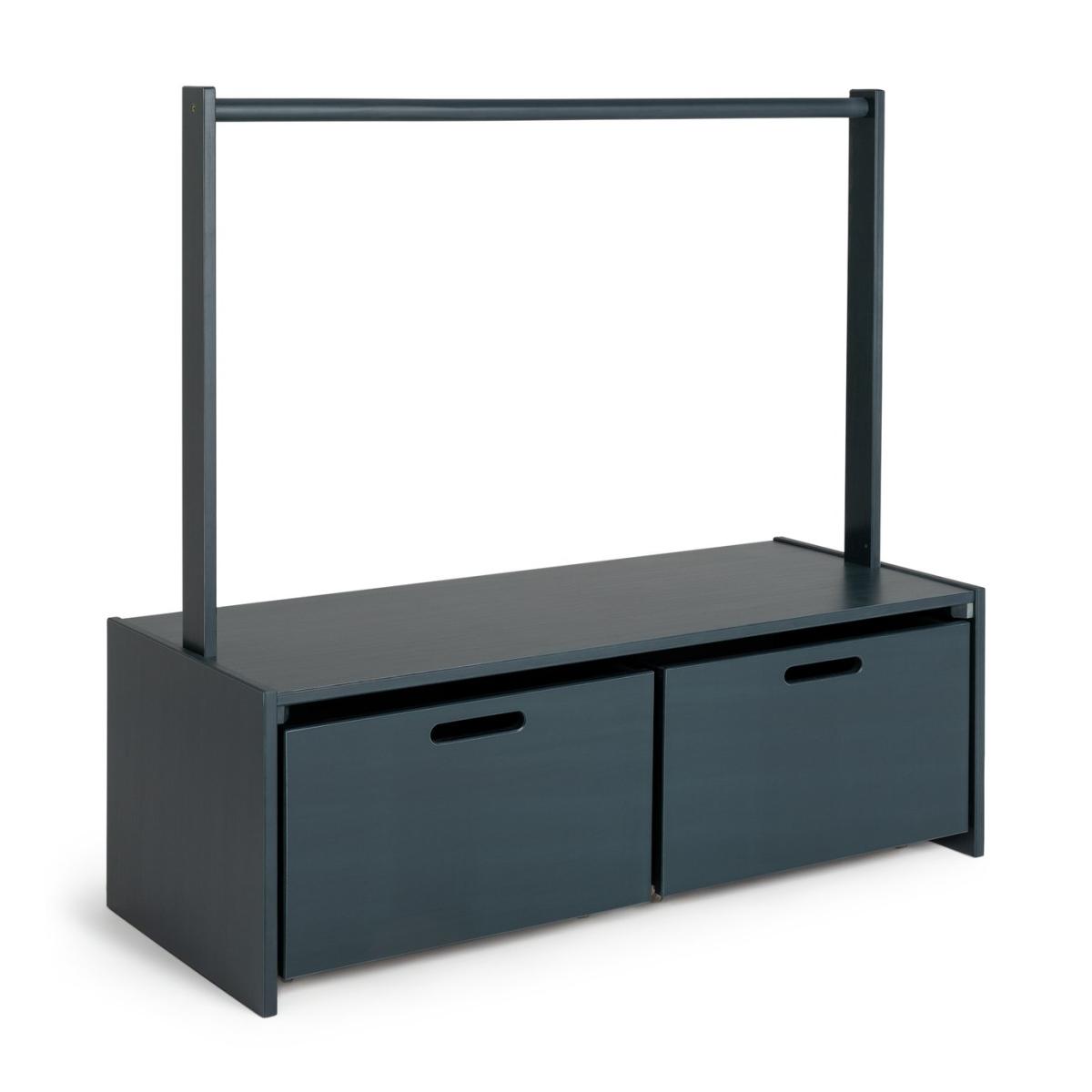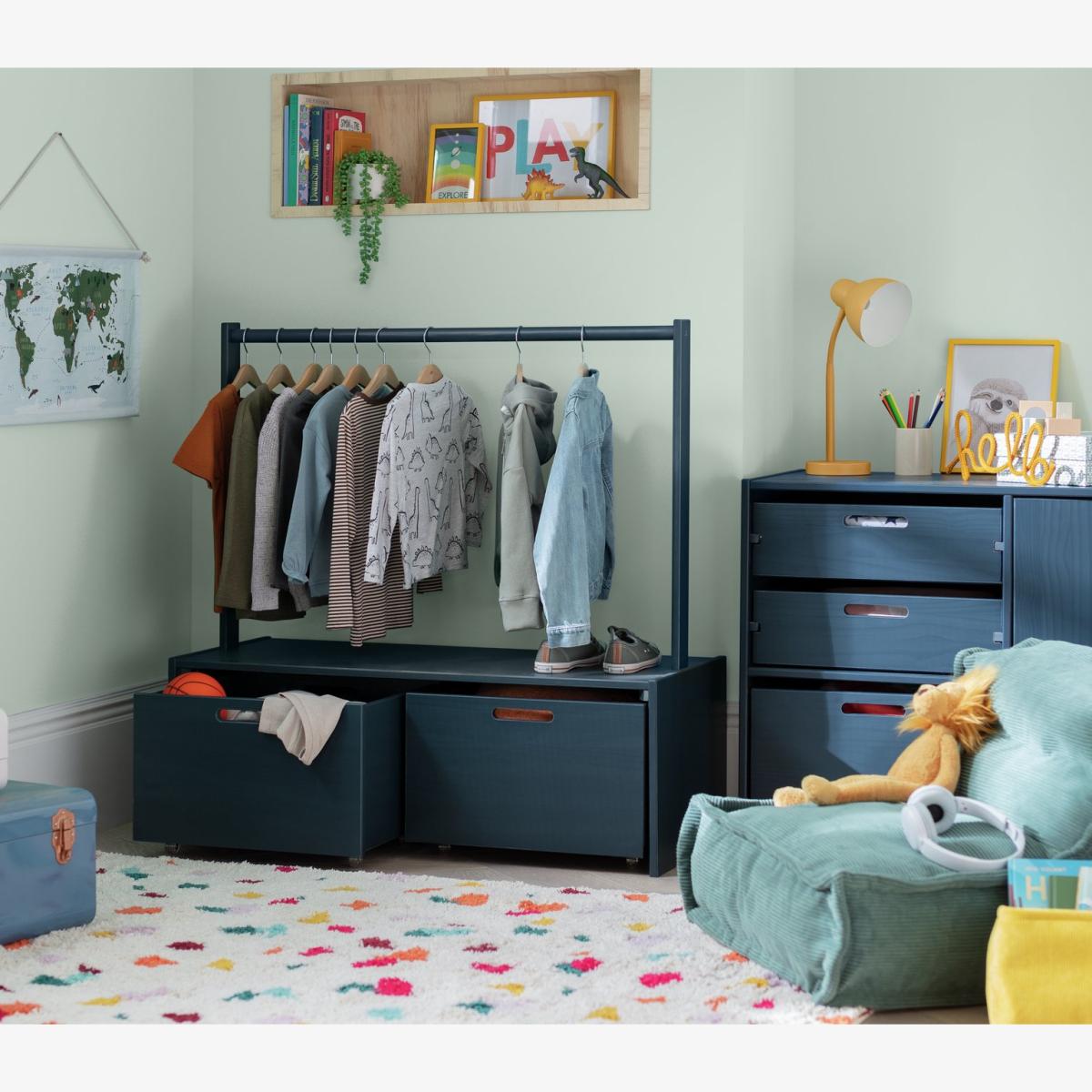 Super storage in open style. Let your little fashionista hang up all their fave clothes, line up their shoes and pack away their PJs and sports gear. With 2 spacious drawers, surface shelf and fixed rail it's a great one-stop solution. Made from solid wood in a calming dark blue finish. The drawers run on wheels, making them easy to slide open and shut. Mounted on wheels for easy movement. 2 storage drawers. Size H100, W100cm. Rail weight capacity 8kg. Shelf weight capacity 15. Kg. Packed flat. FSC certified meaning the materials used for this product are responsibly sourced. Manufacturer's 1 year guarantee.