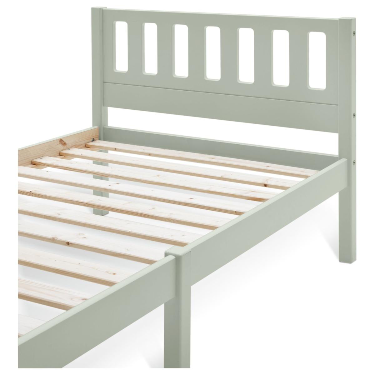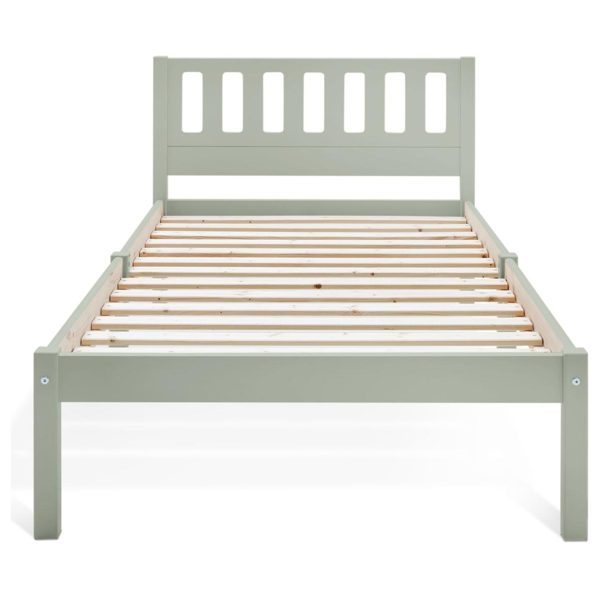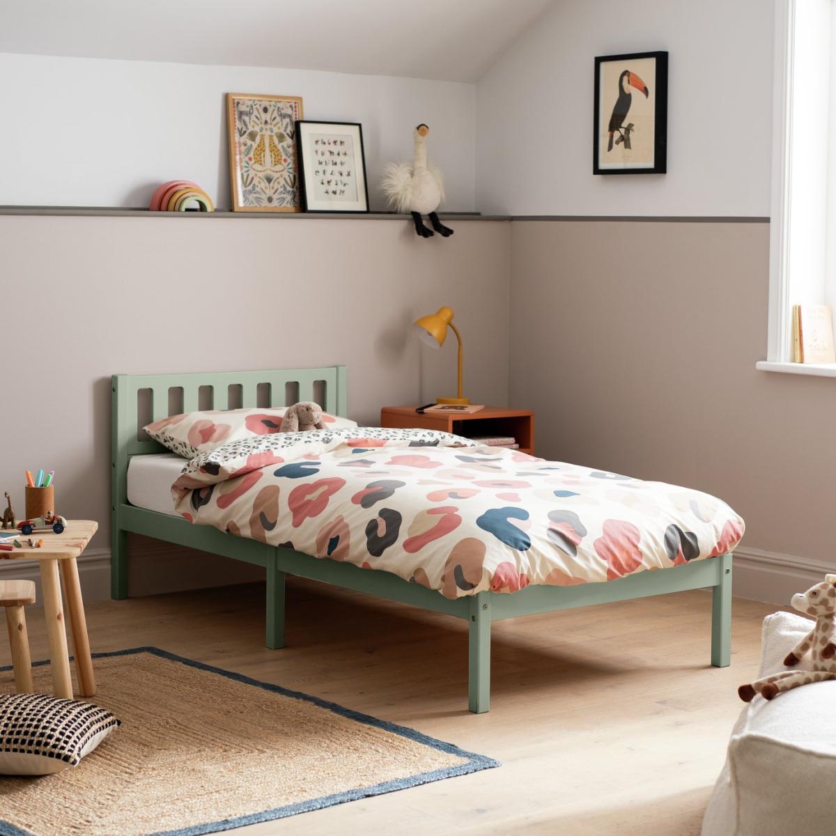 The Ronnie Single Bed is designed to handle the daily knocks and bumps of a child's room while maintaining its durability and charm. Featuring a sleek, contemporary style, it seamlessly grows with your child, making it a timeless addition to their space. Highly practical and stylish, this bed combines robust construction with a modern aesthetic, offering a perfect balance of elegance and functionality that suits both kids and teens alike. The Ronnie collection is ideal for stylish kids and complements any bedroom beautifully. Explore the full Ronnie range to complete your perfect look. Part of the Ronnie collection. Bed frame: Single bed. Green bed with a mdf and solid wood frame. Includes wooden slats. Packed flat - 2 people recommended. Maximum user weight 120kg. For ages 4 years and over. Suitable for adult use (safety tested to 100kg). Dimensions: Frame size L195.3, W96.3, H76.7cm. Package dimensions: Package 1 size H97, W41.8, D11.9cm. General information: Manufacturer's 2 year guarantee.