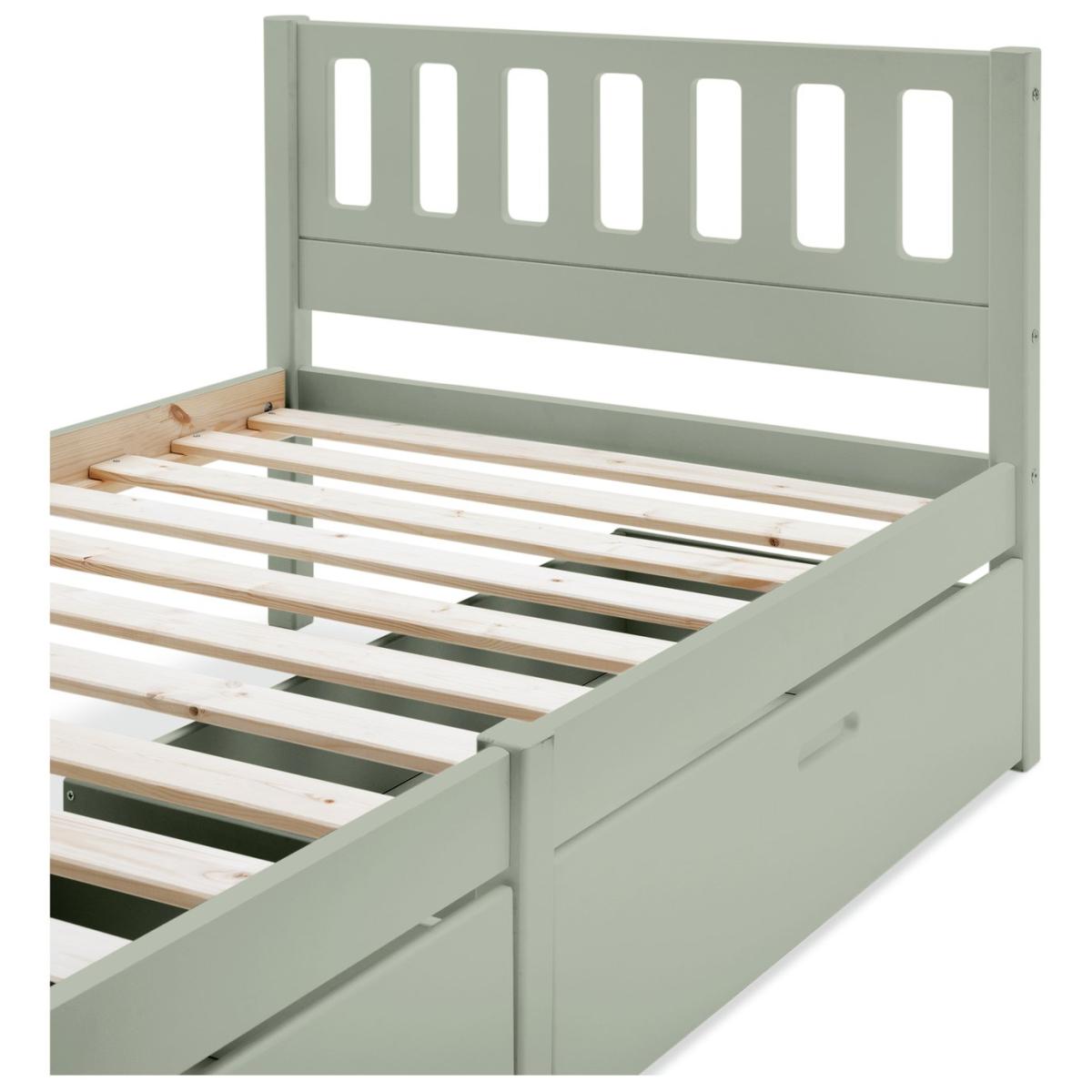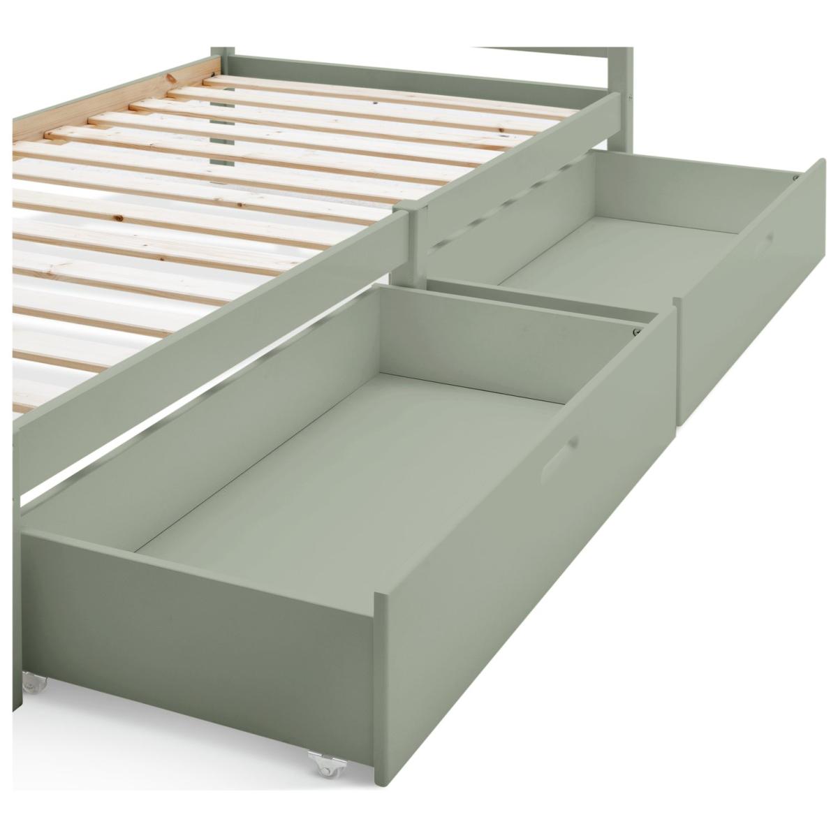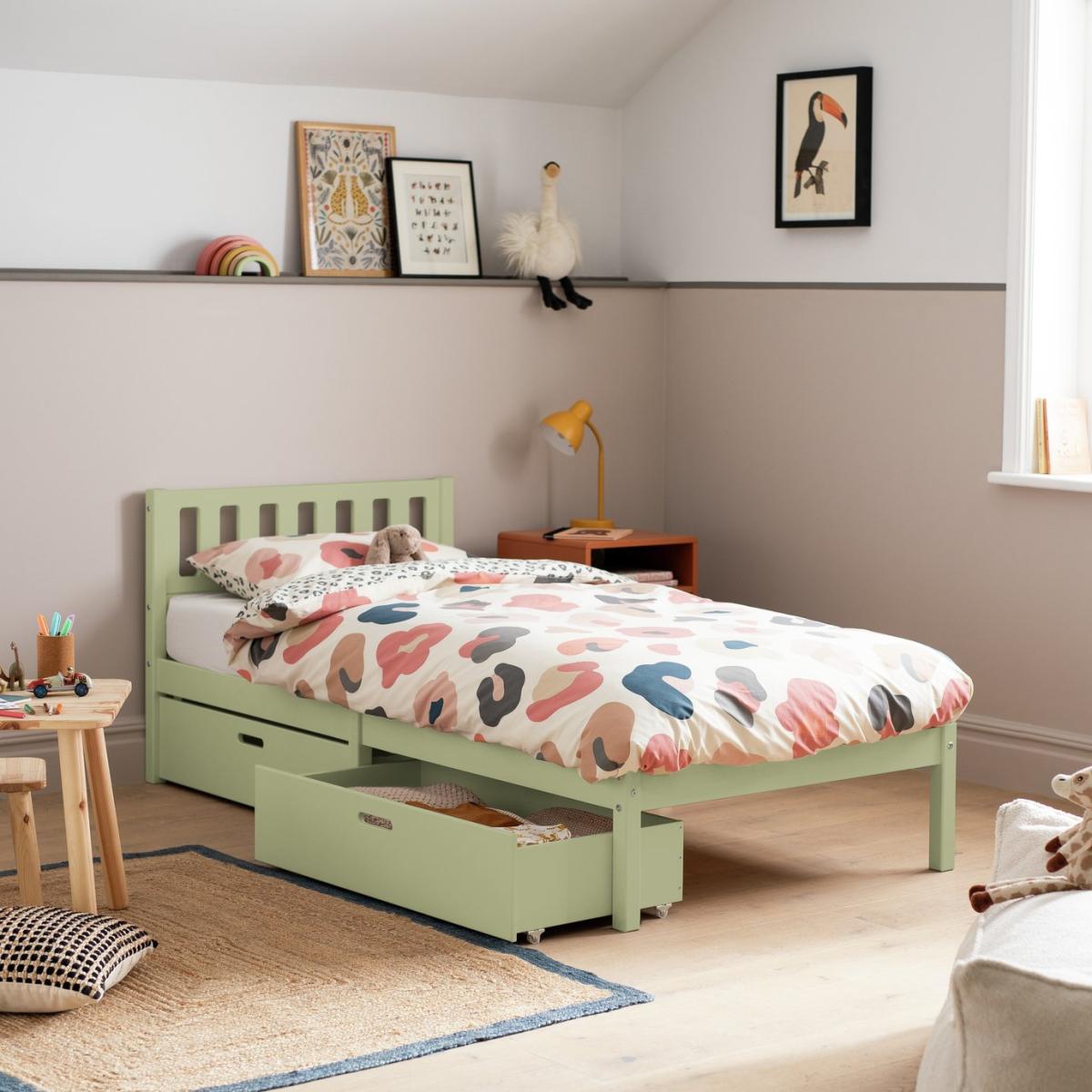 The Ronnie Single Bed and Drawers is built to withstand the daily wear and tear of a child's room while retaining its charm. With a sleek, contemporary design, it adapts as your child grows, offering long-lasting appeal. Featuring two spacious storage drawers, it combines practicality with style, providing ample room for keeping essentials organised. This bed blends durable construction with a modern aesthetic, offering the perfect mix of elegance and functionality for both kids and teens. The Ronnie collection is ideal for stylish kids and complements any bedroom beautifully. Explore the full Ronnie range to complete your perfect look. Part of the Ronnie collection. Bed frame: Single bed. Green bed with a mdf and solid wood frame. Includes wooden slats. Packed flat - 2 people recommended. Maximum user weight 120kg. For ages 4 years and over. Suitable for adult use (safety tested to 100kg). Dimensions: Frame size L195.3, W96.3, H76.7cm. Drawer size H23, W90.6, D46.5cm. Package dimensions: Package 1 size H97, W41.8, D11.9cm. Package 2 size H99.4, W45.8, D6.1cm. General information: Manufacturer's 2 year guarantee.