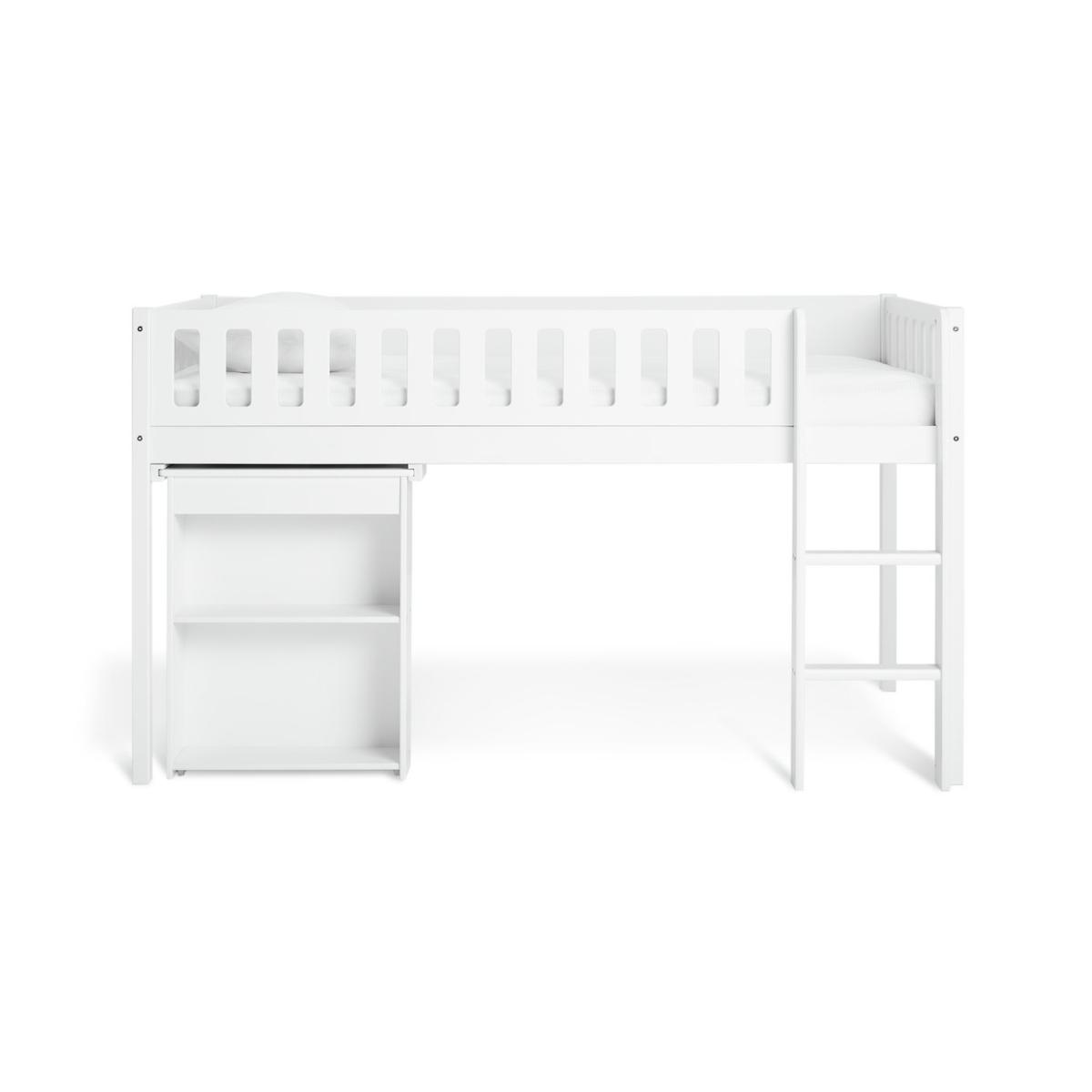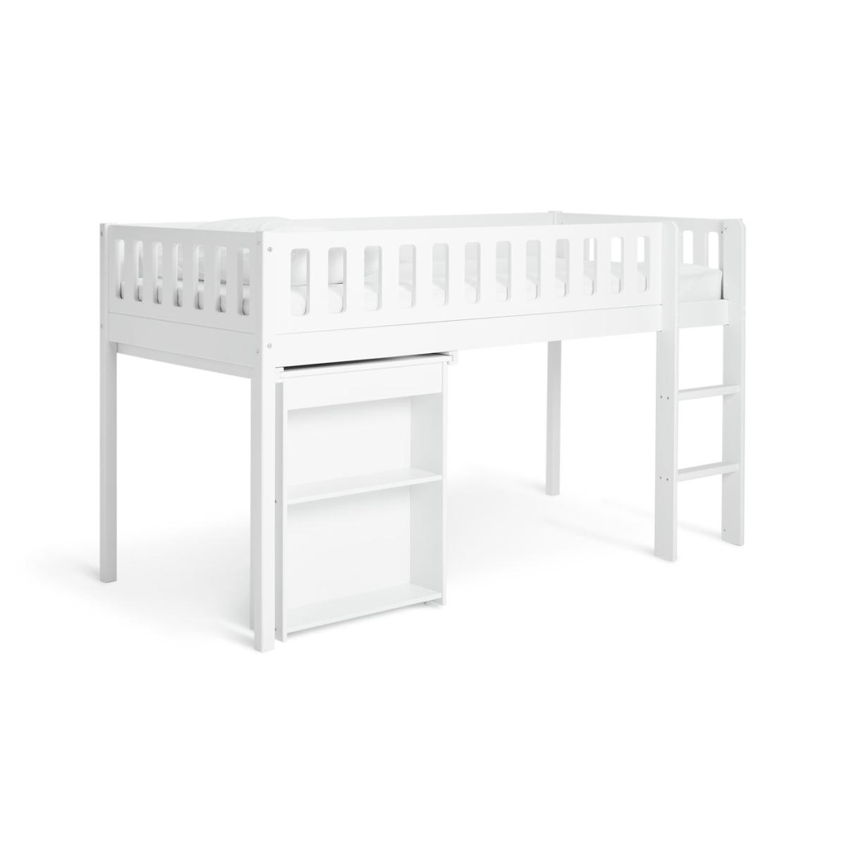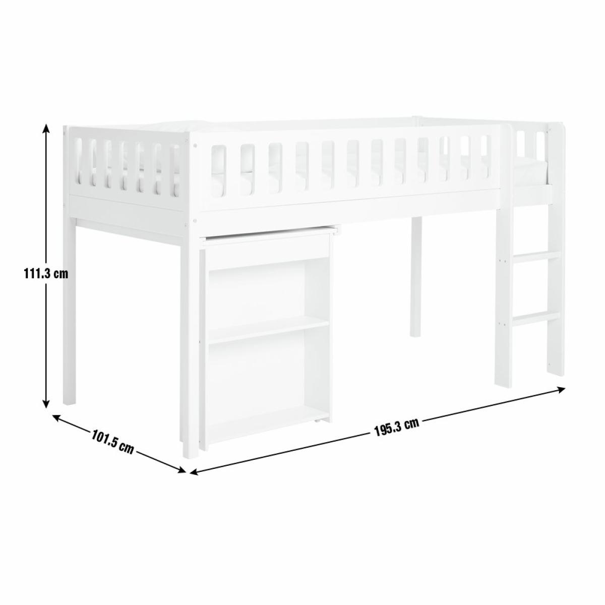 Sleep. Play. Create. The Ronnie midsleeper is a cool pick for growing kids. Made from solid wood with a fresh white finish, it's built for busy days and restful nights. A handy pull-out desk with side shelves creates a cosy spot for crafts or homework. And when you need the floor space, it simply tucks neatly away again. Plus, the raised design leaves plenty of room underneath for toy boxes or extra storage. Smart, simple and made for everyday adventures. Part of the Ronnie collection. Sleeper: Single bed. White bed with a mdf and solid wood frame. Includes wooden slats. Packed flat. WARNING "This product must be attached to a wall or building structure". Ladder can be positioned either side of the bed. Suitable for adult use (safety tested to 100kg). Mattress: For safety, maximum depth of mattress to be used is 16cm. Dimensions: Safety rail height 32cm. Frame size L195.3, W101.5, H111.3cm. Clearance between floor and underside of bed 74.6cm. Desk size H73.5, W60, D89cm. Package dimensions: Package 1 size H13, W37.5, D192.5cm. Package 2 size H7.3, W56.4, D105.6cm. General information: Manufacturer's 2 year guarantee.