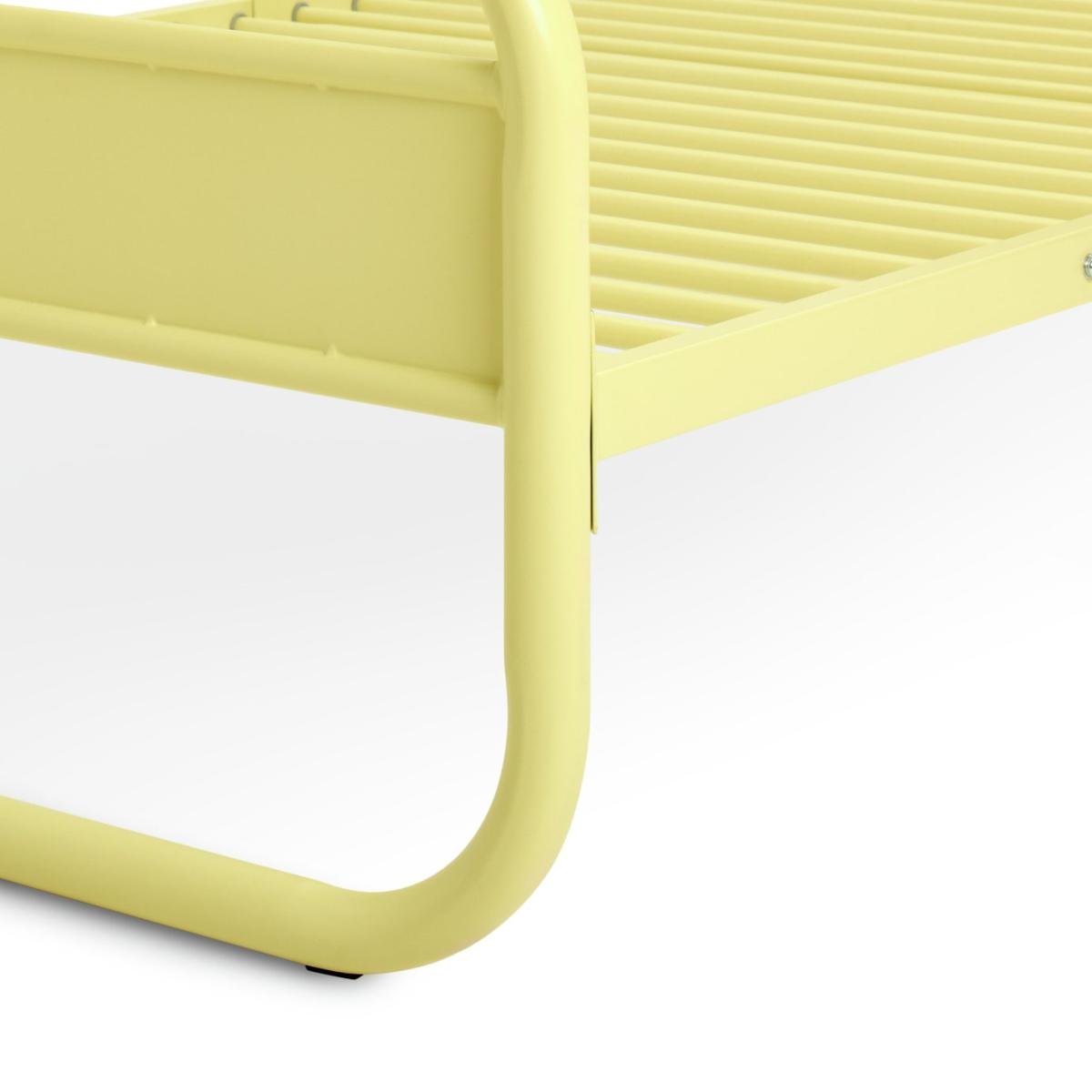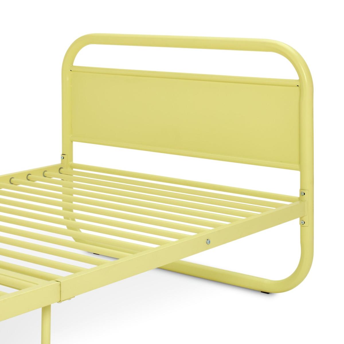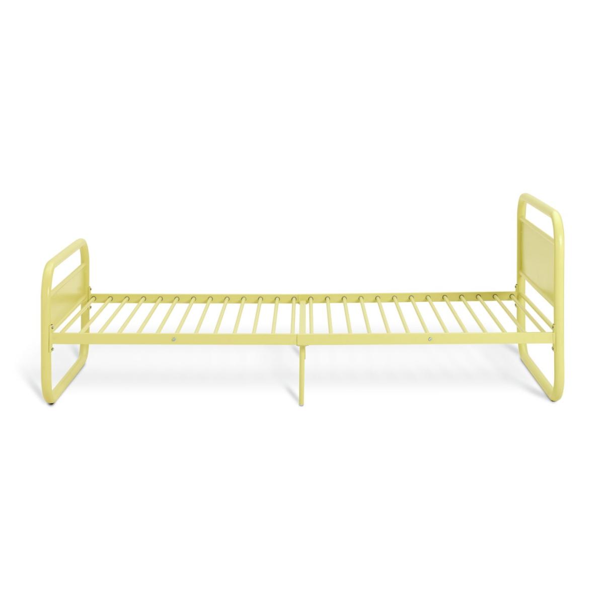 Sleep easy. Rory is a modern, simple and space-saving single sunny yellow bedframe. With retro looks, it works well for students, children and spare rooms. Both lightweight and strong, it's formed from rounded tubular steel and has a robust metal slatted base for mattress support. Part of the Rory collection. Includes metal slats. Size W96.5, L197, H76cm. For ages 4 years and over. Weight 21.3kg. Self-assembly. Fits single size mattress. Mattress not included. Suitable for adult use (safety tested to 100kg). Self assembly: 2 people recommended.