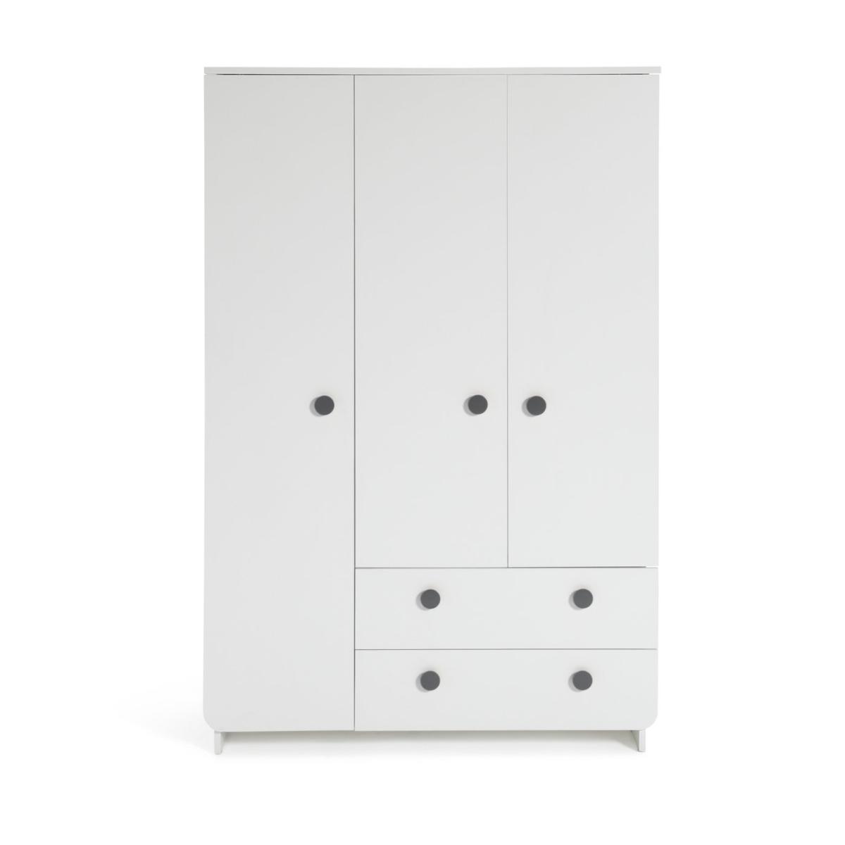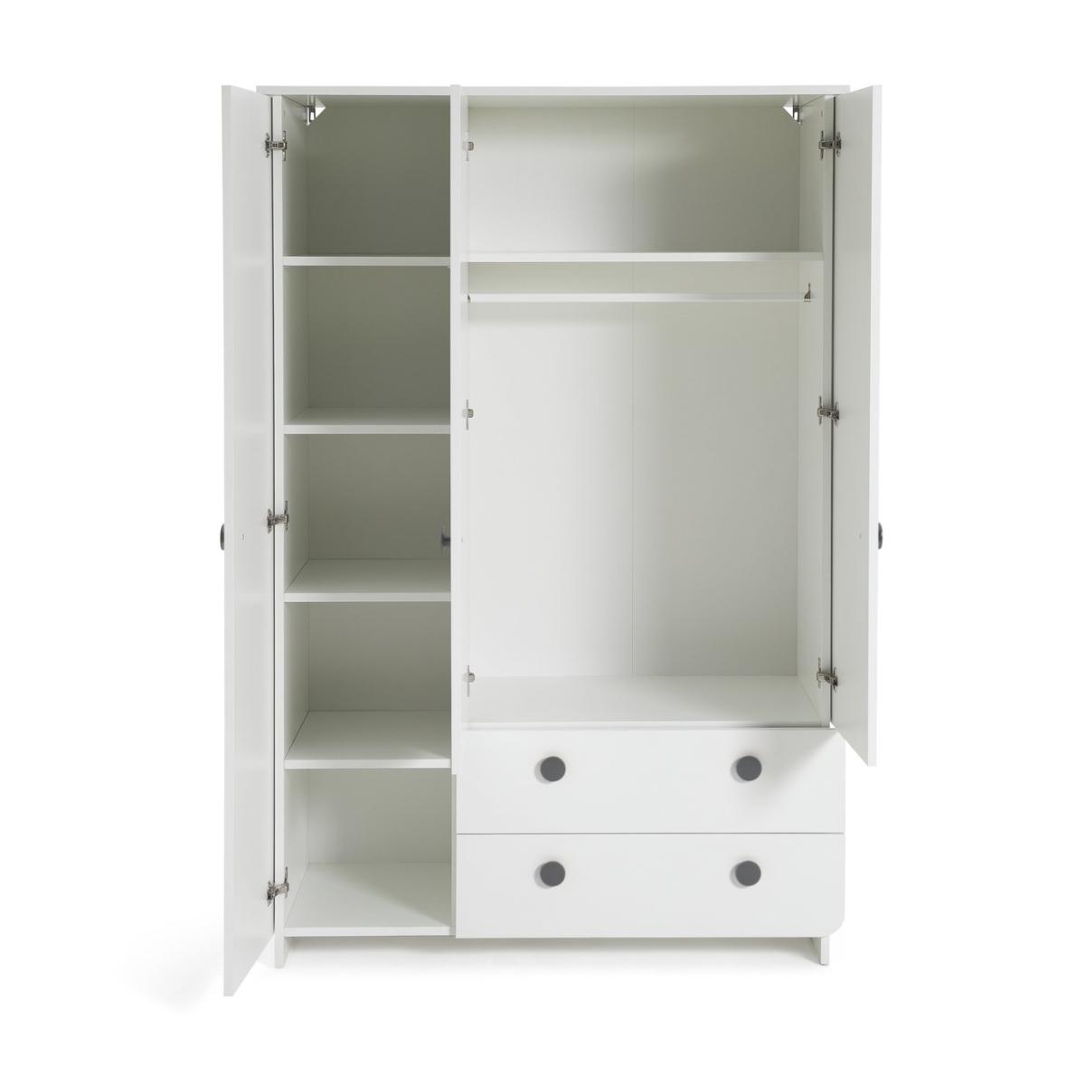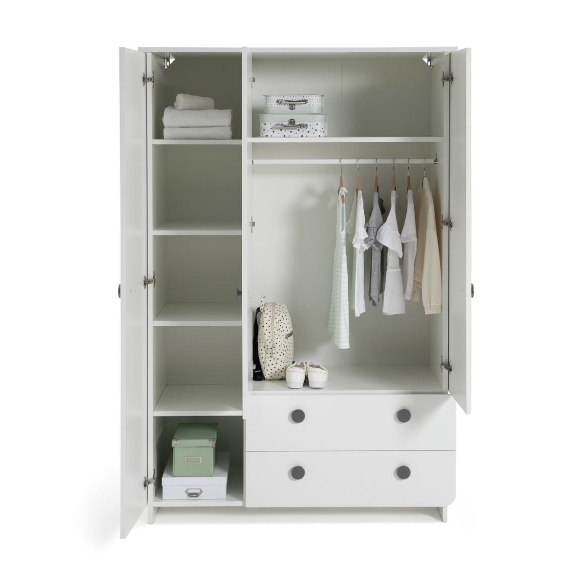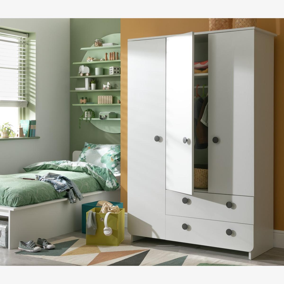 Our 3 door kids' wardrobe is a champion at tackling clutter. In fresh white with deep grey handles, it's a classic option that brings a contemporary touch. And it offers plenty of ways to get organized. Hang tops, bottoms, jackets and coats on the fixed hanging rail. Smalls and socks go in the 2 wide easy glide drawers. And fold away t-shirts, jumpers and pop them on the deep shelves. And there's still room for shoes and a favourite toy or two. Smart storage galore. It's a yes from us.