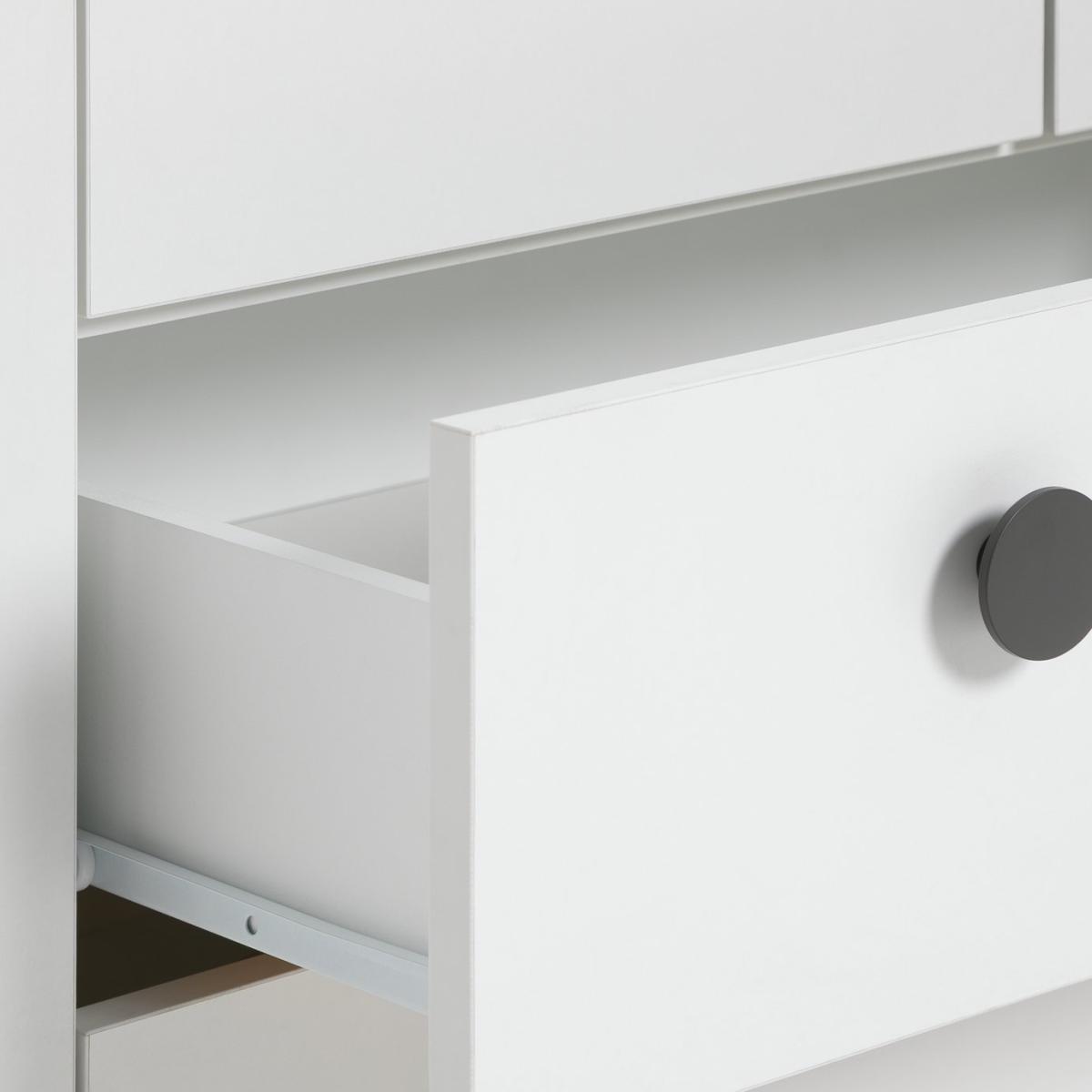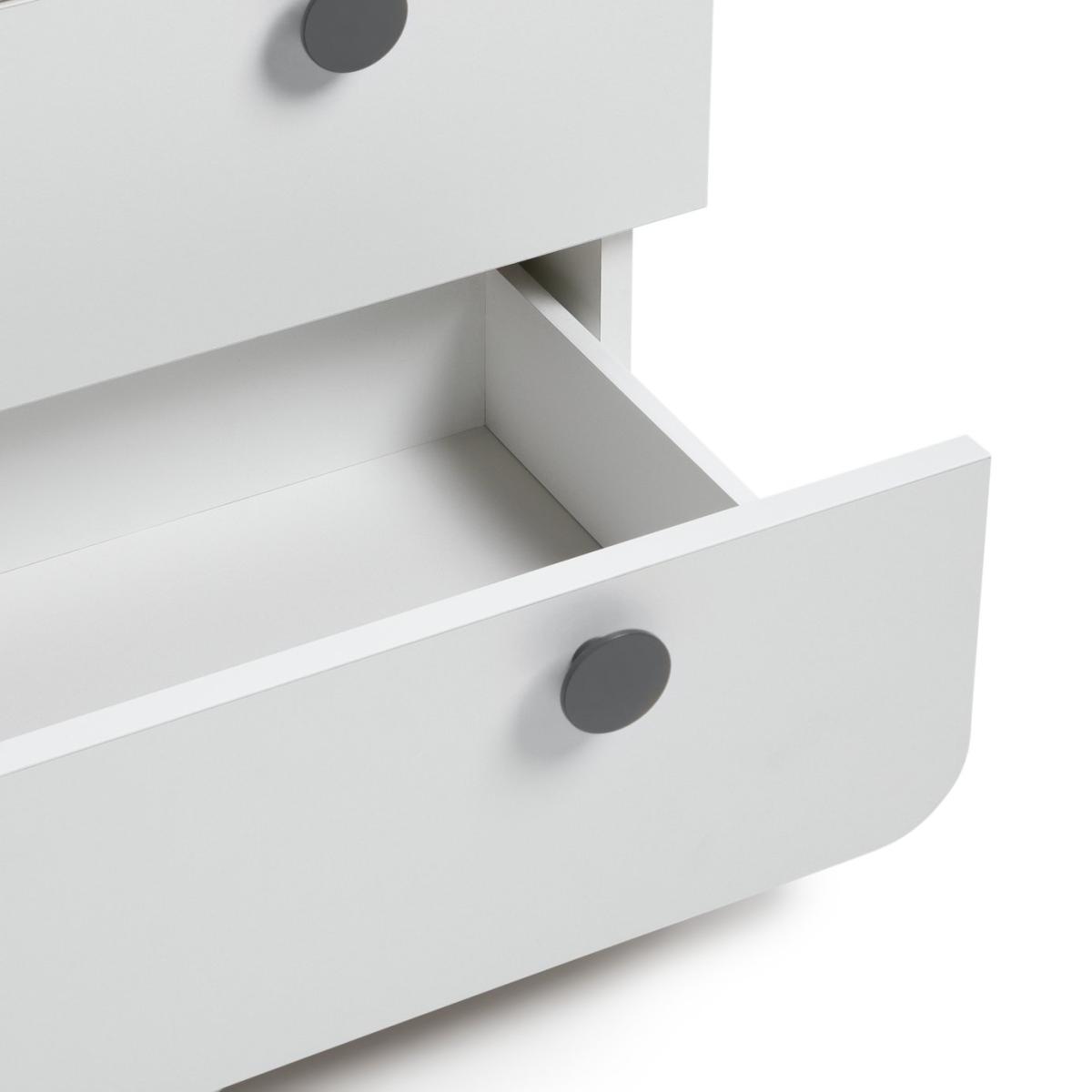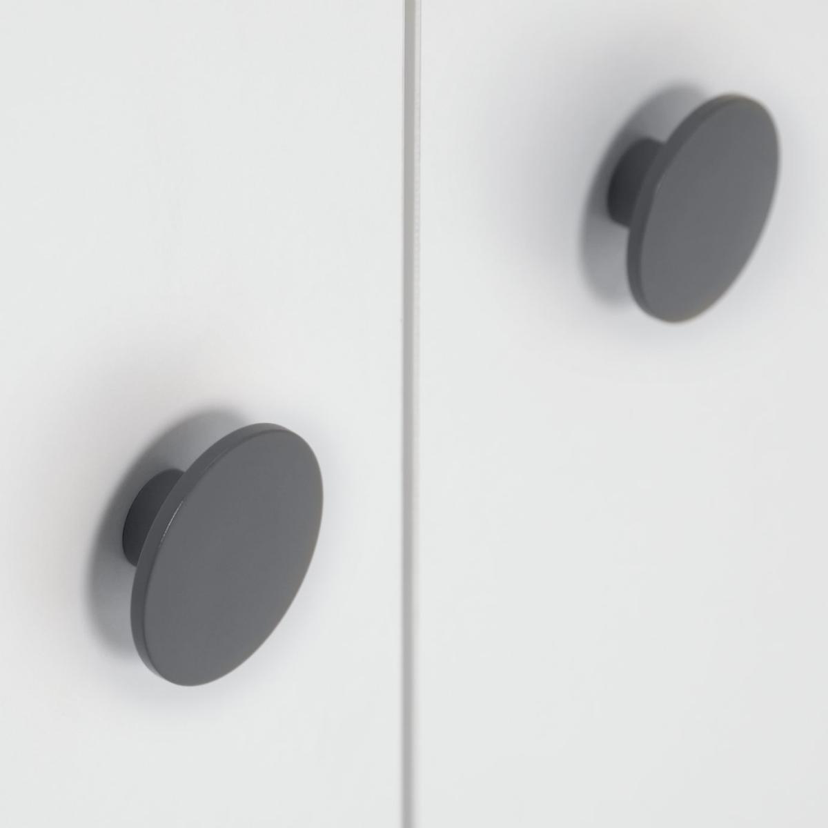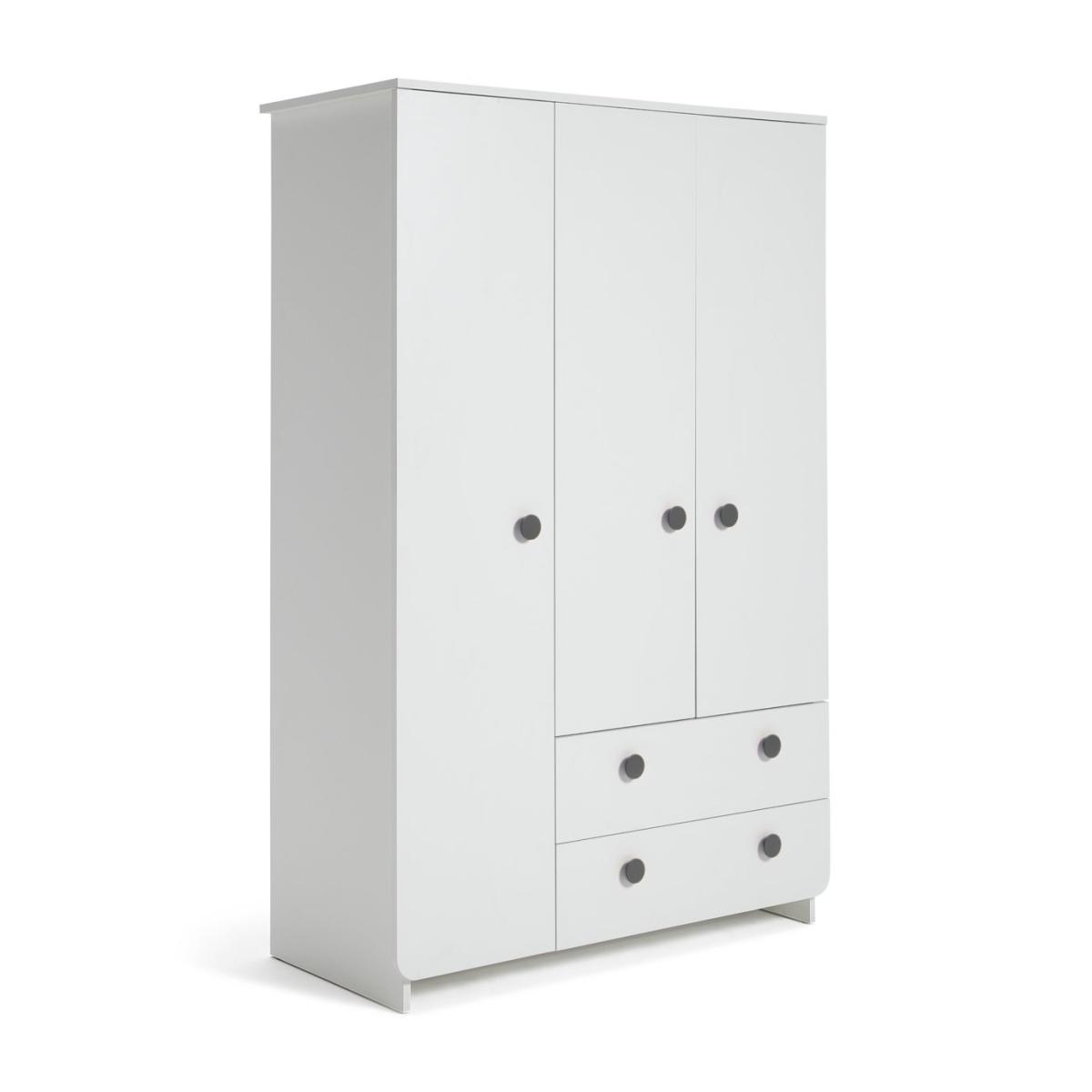 Our 3 door kids' wardrobe is a champion at tackling clutter. In fresh white with deep grey handles, it's a classic option that brings a contemporary touch. And it offers plenty of ways to get organized. Hang tops, bottoms, jackets and coats on the fixed hanging rail. Smalls and socks go in the 2 wide easy glide drawers. And fold away t-shirts, jumpers and pop them on the deep shelves. And there's still room for shoes and a favourite toy or two. Smart storage galore. It's a yes from us.