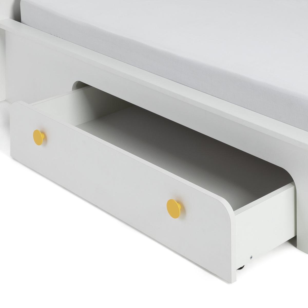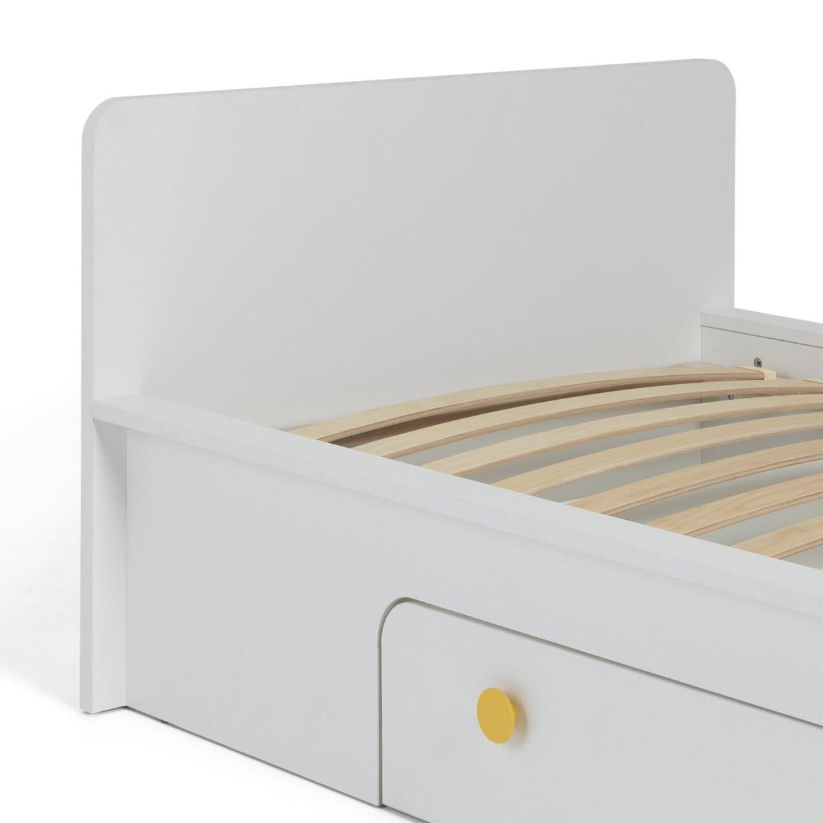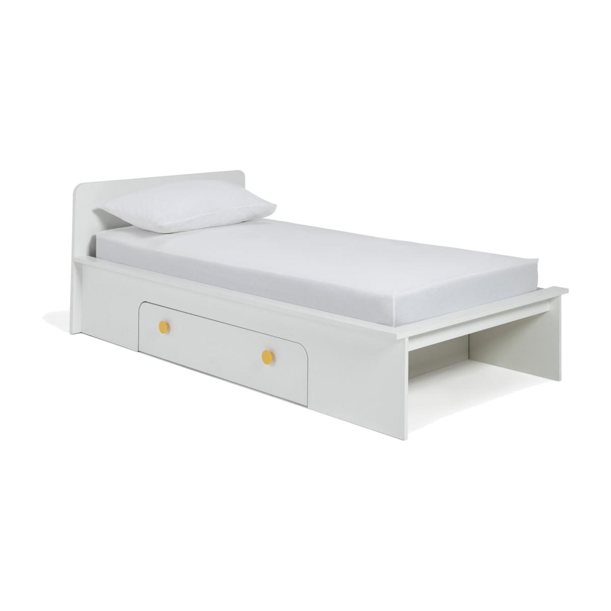 Sweet dreams. There are many reasons why Rudi's a top-notch bed. A looker for sure with smooth lines, a modern design and smart yellow handles. Pull open the generous side drawer and tuck away clothes, books and more. Pop shoes and toys in the extra storage space at the foot of the bed. Neat. Made of solid wood, it's robust and made to last. Still counting the plus points?