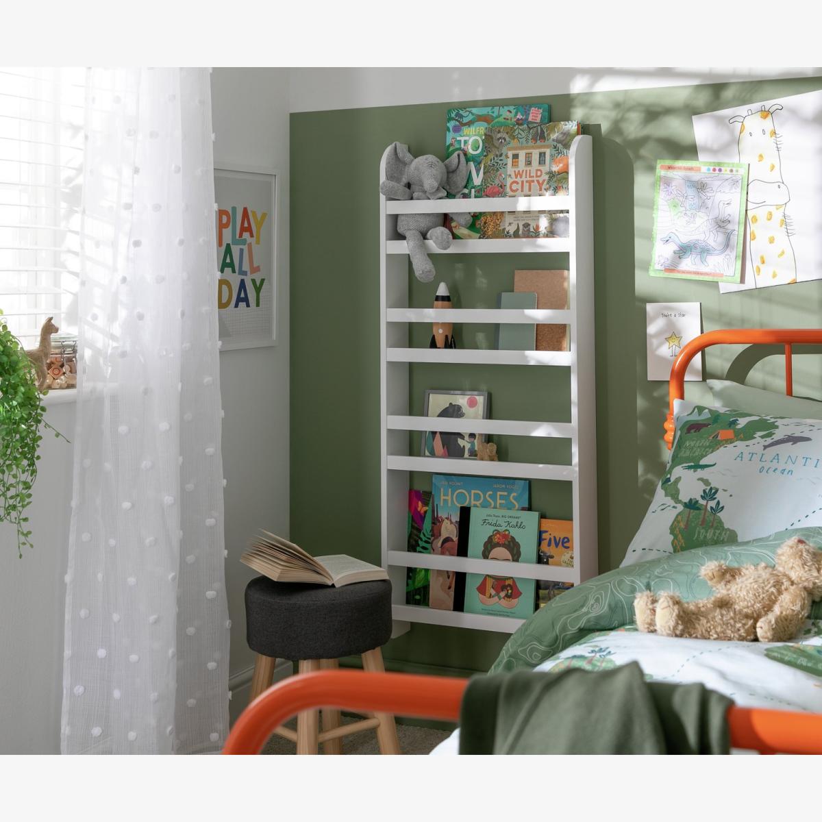 Read all about it. Youngsters will love finding and tucking away their favourite books in our wall-mounted bookcase. With 4 shelves designed to show off colourful covers, it's super easy to pick and choose. Great for freeing up floor space in their bedroom or playroom, too. And in fresh white, the simple Scandi-style design will look good with bold or neutral spaces. Story time, sorted. Part of the Scandinavia collection. Made from MDF with a painted finish. Collect in store today. 4 fixed shelves. Self-assembly - 1 person recommended. If this product is over 60cm high it must be securely attached to the wall to prevent overturning (fixings included). Dimensions: Size H118, W50, D12cm. Weight 6.39kg. Wall fixing recommended. Shelves range from 47cm wide (narrowest) to47 cm wide (widest)Recommended maximum load per shelf: 3kg. Package dimensions: Package 1 dimensions: H10, W125.5, D18.5cm. Package 1 weight: 7.13kg. General Information: We are excited to be welcoming some of our favourite HOME products into the Habitat range. Your product may arrive in Habitat or HOME packaging.