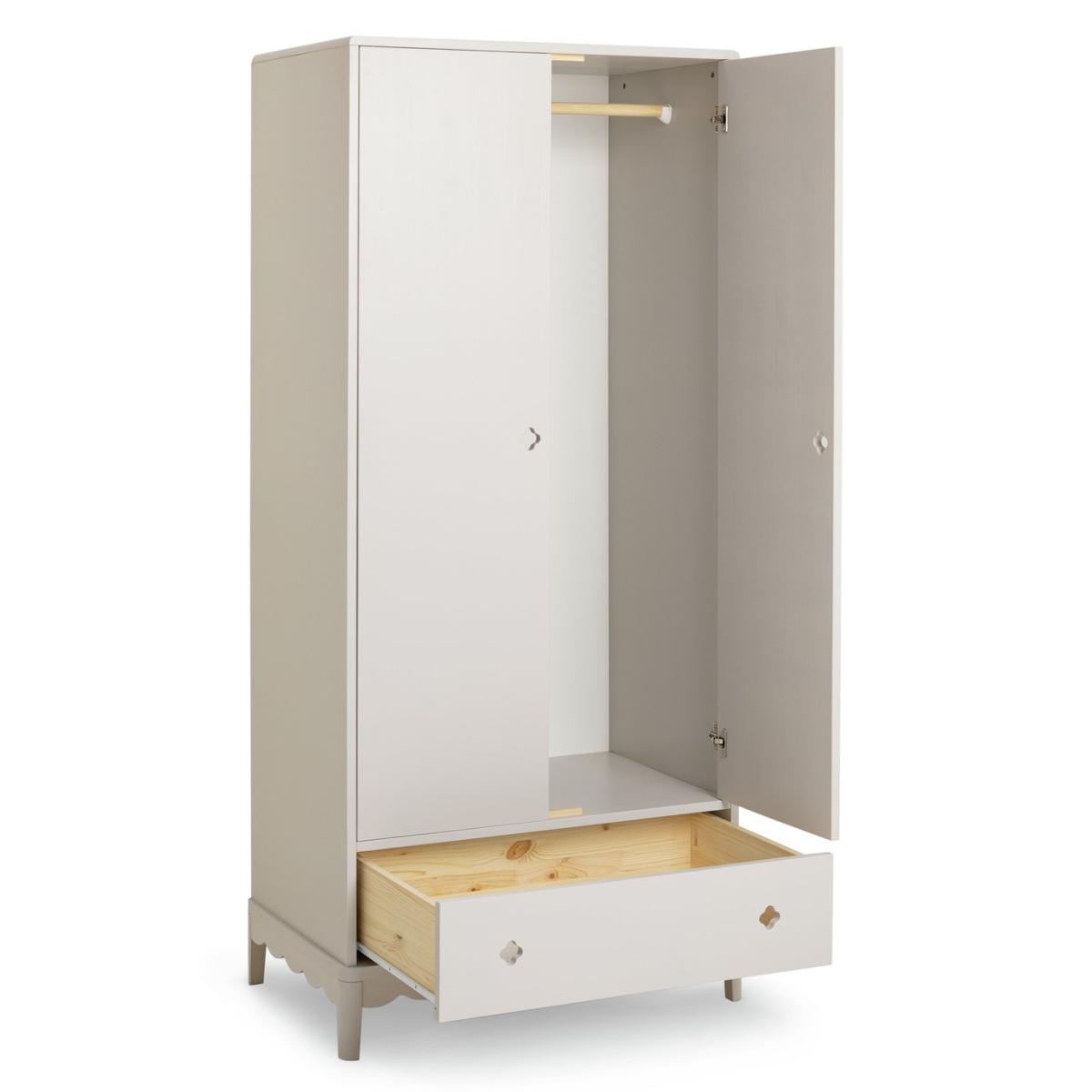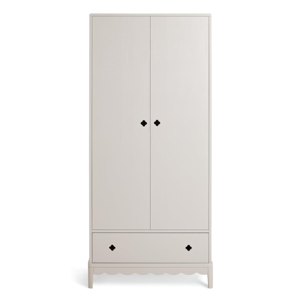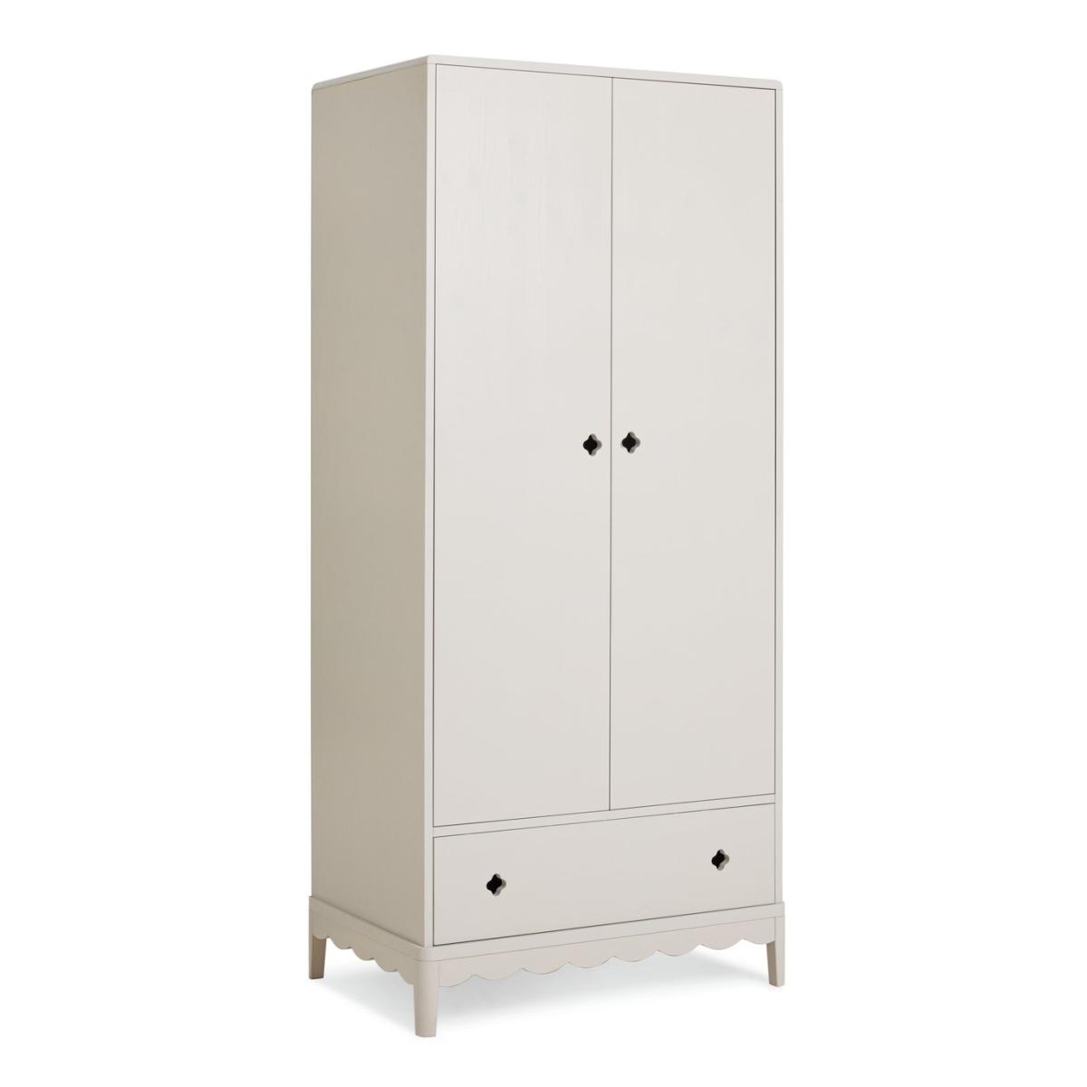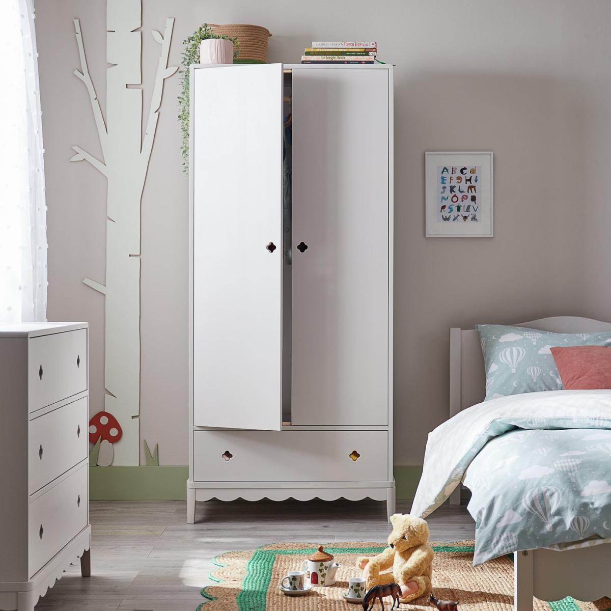 Turn a bedroom into a palace with this princess-pretty Serena 2 door wardrobe. Gently scalloped edging and 4-leaf clover cut away handles are delightfully dreamy features. Carefully curated to meet storage needs. There's a fixed rail for short or long clothes plus a lower drawer for socks and smalls. Fab furniture indeed. Part of the Serena collection. Made of solid wood and MDF. Additional handles not included. 2 doors. 1 drawer with metal runners. 1 fixed hanging rail. 1 fixed shelf. Self-assembly - 2 people recommended (includes wall fixings). If this product is over 60cm high it must be securely attached to the wall to prevent overturning. Dimensions: Size H180, W82, D52cm. Internal hanging space H132, W80, D50cm. Internal drawer H15.7, W70.7, D40cm. Weight 40kg. Package Dimensions: Package 1 dimensions: H165, W51.3, D8.6cm. Package 1 weight: 26kg. Package 2 dimensions: H84.3, W54.5, D9.2cm. Package 2 weight: 15.5kg. FSC certified meaning the materials used for this product are responsibly sourced. General information: We are excited to be welcoming some of our favourite HOME products into the Habitat range. Your product may arrive in Habitat or HOME packaging. Manufacturer's 2 years guarantee.