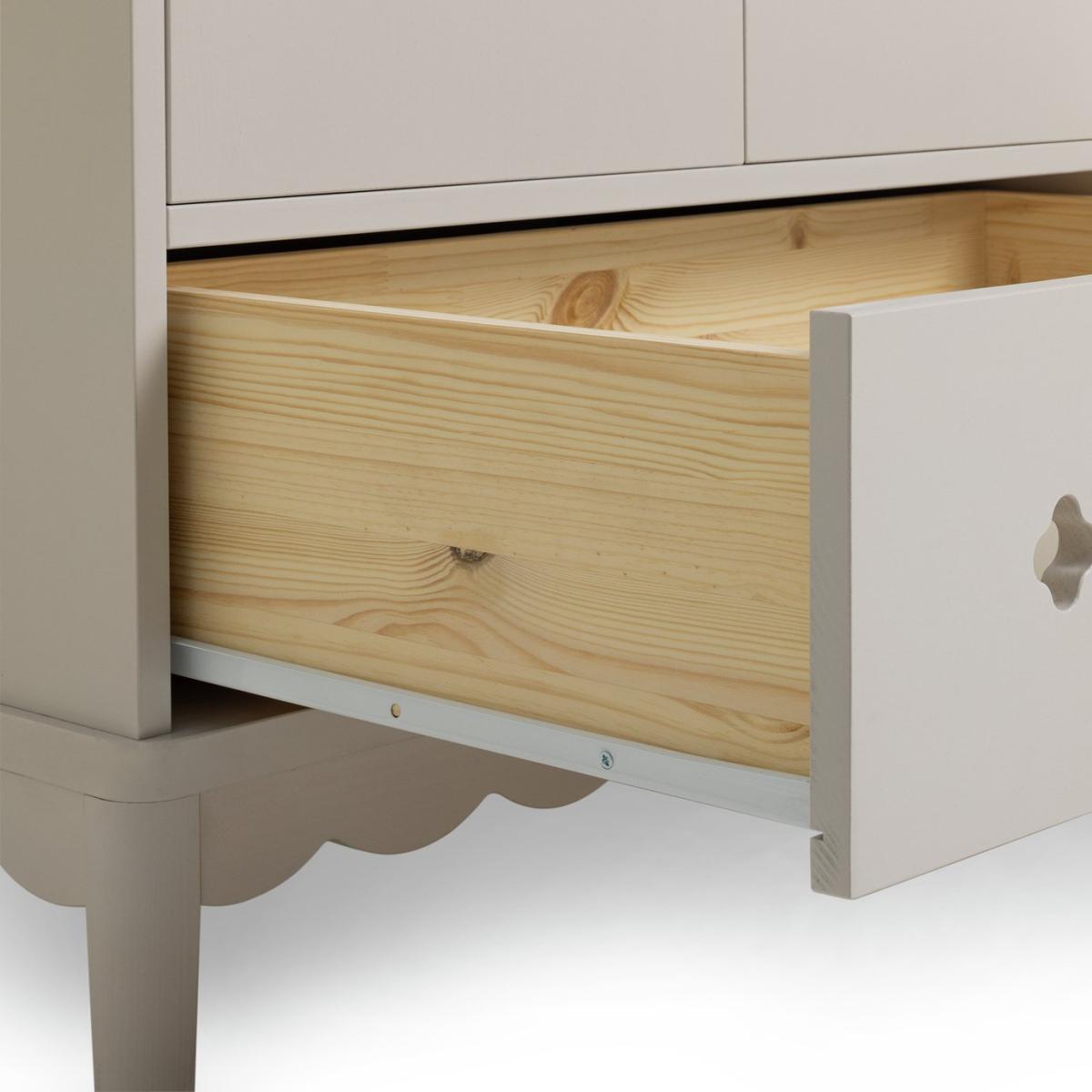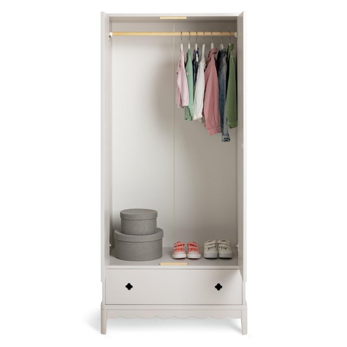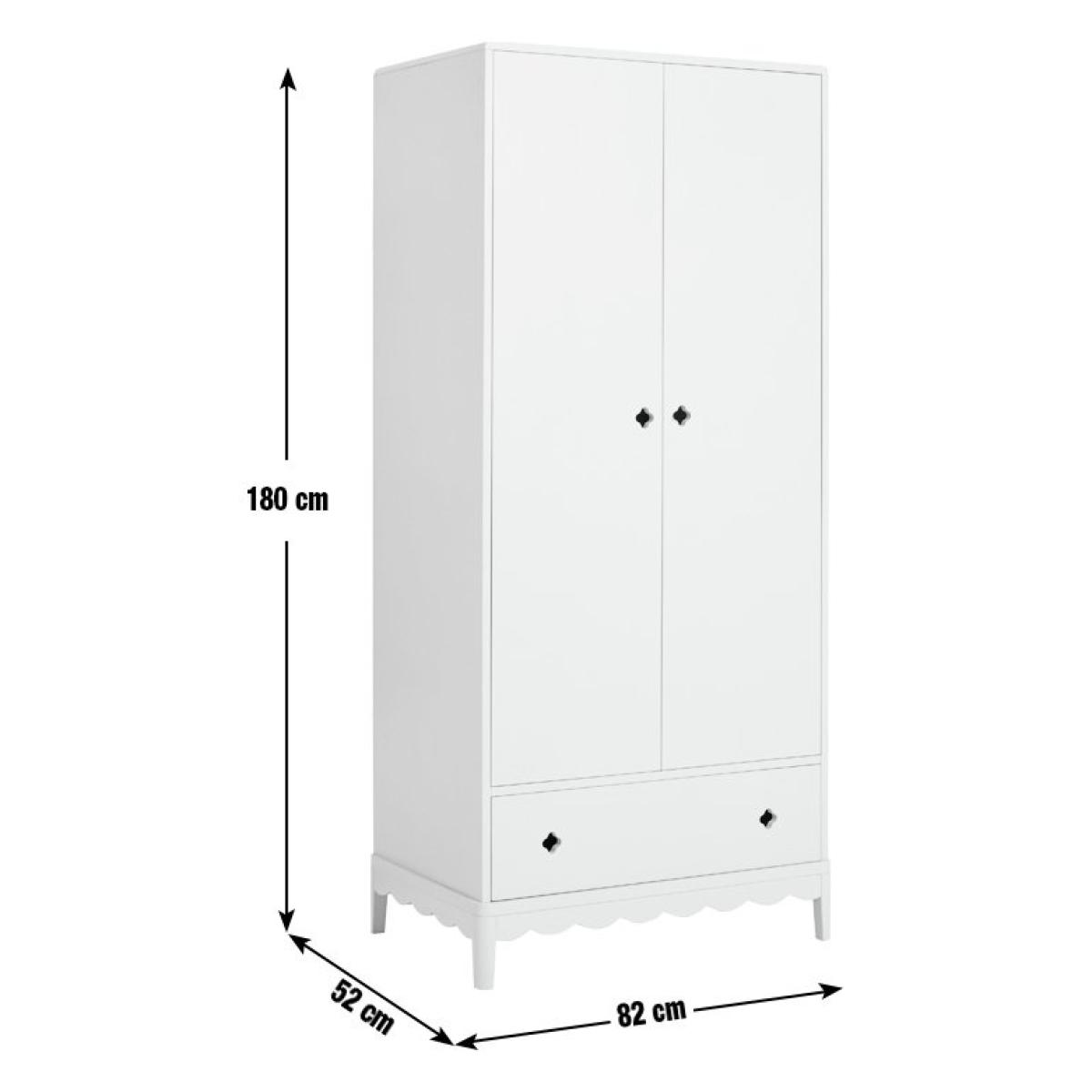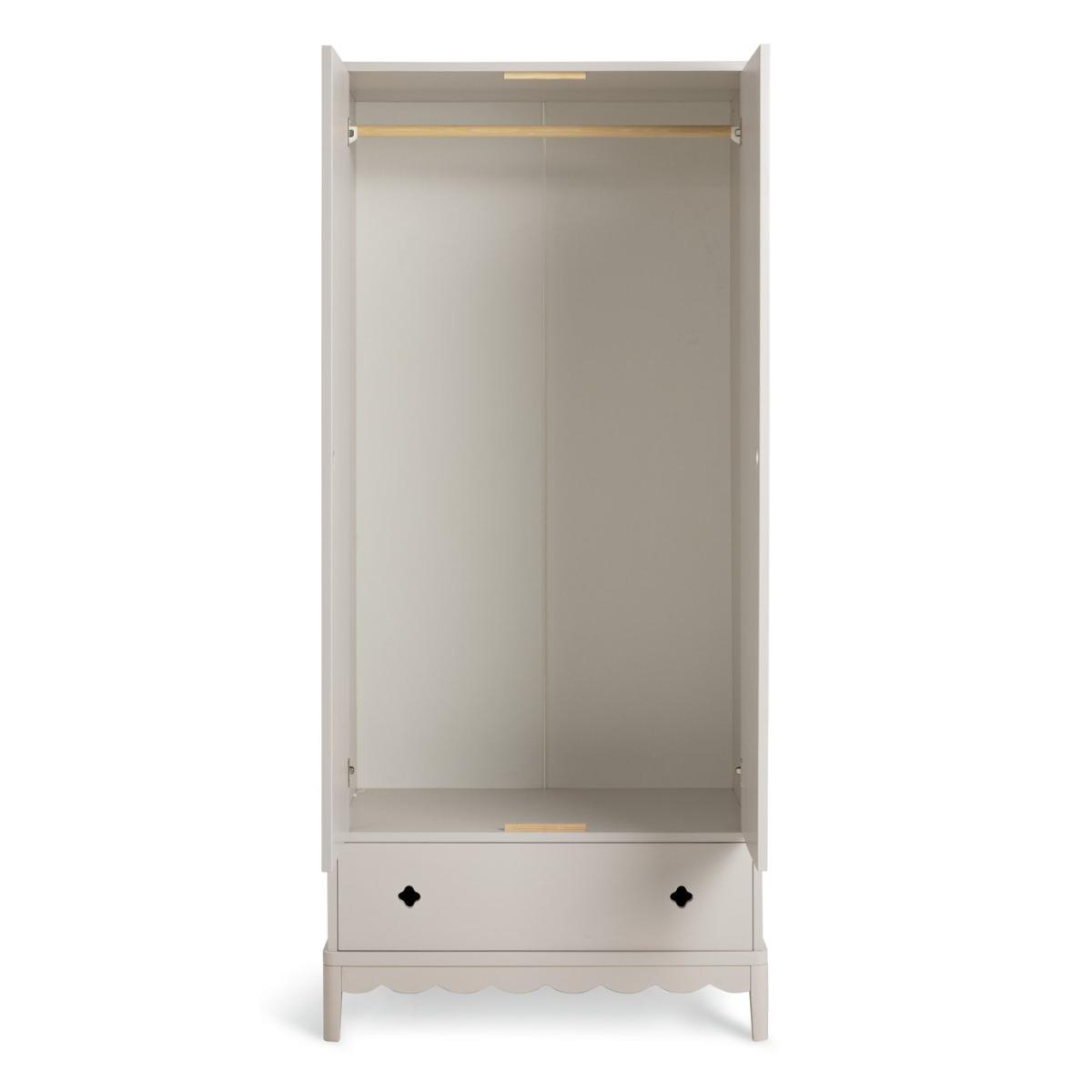 Turn a bedroom into a palace with this princess-pretty Serena 2 door wardrobe. Gently scalloped edging and 4-leaf clover cut away handles are delightfully dreamy features. Carefully curated to meet storage needs. There's a fixed rail for short or long clothes plus a lower drawer for socks and smalls. Fab furniture indeed. Part of the Serena collection. Made of solid wood and MDF. Additional handles not included. 2 doors. 1 drawer with metal runners. 1 fixed hanging rail. 1 fixed shelf. Self-assembly - 2 people recommended (includes wall fixings). If this product is over 60cm high it must be securely attached to the wall to prevent overturning. Dimensions: Size H180, W82, D52cm. Internal hanging space H132, W80, D50cm. Internal drawer H15.7, W70.7, D40cm. Weight 40kg. Package Dimensions: Package 1 dimensions: H165, W51.3, D8.6cm. Package 1 weight: 26kg. Package 2 dimensions: H84.3, W54.5, D9.2cm. Package 2 weight: 15.5kg. FSC certified meaning the materials used for this product are responsibly sourced. General information: We are excited to be welcoming some of our favourite HOME products into the Habitat range. Your product may arrive in Habitat or HOME packaging. Manufacturer's 2 years guarantee.
