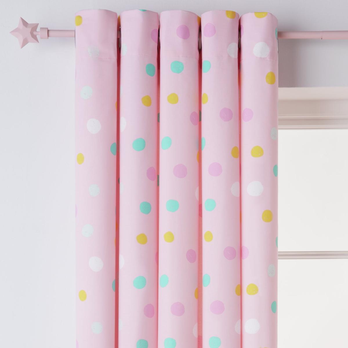 The perfect finishing touch to your little one's room, these spotty curtains will add a pop of pink and splash of colour and liven the place up. Cute and colourful, they're lined for privacy and to help your little one sleep. And, if disaster strikes, you can even pop these curtains in the washing machine and tumble dryer at a low temperature. Pink Spots Design. Silver Stainless Steel Eyelets. Features. Fully lined. Made from 52% polyester and 48% cotton. Lined. Lining made from 52% polyester and 48% cotton. Dimensions Size 168cm (66 inches) wide by 137cm (54 inches) drop. Dimensions provided include header tape. Width refers to one curtain panel before hanging. / 4cm. Eyelet diameter: 6cm. General information. Contains one pair of curtains. Number of eyelets per curtain: 10. Suitable for curtain poles. Curtain pole not included. Machine washable at low temperature. Suitable for tumble drying. General Information: We are excited to be welcoming some of our favourite HOME products into the Habitat range. Your product may arrive in Habitat or HOME packaging.