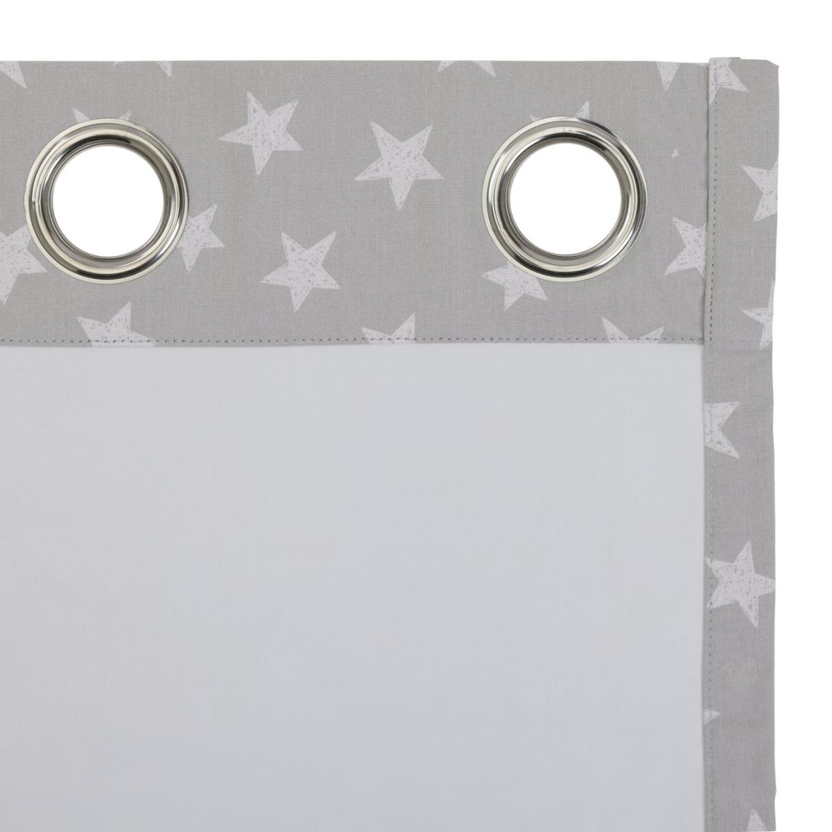 Let the kids sleep in longer on bright early mornings with this pair of blackout curtains. The grey and white star design is perfect for starry nights and sweet dreams. Our 4cm steel eyelets swish straight onto your curtain pole. Easy. Grey Star Design. Silver Steel Eyelets. Features Made from 52% polyester and 48% cotton. Unlined. Dimensions Size 168cm (66 inches) wide by 137cm (54 inches) drop. Dimensions provided include header tape. Eyelet diameter: 4cm. General information Contains one pair of curtains. Suitable for curtain poles. Machine washable.