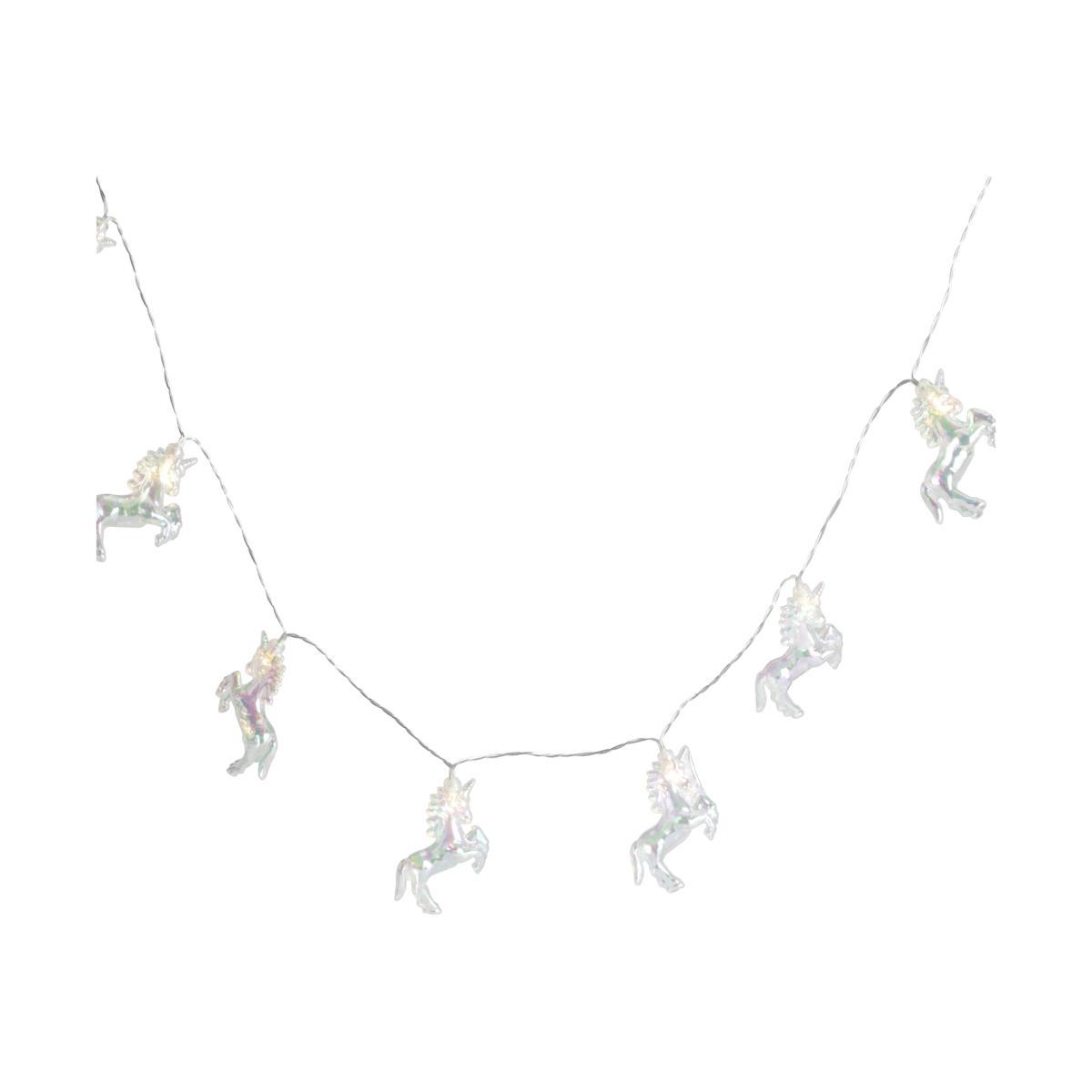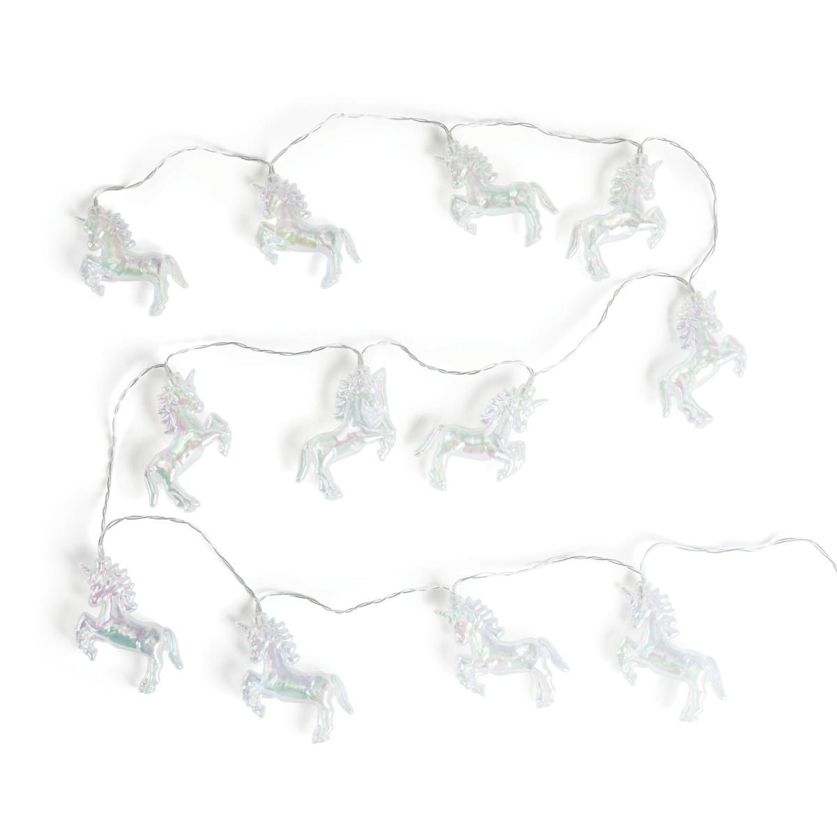 Let's make magic. Crafted from iridescent coloured plastic, these 12 unicorn string lights add a fairy tale feel to your child's room. Softly glowing they bring an instant bewitching atmosphere. Battery operated, so they're happy to go anywhere. Drape these mystical creatures over a window, mirror, or across a headboard. Enchanting.