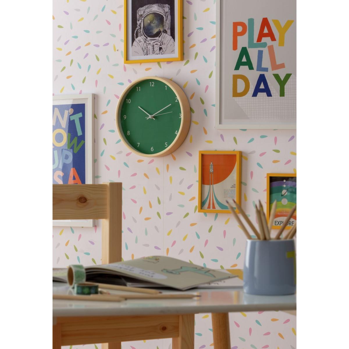 Tick tock, what's the time? Our classic green wall clock is a super handy addition to your youngster's bedroom wall. The bold clock face and quartz movement means it's easy to read, precise and accurate. Great for encouraging kids to learn to tell the time the traditional way. Just pop in a battery and away you go. Playtime for just 5 more minutes? Oh, go on then. Get creative with your decor. Find more fun pieces in our Kids Imaginarium collection.