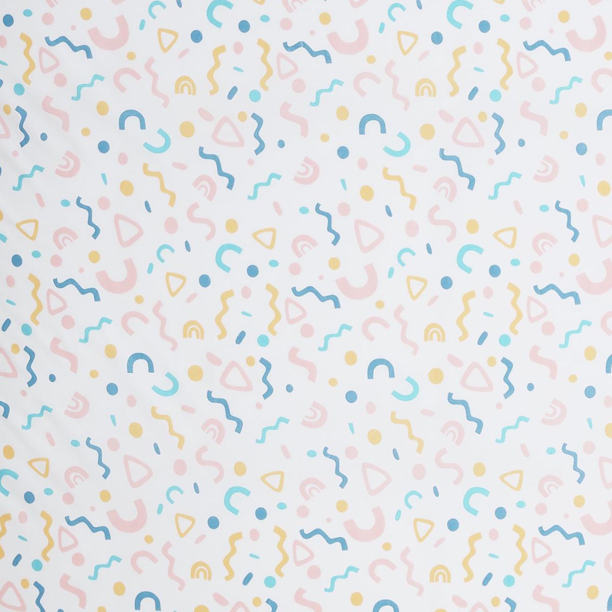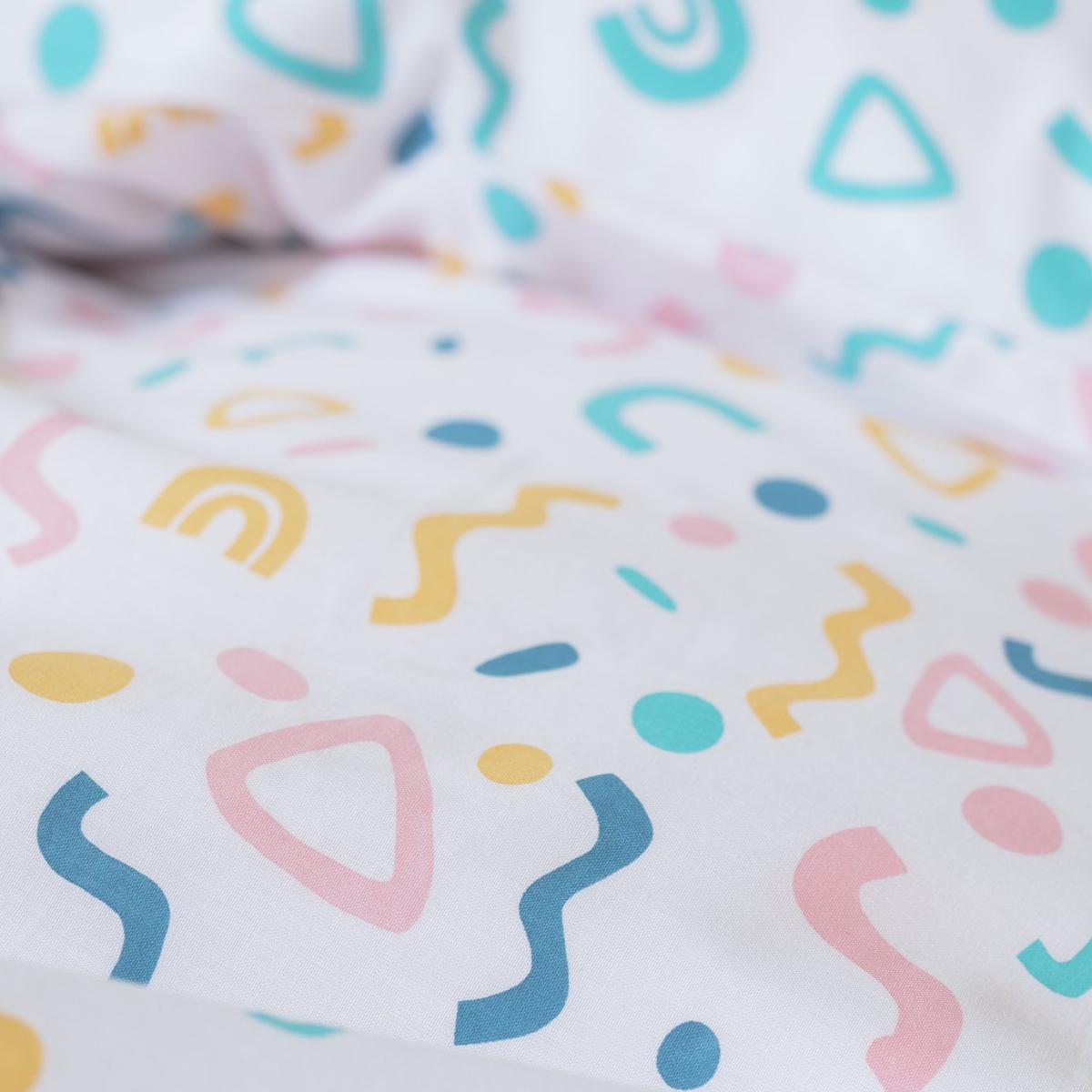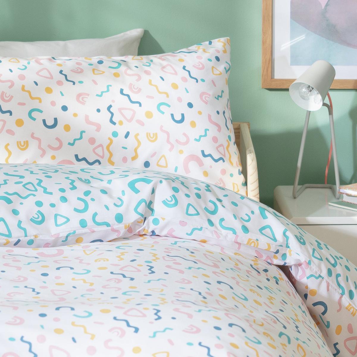 Patterned and playful. We've combined squiggles, triangles, dots and dashes to create a fabulous riot of colour on this cheerful toddler duvet set. Made from a comfy poly-cotton blend, you'll have no problem nodding off with a big smile on your face. Want to tone it down? Just flip the duvet over for a simple turquoise and white version. Kids will love this bright, bold design. It's a fab choice for a cheery guest bedroom too.