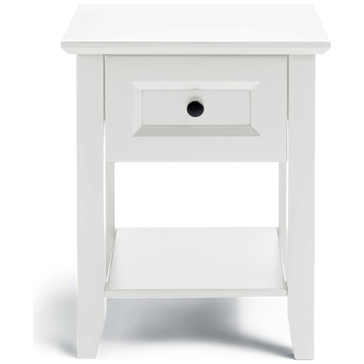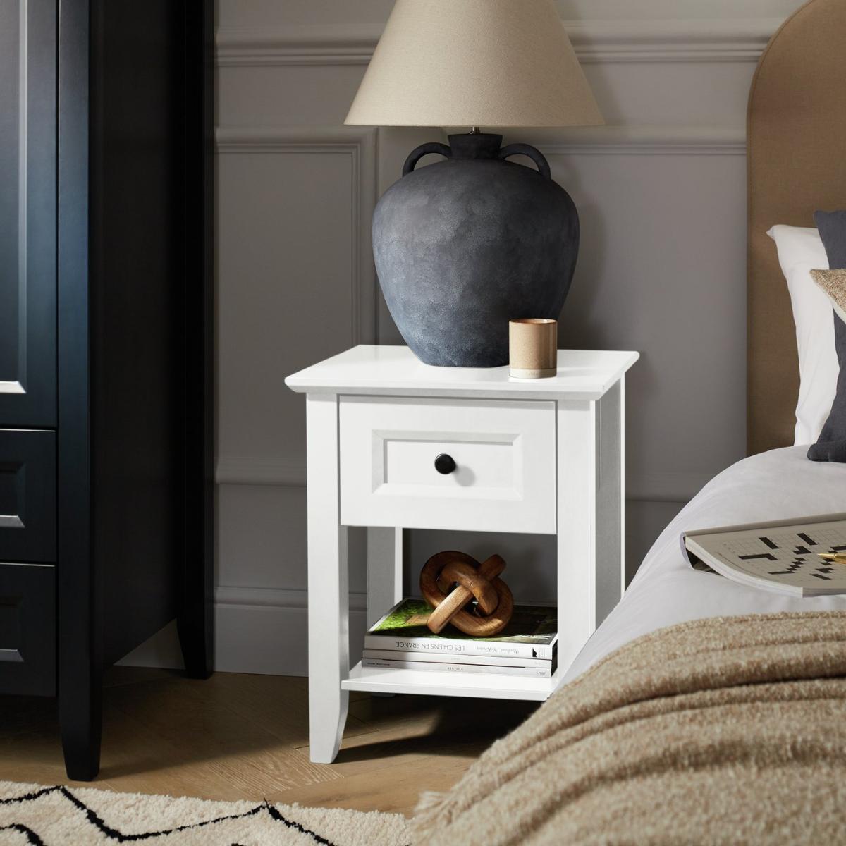 Wake up to Kingham, our pine bedside table that's designed to please. Pop a lamp on top, book on the bottom shelf and tuck away bedtime essentials in the easy glide draw. With an ivory painted finish, panelled front and traditional round metal handles, Kingham is very country modern, cool. Get curated with Kingham and take the style to the max. Part of the Kingham collection. Made of MDF and pine. Metal handles. Additional handles not included. 1 drawer with wooden runners. Packed flat - 1 person recommended. Dimensions: Size H58.5, W48, D40cm. Internal drawer H12.5, W27.5, D33cm. Handle size: L3, W2cm. Weight 25kg. Package Dimensions: Package 1 dimensions: H19.5, W64, D48cm. Package 1 weight: 26kg. General information: We are excited to be welcoming some of our favourite HOME products into the Habitat range. Your product may arrive in Habitat or HOME packaging. FSC certified meaning the materials used for this product are responsibly sourced. Manufacturer's 1 year guarantee.