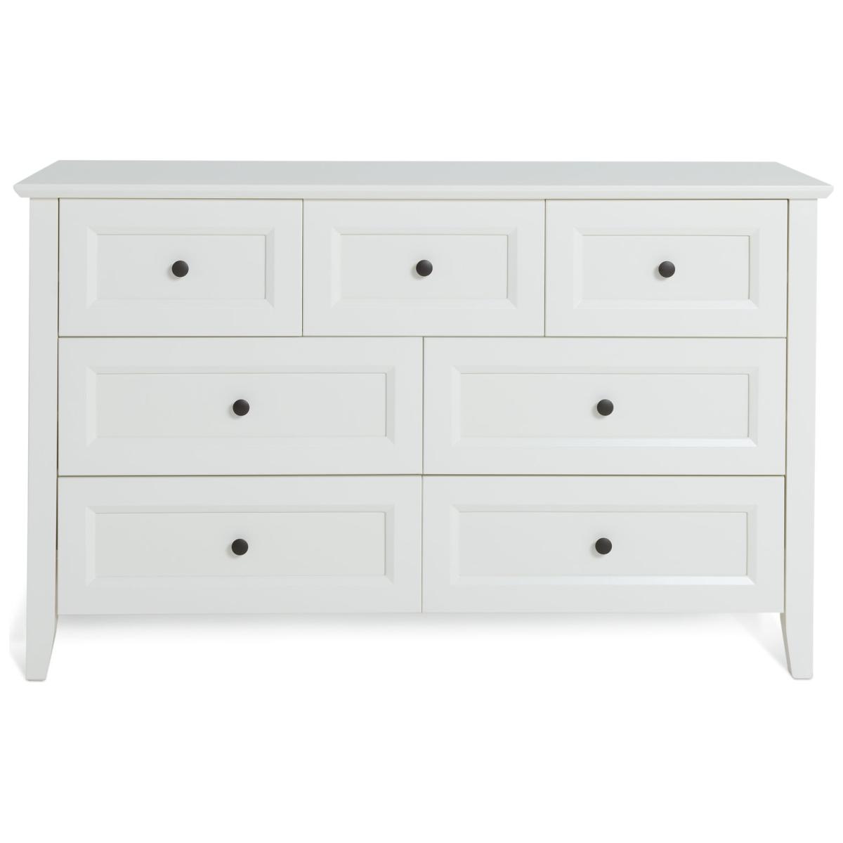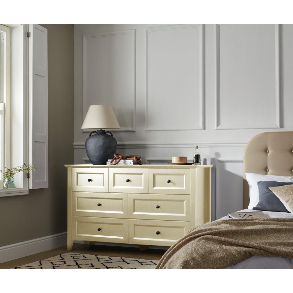 Keep in touch with Kingham, our pine chest of drawers that's designed to please. There's plenty of space for foldables and accessories? In fact, there's 7 deep drawers. And all glide smoothly on metal runners. With an ivory painted finish, paneled front and traditional round metal handles, Kingham is very country modern, cool. Make a bedroom statement by dressing the top with a mirror, and some fuss free faux foliage. Get curated with Kingham and take the style to the max. Part of the Kingham collection. Made of MDF and pine. Metal handles. Additional handles not included. 7 drawers with wooden runners. Packed flat - 2 people recommended (includes wall fixings). If this product is over 60cm high it must be securely attached to the wall to prevent overturning. Dimensions: Size H88.5, W145, D51cm. Internal drawer H15, W37.5, D33cm. Large internal drawer H12.5, W57.2, D33cm. Handle size: L2, W3cm. Weight 69kg. Package Dimensions: Package 1 dimensions: H29.5, W151, D58,. Package 1 weight: 72kg. FSC certified meaning the materials used for this product are responsibly sourced. General information: We are excited to be welcoming some of our favourite HOME products into the Habitat range. Your product may arrive in Habitat or HOME packaging. Manufacturer's 1 year guarantee.