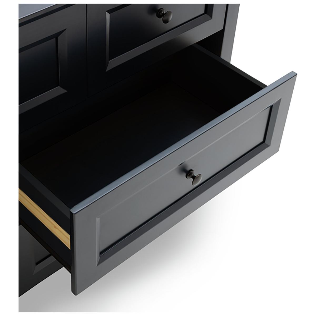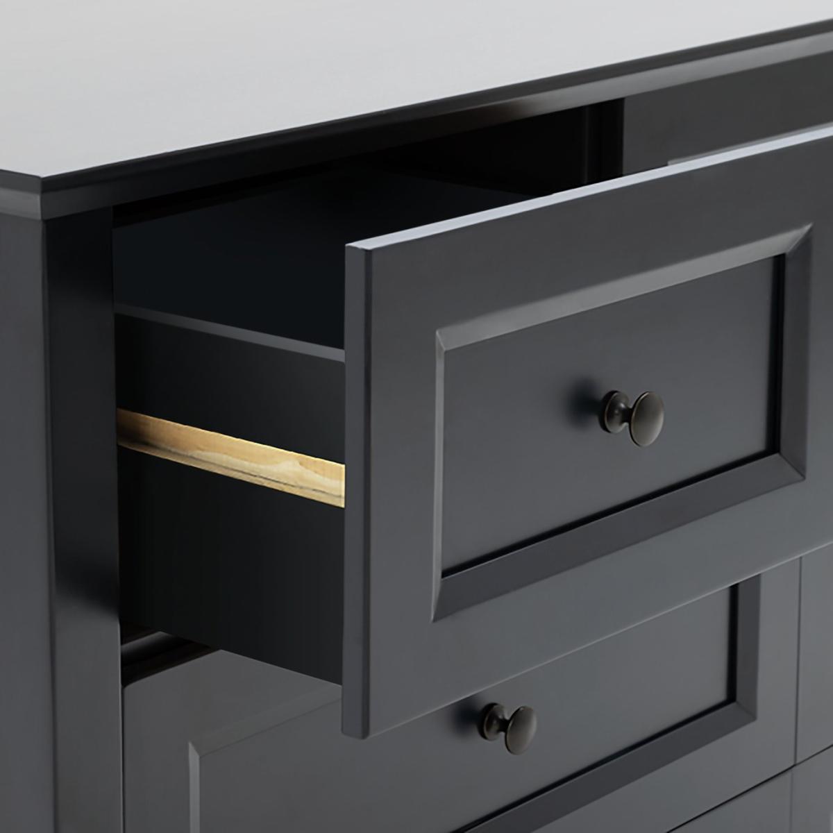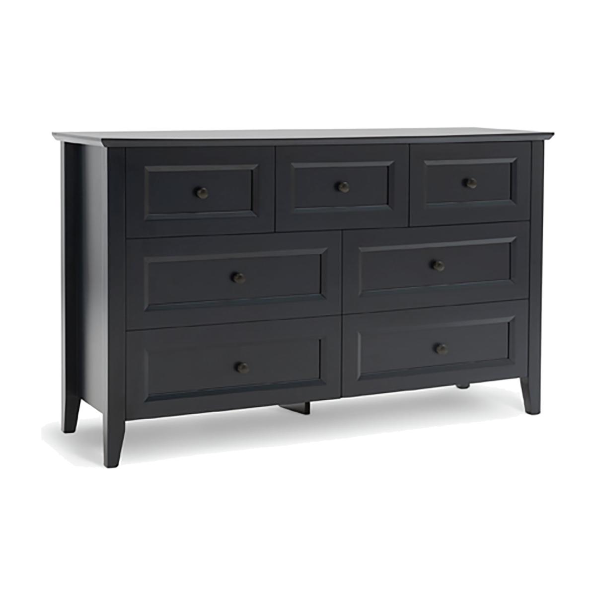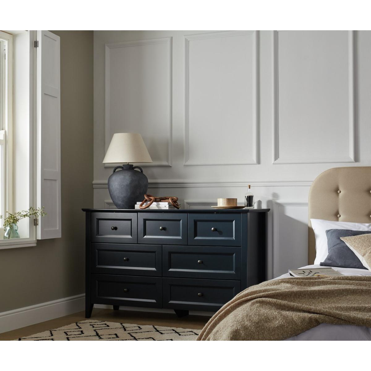 Keep in touch with Kingham, our pine chest of drawers that's designed to please. There's plenty of space for foldables and accessories? In fact, there's 7 deep drawers. And all glide smoothly on metal runners. With a dark blue painted finish, paneled front and traditional round metal handles, Kingham is very country modern, cool. Make a bedroom statement by dressing the top with a mirror, and some fuss free faux foliage. Get curated with Kingham and take the style to the max. Part of the Kingham collection. Made of MDF and pine. Metal handles. Additional handles not included. 7 drawers with wooden runners. Packed flat - 2 people recommended (includes wall fixings). If this product is over 60cm high it must be securely attached to the wall to prevent overturning. Dimensions: Size H88.5, W145, D51cm. Internal drawer H15, W37.5, D33cm. Large internal drawer H12.5, W57.2, D33cm. Handle size: L2, W3cm. Weight 69kg. Package Dimensions: Package 1 dimensions: H29.5, W151, D58,. Package 1 weight: 72kg. FSC certified meaning the materials used for this product are responsibly sourced. General information: We are excited to be welcoming some of our favourite HOME products into the Habitat range. Your product may arrive in Habitat or HOME packaging. Manufacturer's 1 year guarantee.