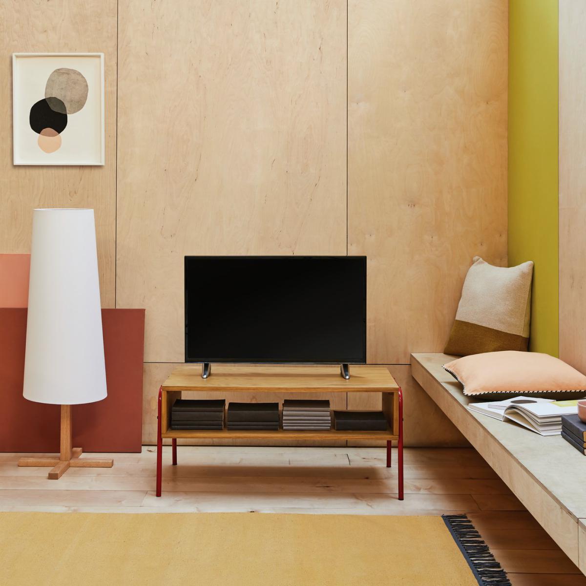 The Kirby oak veneer and red gloss TV stand was created in the Habitat design studio with a subtle nod to the 80s.