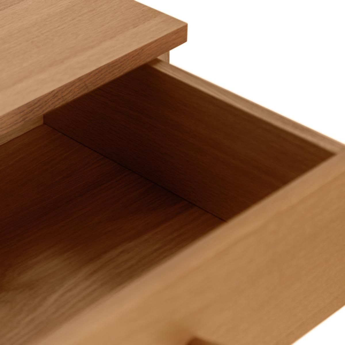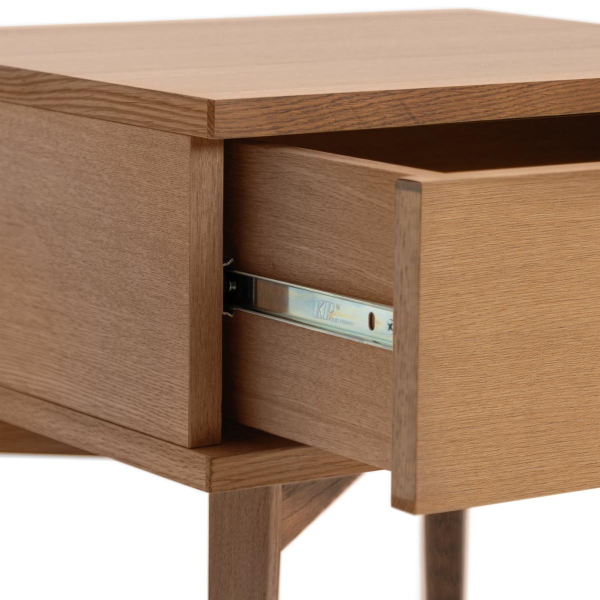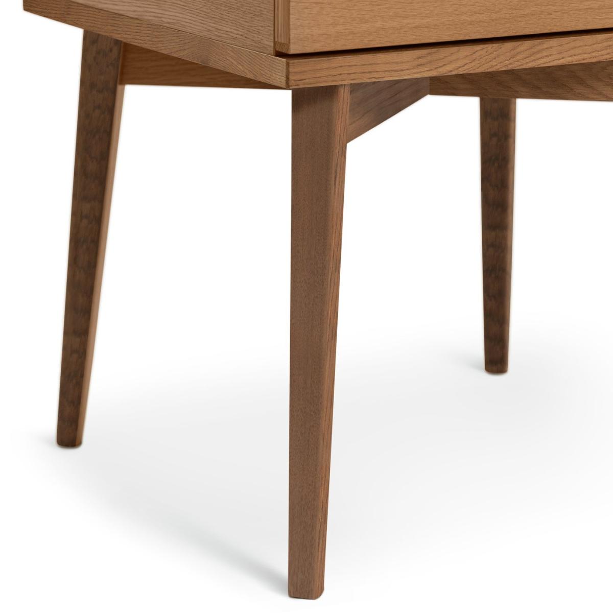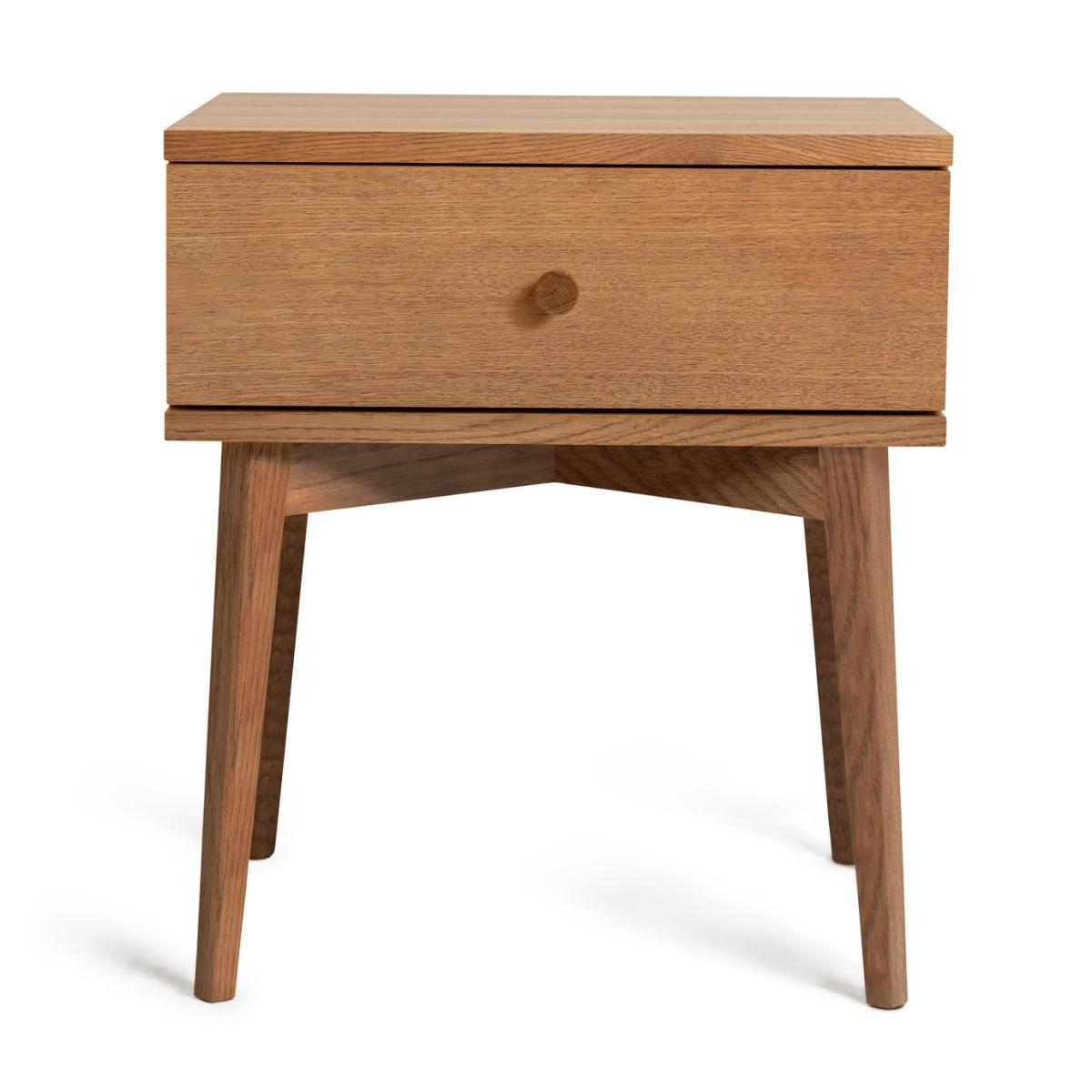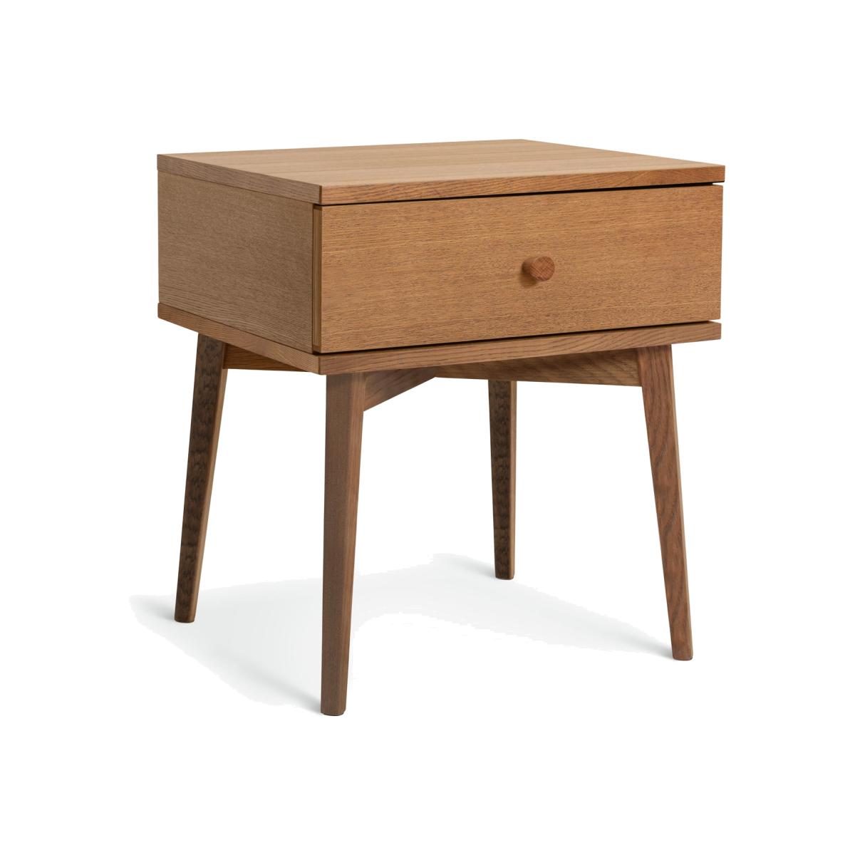 Solid option. Our Kirk 1drawer bedside table is made for bedroom bliss. Easy to reach storage and plenty of it. A deep, easy glide drawer will swallow up everything from phone chargers to remotes, lip balm to specs or contact lenses. Space on top offers room for lamps, water, page turners or Kindles. 100% walnut, with an attractive natural grain and a splayed leg frame, in our opinion it's a must have.